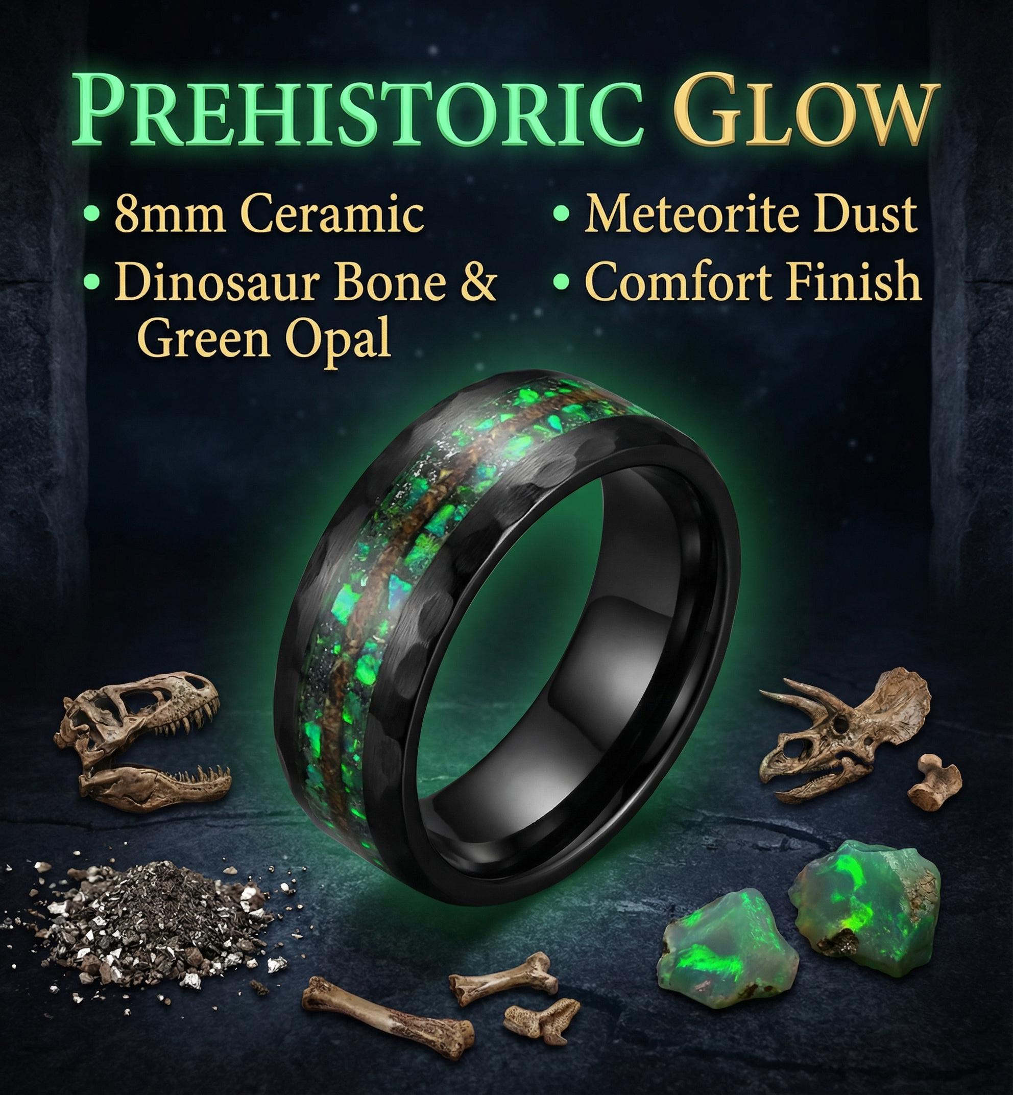 If green is your color then you will love this ring. The Kiwi green opal sparkles very subtly and contrasts beautifully with the line of dinosaur bone.