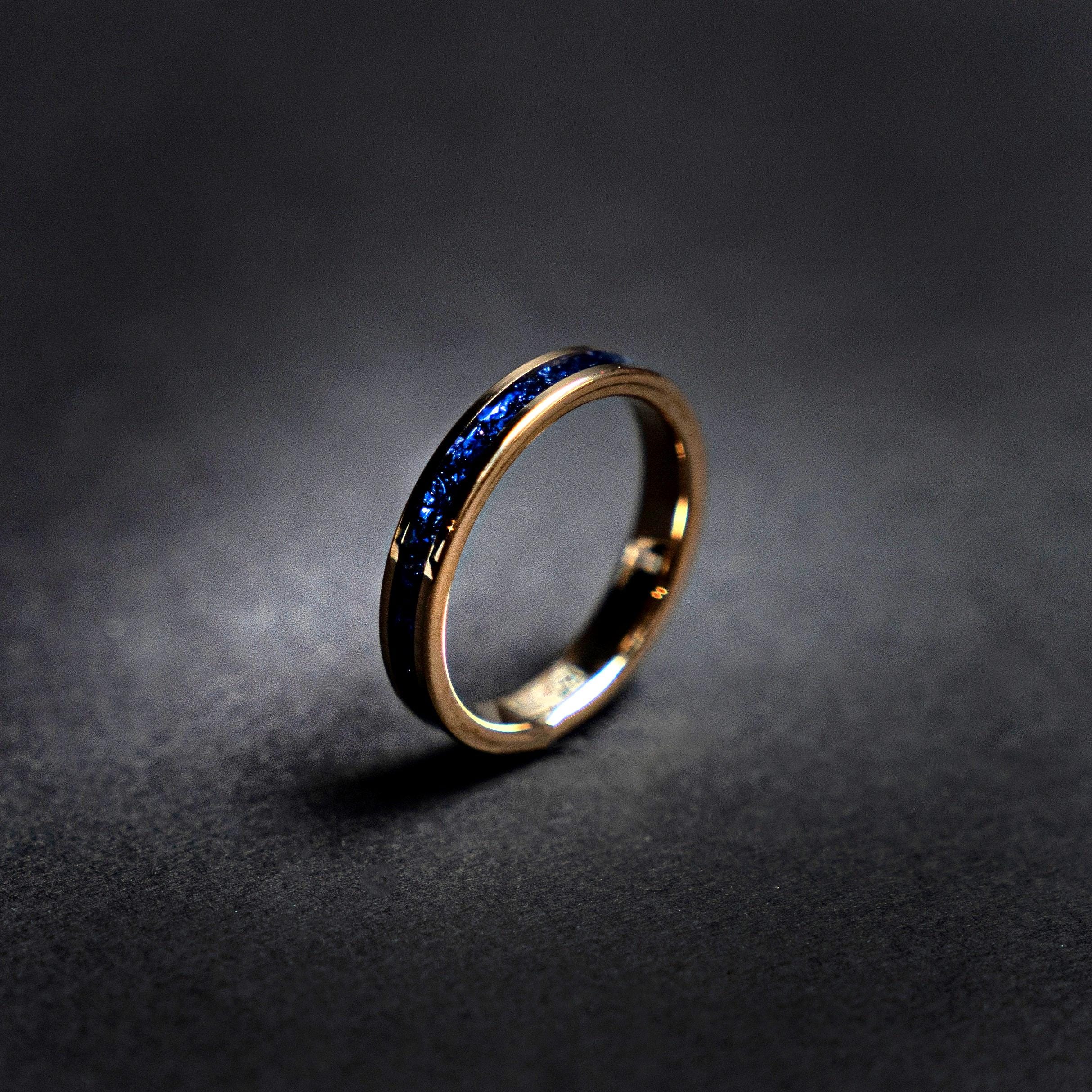 Rose Gold Tungsten Wedding Band 4mm – Blue Galaxy Opal Inlay Ring – Minimal Women’s Wedding Band – Comfort Fit – Stackable Band