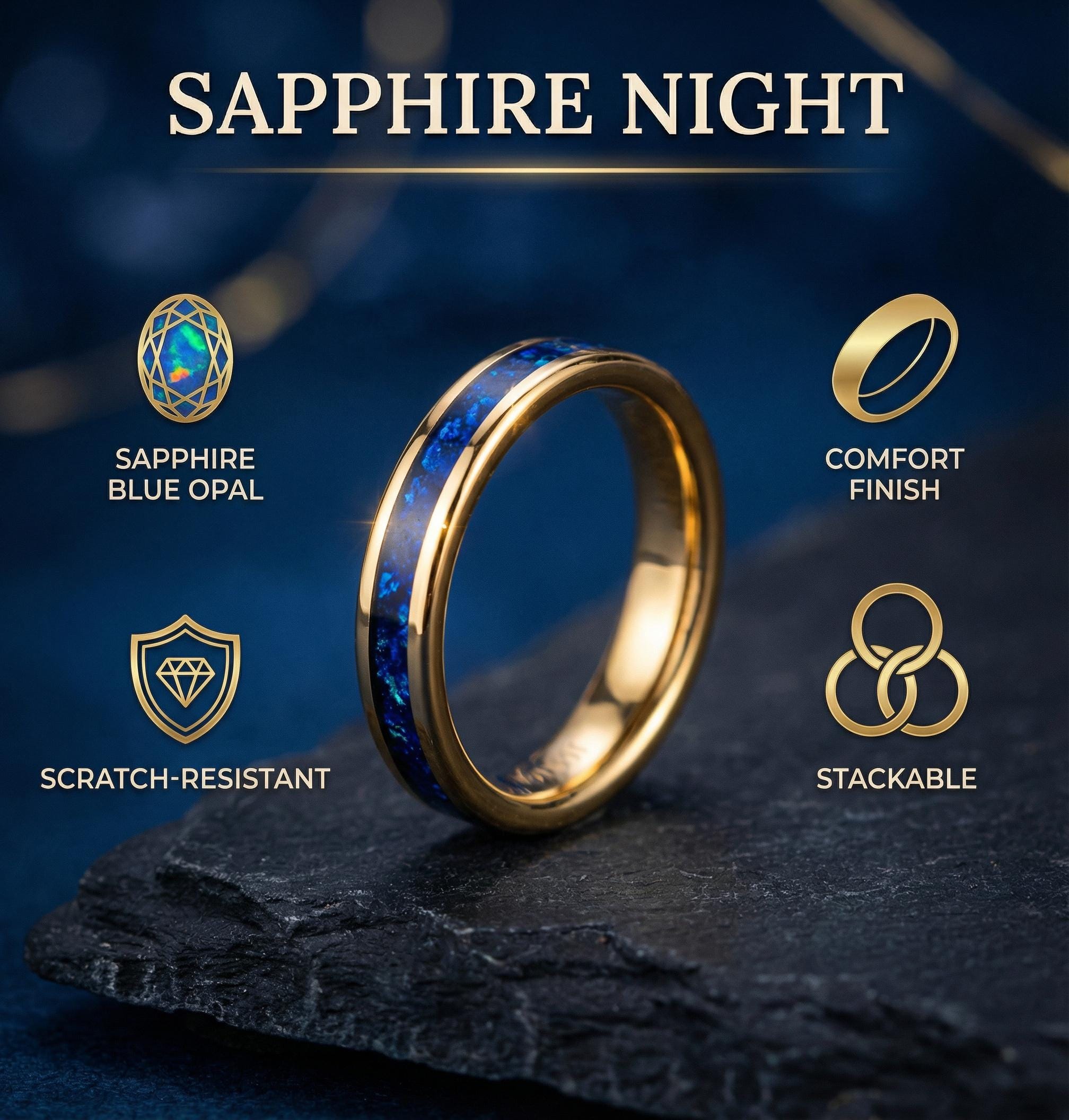 Tungsten 4mm Rose Gold Ring Blue Sapphire opal Wedding Band, Womens Ring, Womens Wedding Band | Decazi
