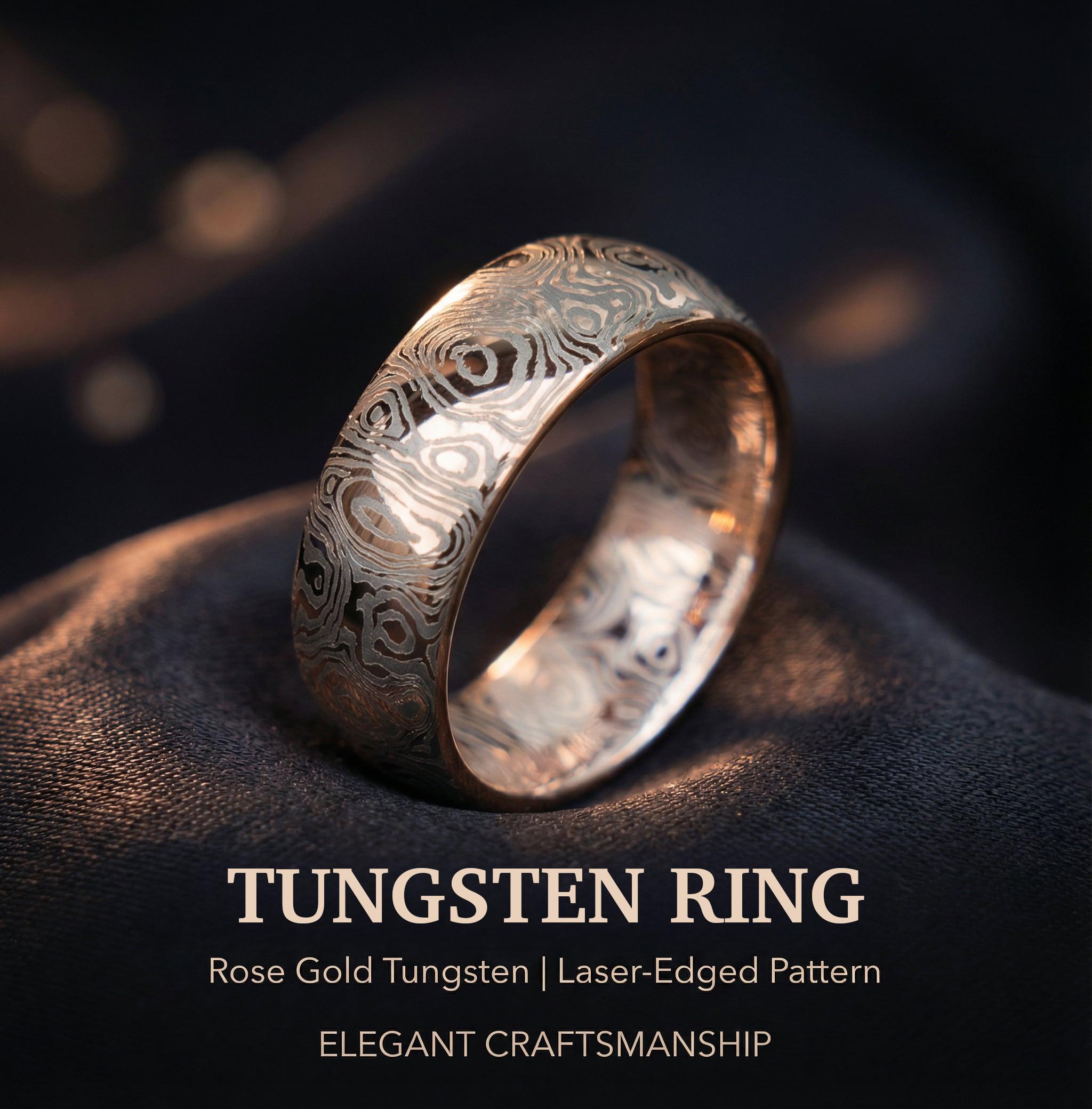 Rose Gold Tungsten Ring with laser edges damascus pattern, rose gold Wedding Band, Mens Wedding Ring, Men's Ring, Promise Ring | Decazi