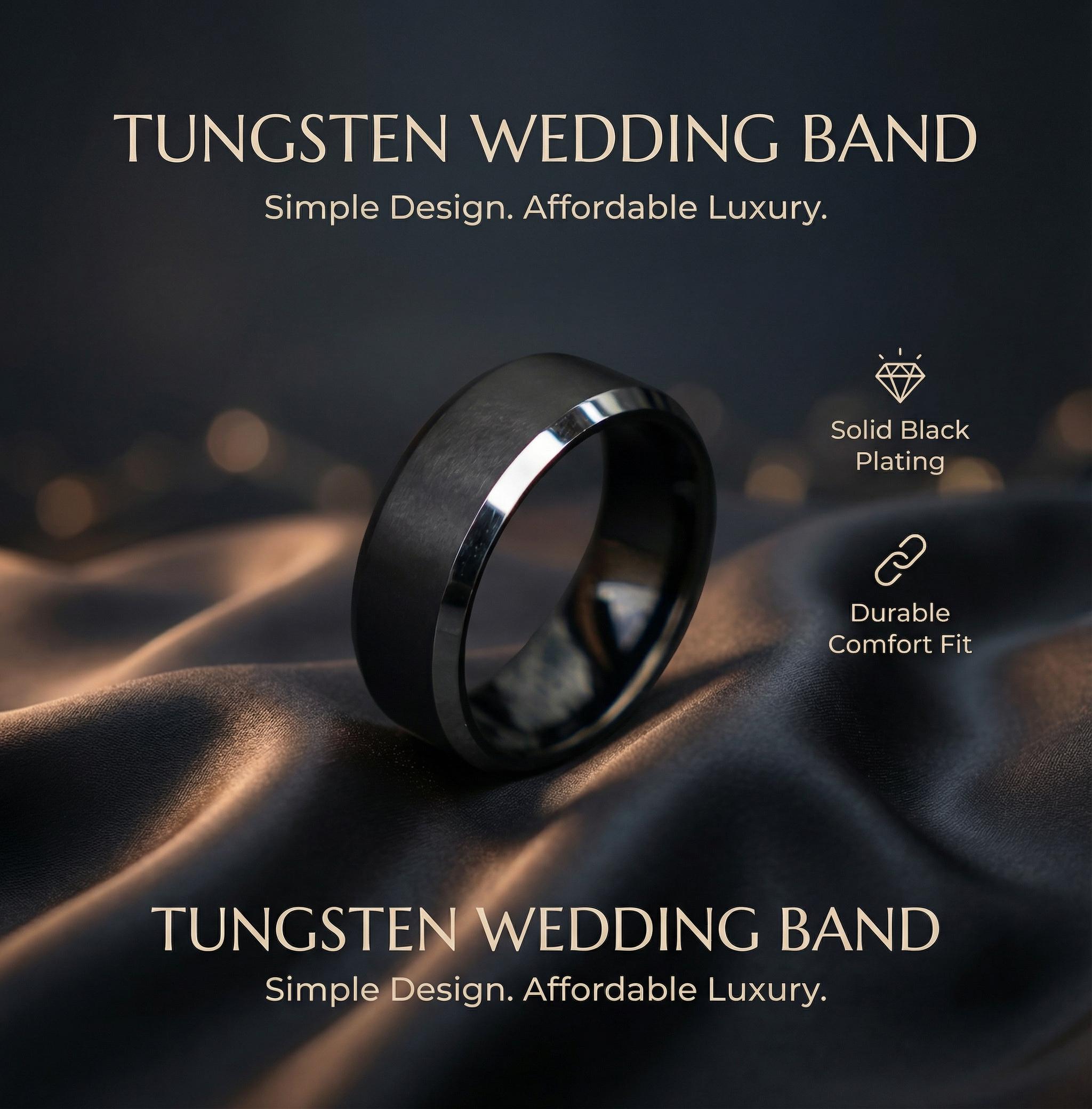 8mm Mens Black brushed Tungsten Ring with Silver polished Edges, 8mm Wedding Band, Womens Engagement, Promise Ring, Mens Black Ring | Decazi