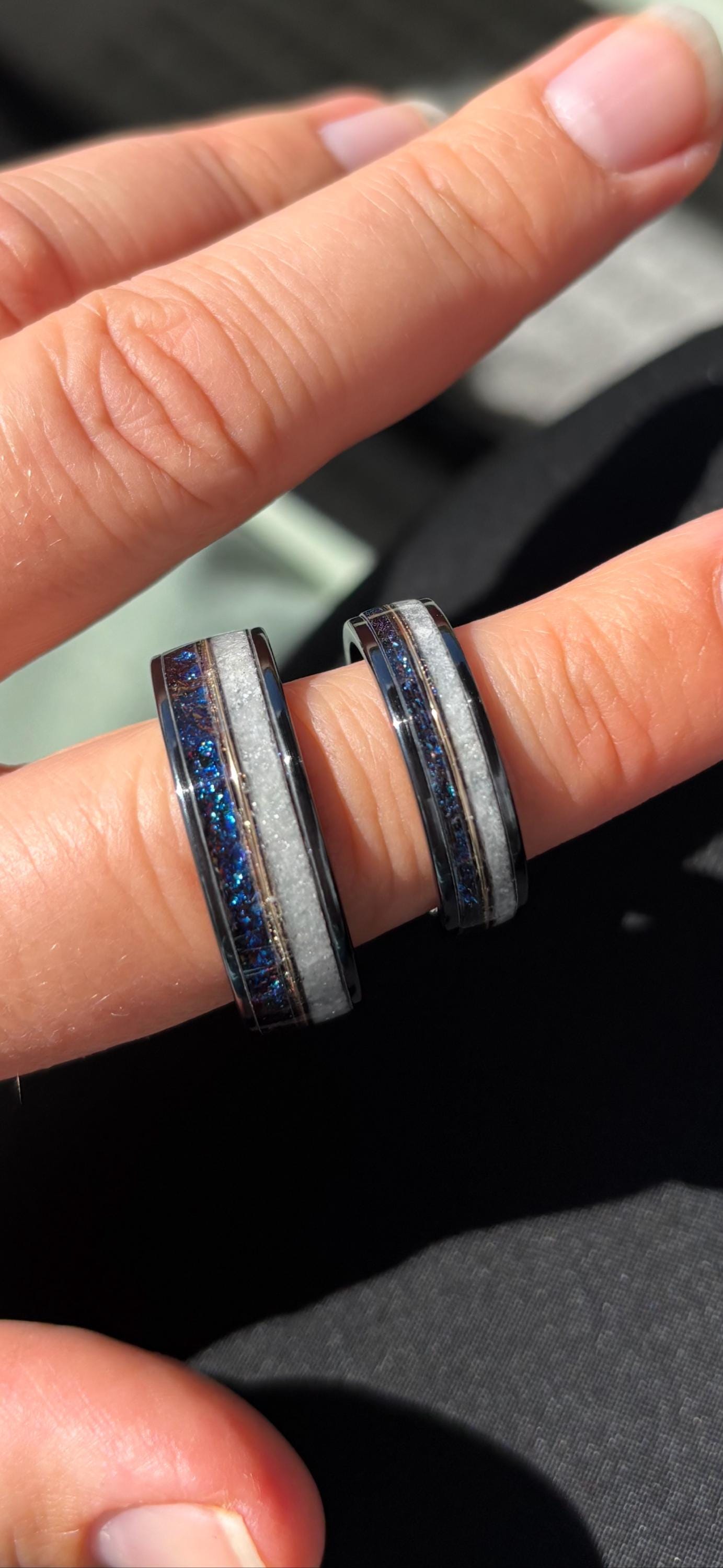 Mixing ratios van vary in our bands (if applicable), this can results in materials can be more or less visible as pictured. By purchasing this listing you agree that this is possible, if you want to be sure a certain part is visible please send us a message upfront to discuss. After shipment the ring design is final, altering it upon receiving can only be done for a small fee to cover our costs for express shipping.