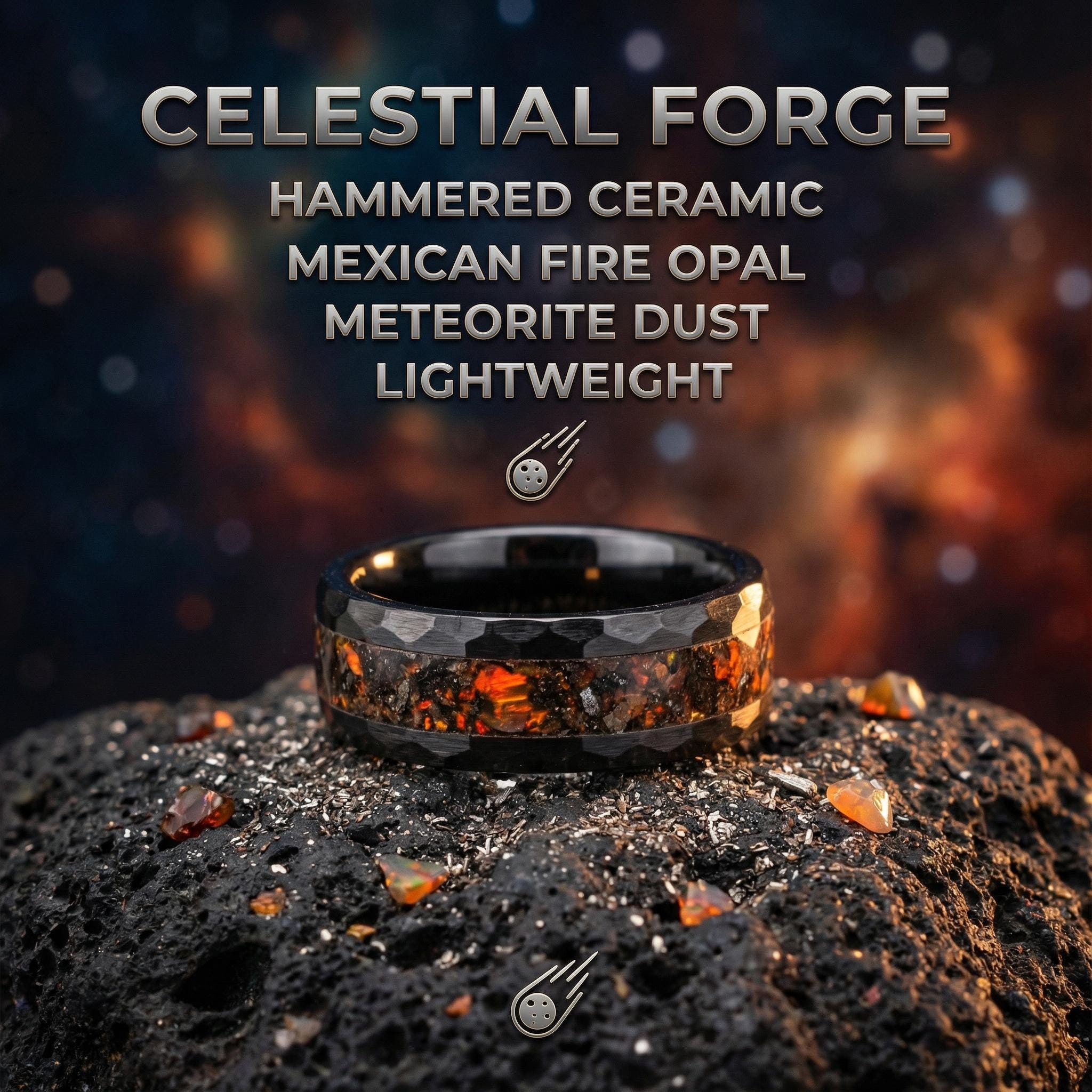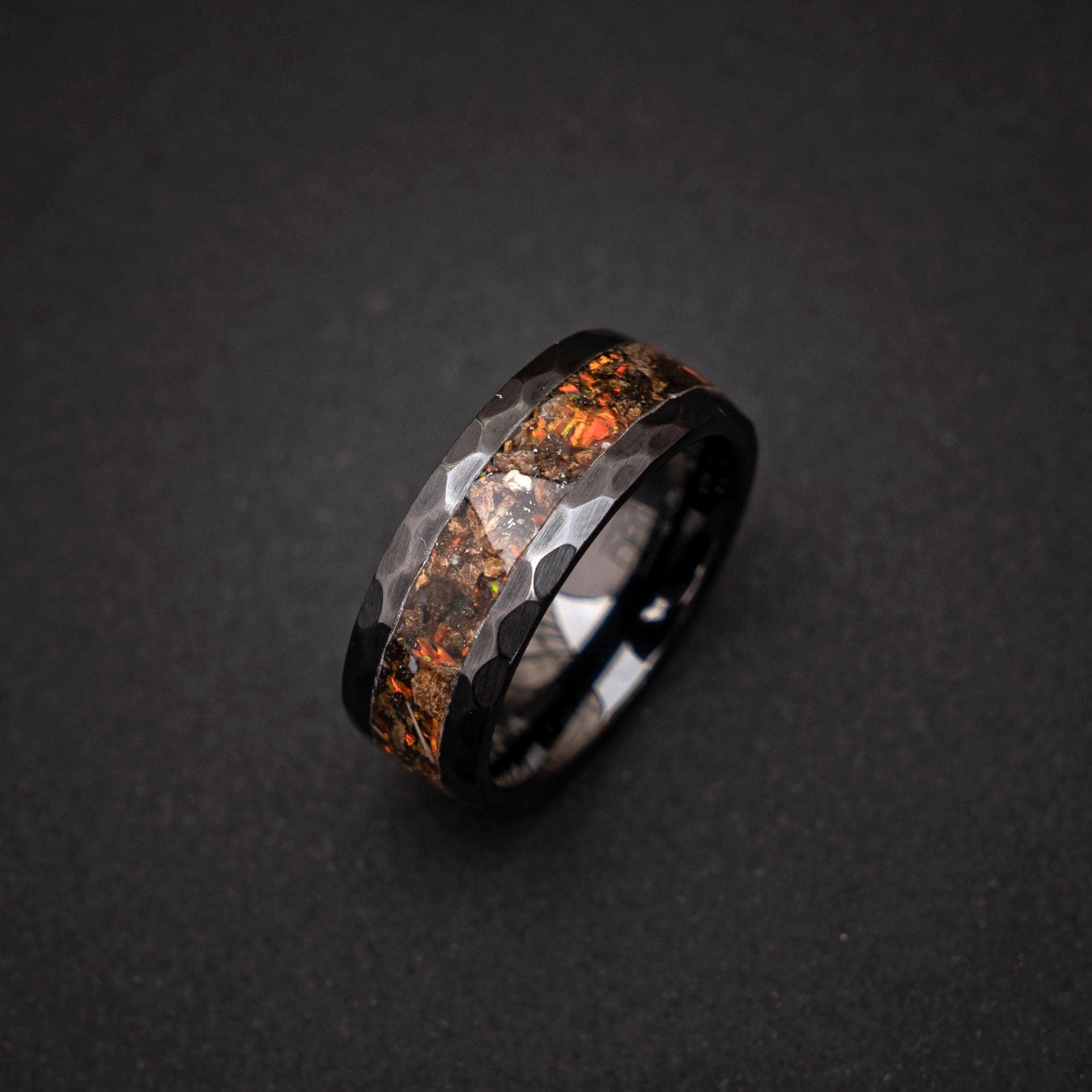 Velociraptor Dinosaur Bone Ring – Mexican Fire Opal + Meteorite Inlay – Black Ceramic Hammered Wedding Band 8mm – Comfort Fit Men’s Ring