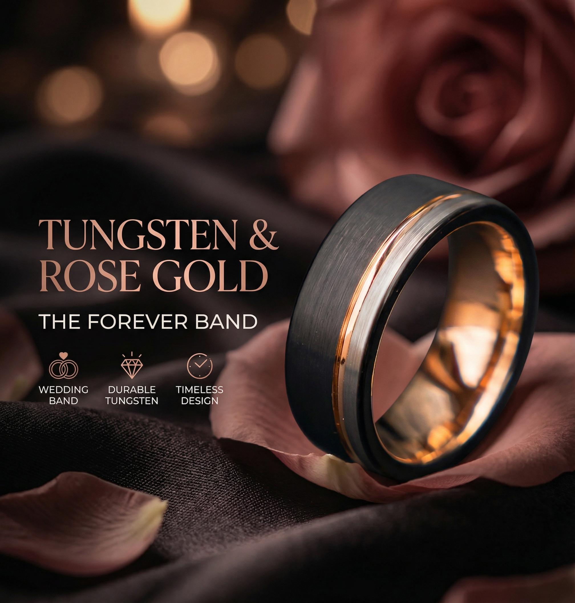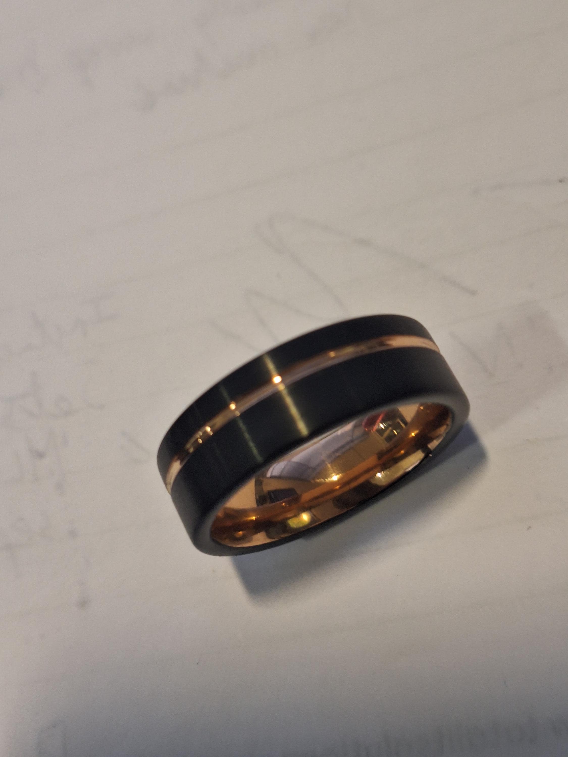 Minimalistic and clean is what this ring is, Black with a subtle rose gold groove and the inside of shiny rose gold. 8mm wide with a very good quality feel.
