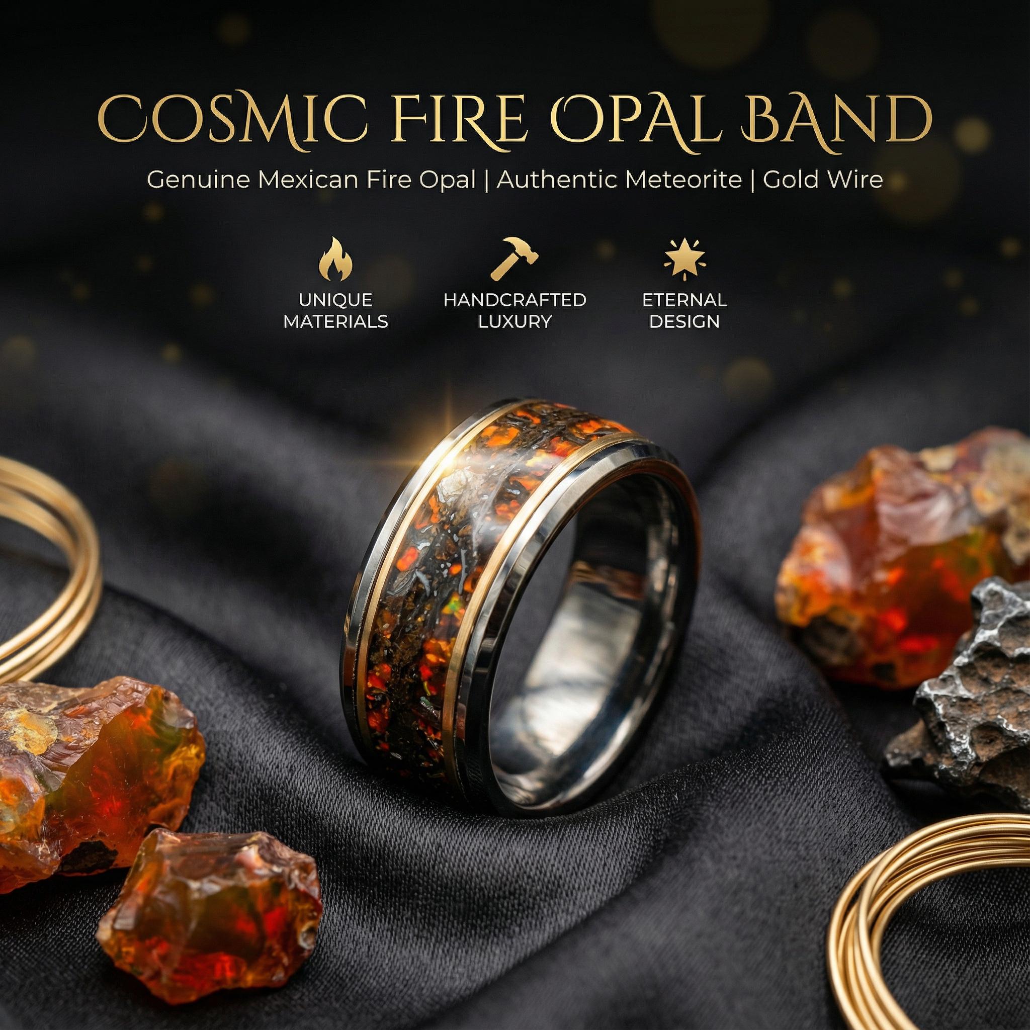 10mm Dinosaur bone ring with Mexican fire opal and meteorite shavings, Man ring, mens wedding band, meteorite ring, wedding ring | Decazi