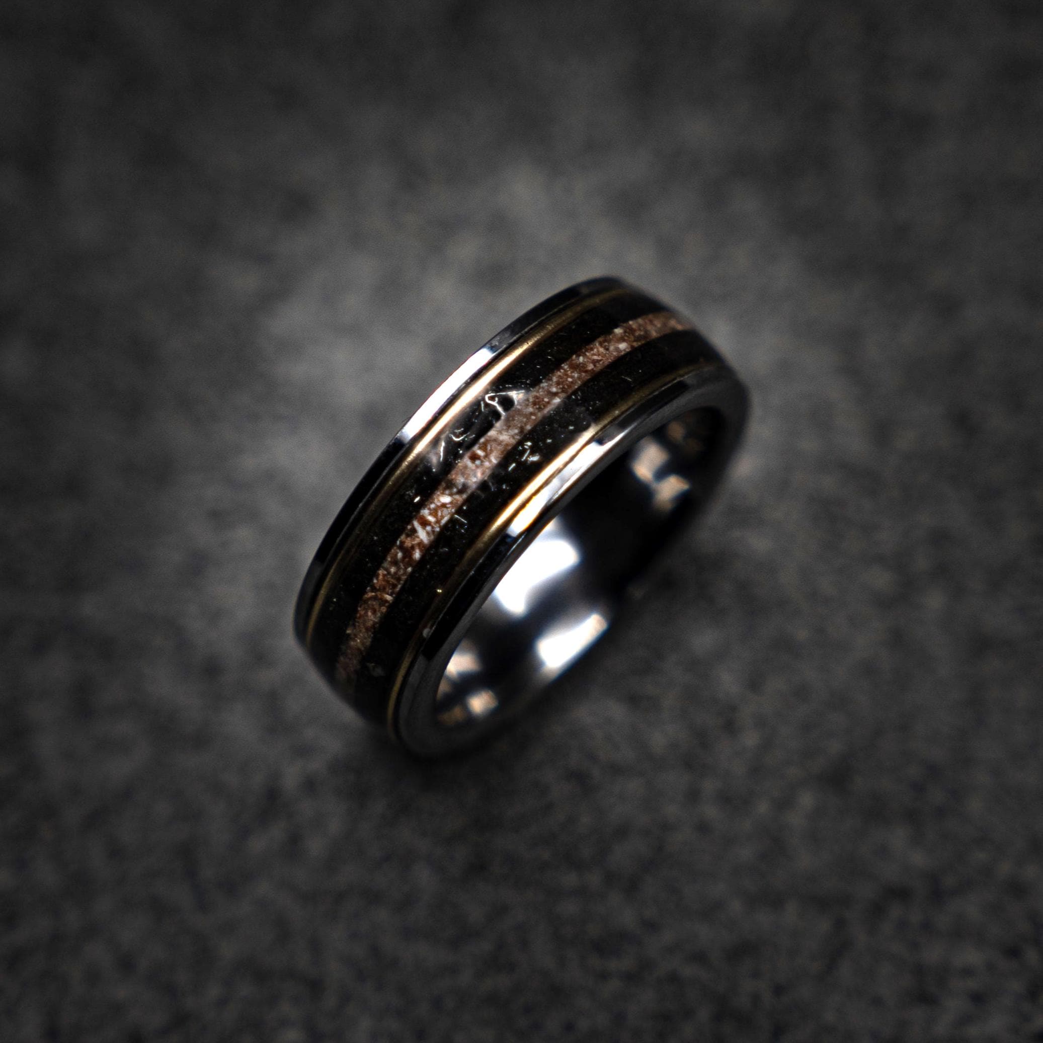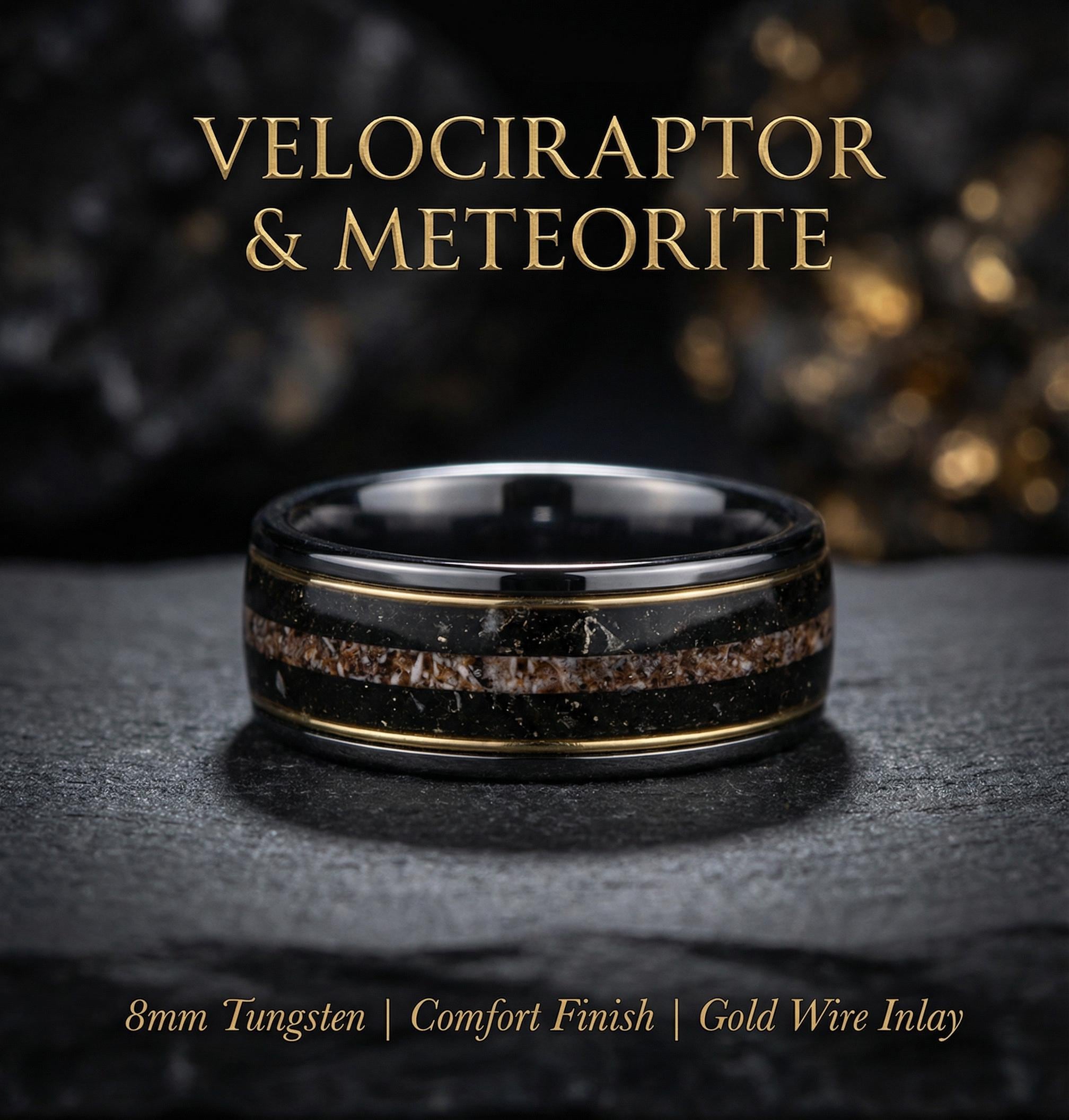 Muonionalusta Meteorite & Dinosaur Bone Tungsten Wedding Band 8mm – 18K Gold Wire – Silver Comfort Fit – Engravable