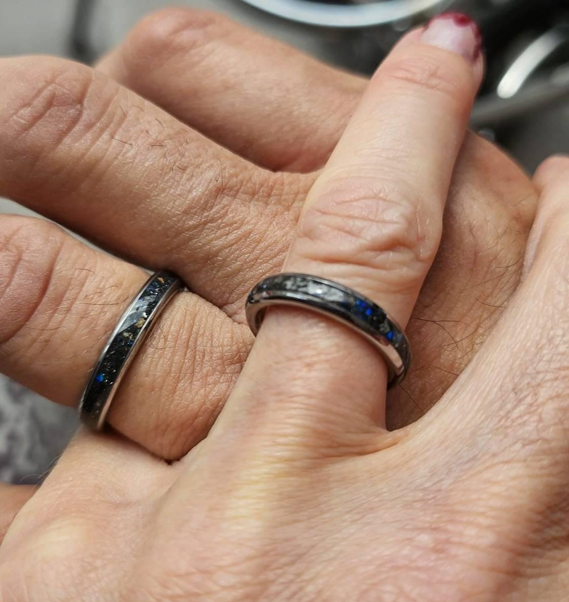 This wedding ring set has it all, Blue galaxy opal, glowstones, Spinosaurus dinosaur bone fragments and meteorite dust/shavings. All premixed and laid in these beautiful sets. The displayed rings are beveled for him and domed for her. if you have different wishes please send us a message we will respond within a couple of minutes ( if the timezone difference lets us )