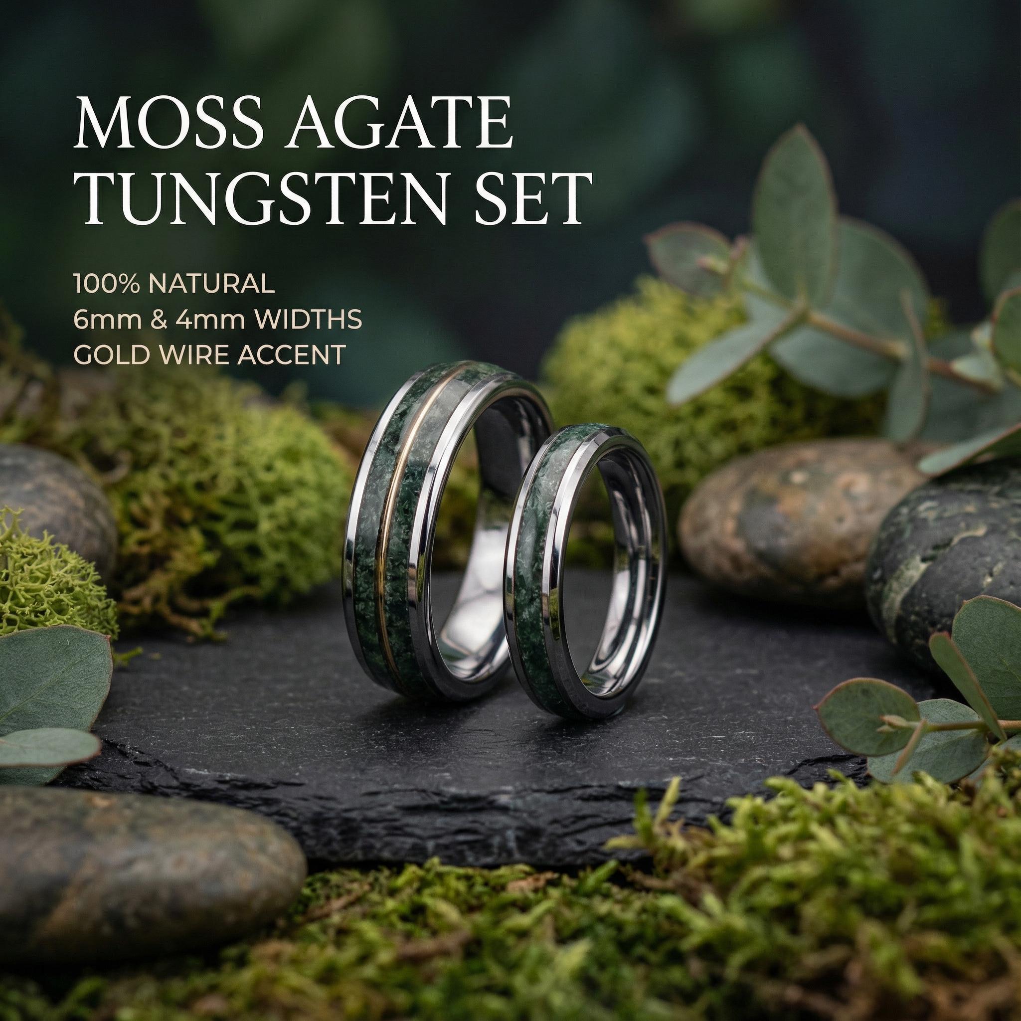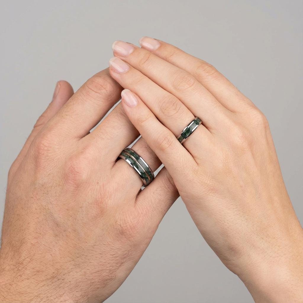 This couples ring set is perfect for crystal lovers. Strong, scratch-resistant tungsten with a moss agate inlay. Male ring 8mm ( if you need a different width please let us know ) Female ring 6mm ( if you need a different width please let us know ) https://www.etsy.com/shop/Decazi?ref=seller-platform-mcnav Still, didn't find your dream band? Send us a message and let's talk about the options. Terms of service Rush your order: It is possible to add RUSH to your order. Before ordering the RUSH order please send us a message, we need to check if we have the black in stock. If we have the black in stock the ring will be made and shipped within 48hours. https://www.etsy.com/listing/733462575/rush-your-order-shipped-within-24-hours?ref=shop_home_feat_4&pro=1&frs=1 Engraving: For engraving please purchase link below https://www.etsy.com/listing/653651804/engraving?ref=shop_home_feat_2&pro=1&frs=1 Shipping information: We ship with DHL express on-demand. We use a special program that fedges information from Etsy. This means the system will use the email address used on Etsy ( your profile email ) we can not change this. When we mark an order complete tracking information will be sent to that email and also the completed order will have a tracking code. Transit times are based on location, it varies from 1-5 days worldwide ( due to the pandemic ) Europe is 1-2 days outside Europe mostly 3 days. Construction of our rings: Our rings are made with a jewellery grade CA, this CA is made so it won't cause a skin reaction. They are waterproof and can be worn when swimming or showering. Ring size & custom: If you order a Decazi ring it will be made by hand we don't have rings in stock. This way we guarantee that every ring is made by your wishes. Make sure when you measure your fingers that the size is correct if you have trouble with sizing please let us now we can help you. Tungsten: The main property of Tungsten carbide is that it's hypoallergenic so you cant be allergic to our rings. Even the most sensitive can wear a Decazi ring. Production: Our rings are all handmade in The Netherlands, we do NOT sell premade ring from aliexpress. A good way to spot Ali-express ( dropship ) rings is the engraving “Tungsten carbide” on the inside. Selling premade rings is illegal and against Etsy's TOS. Etsy only allows for handmade products. Our rings are unique and one of a kind, you won't find them elsewhere. Because of that our rings are unique they can look different in colour and stone placement. Shipping: We ship worldwide, to keep the cost low we send our products in a Cardboard envelope. The ring will sit in a custom decazi (eco-friendly) ring box, that box will sit in a Decazi Nappa-leather bag. Refund: Every order is handmade and unique, so for that, we don't accept refunds. But we will find a proper solution to make you a happy customer. Warranty: We do offer a warranty on our rings. Ceramic rings 6 months on the ring ( exclude inlay ) Tungsten 12 months on the ring ( exclude inlay ) This means that if the ring breaks and it's due to malfunction ( which is rare ) we will exchange the ring on our expenses. If the rings break due to mishandling we do not cover the exchange. For the inlay we offer a 6-month free redo-service we only ask to cover the shipping back to you but the service is completely free. Included in this service is – rebuff the ring – polishing – filling up holes – if the inlay falls out. Products with genuine opal: Keep in mind that the colour for genuine opals can be very different, we cannot control this we rely on what we can get from the opal distributor. Blue opal listed can be yellow/red/purple/ or a mix of colours. Genuine opals: We use Australian/Ethiopian/andamooka opals these are natural and can look different in colour. Some are blue some are yellow or purple. If you want a specific colour please send us a not upon buying so we can check what we have in stock. Glow in the dark: the glow in the pictures ( if there is glow added ) can vary. due to a couple of factors, the glow can be stronger or less strong. one of that factor is the amount of opal that is on top of the glow powder and the density of the opal. Therefore it is possible that the Glow is very faint. If you want the glow to be very present please let us know, we will explain the options. The red glow is a not strong glow keep that in mind. most of our glows can be charged with pure sunlight and some need to be charged with a UV light ( UV-keychain will do ) Exchanges: We offer exchanges if the size is not correct. We do handle a 20% remake fee ( as we have to make a completely new ring ) and the shipping costs. So make sure you are correct with the size. We make pictures of every ring on a mandrel before they leave our shop. If for some reason you are not satisfied please send us a message before reviewing or opening a case, we always find a proper way to solve the issue. By purchasing this listing you agree to have read our policy and the above. RETURN POLICY -All sales are FINAL and I DON’T accept returns. -This is a customized and personalized product, and can not be resold. -If you have any questions please do not hesitate to contact me. ------------------------------------------------------- CAN’T FIND THE ANSWER TO YOUR QUESTION? -If you can’t find the answer to your question, don’t hesitate to send me a quick message. Or read our FAQ and TOS -I will do my best to accommodate your requests. *** Thank you for visiting *** Mens wedding band, Handmade wedding band, mens ring, mens wedding bands, wedding band, mens engagement ring, decazi,
