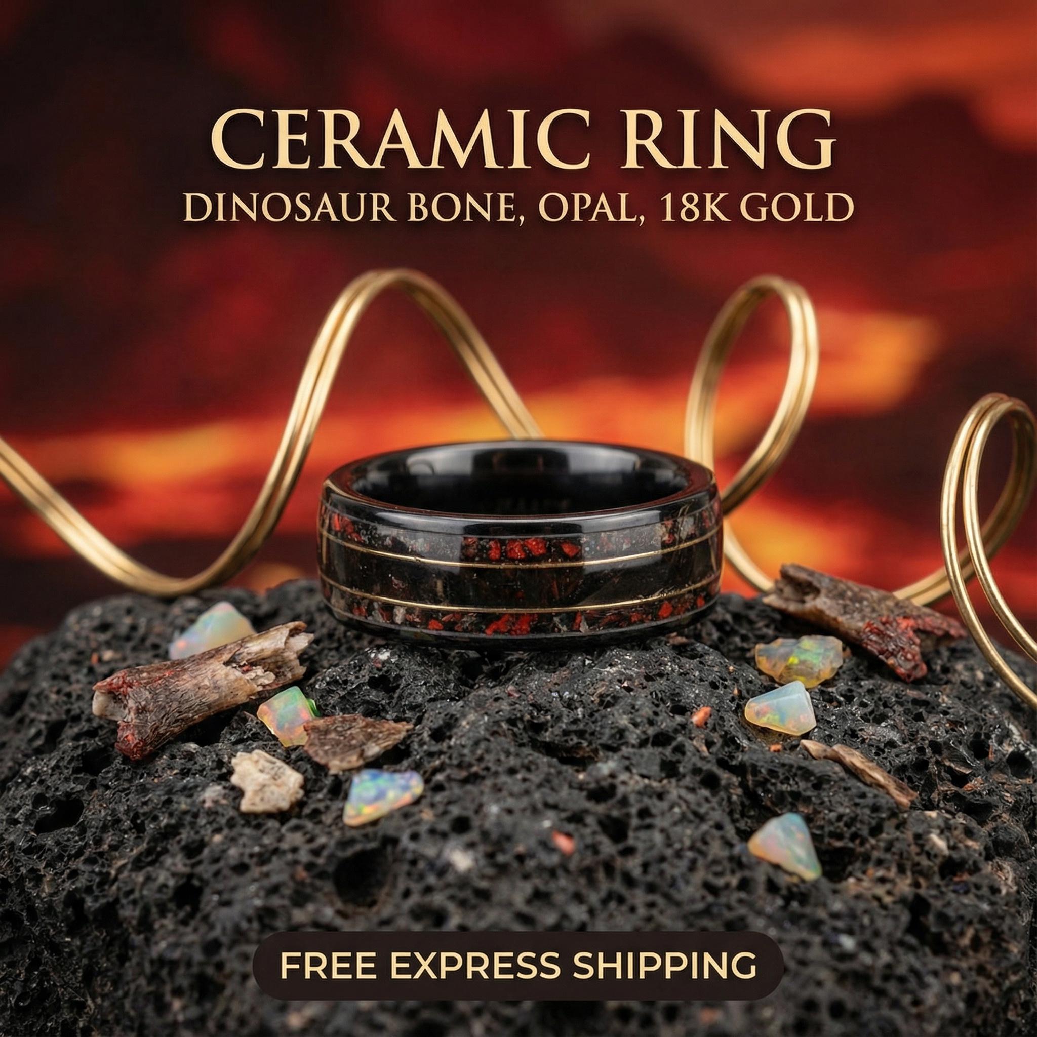 Trex Dinosaur Bone Black Opal Meteorite Ceramic Ring, Meteorite ring, Dinosaur Bone Fossil Ring, Men's Wedding Band, Ceramic Band