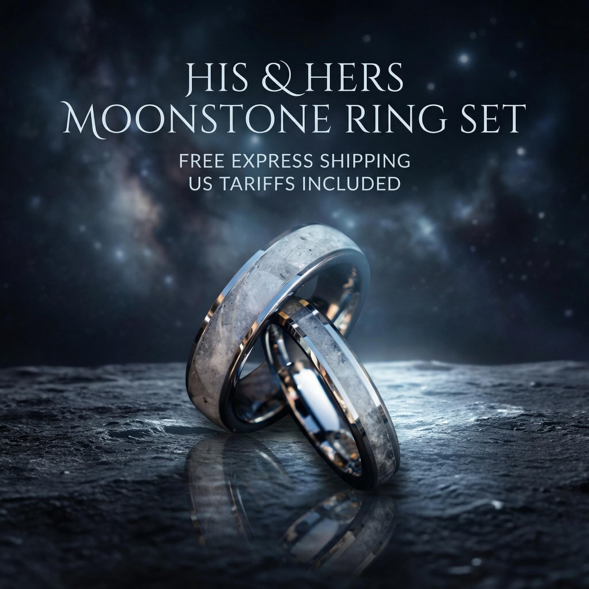 This silver tungsten couple ring set features a shimmering moonstone inlay that catches light with soft flashes of color. A simple, meaningful symbol for weddings, engagements, anniversaries, or promise rings.