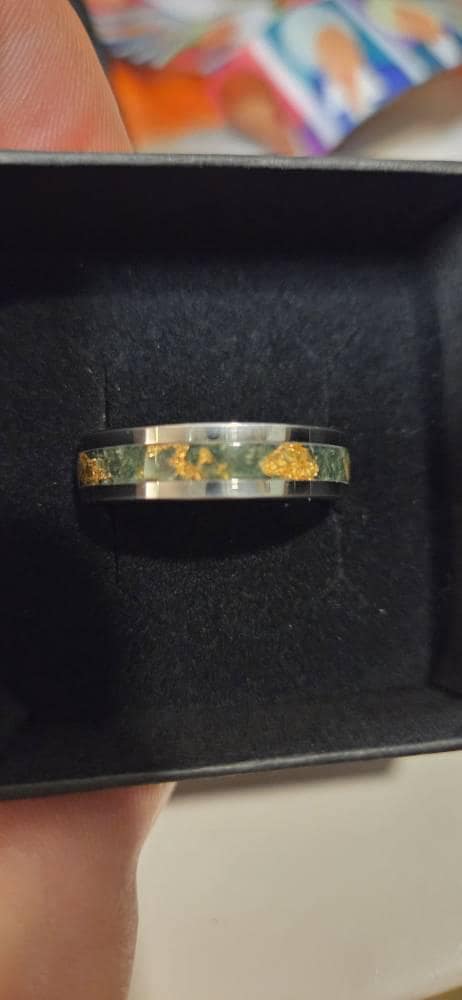 Belle bague. Cependant j'attendais une couleur verte nettement plus prononcé, sans lumière dessus on l'a confond avec du gris. Faire attention au filtre sur les photos des articles..