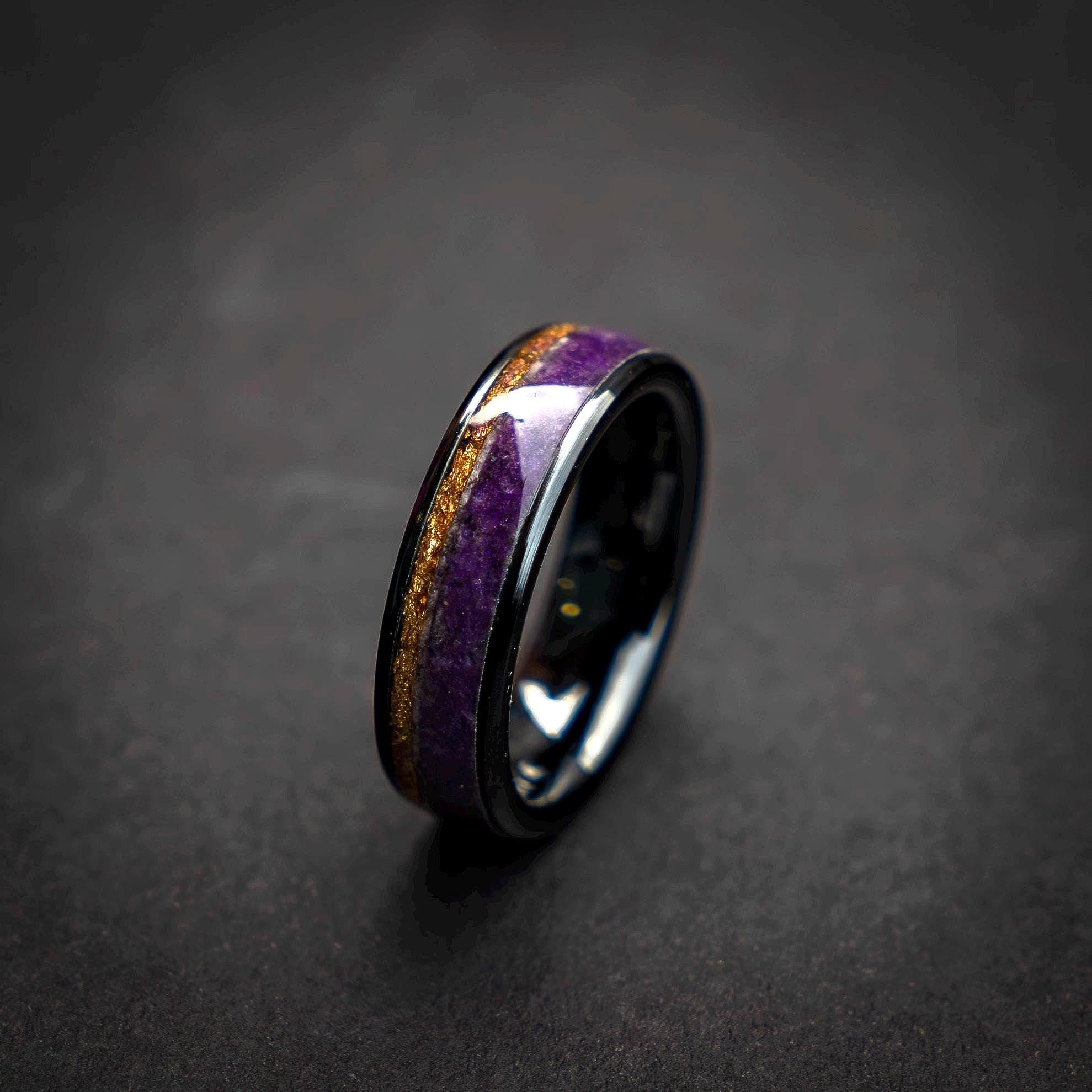 Black Ceramic Ring with Amethyst Inlay and Gold Foil | 6mm Faceted Band for Men/Women | Elegant & Durable Wedding or Anniversary Ring