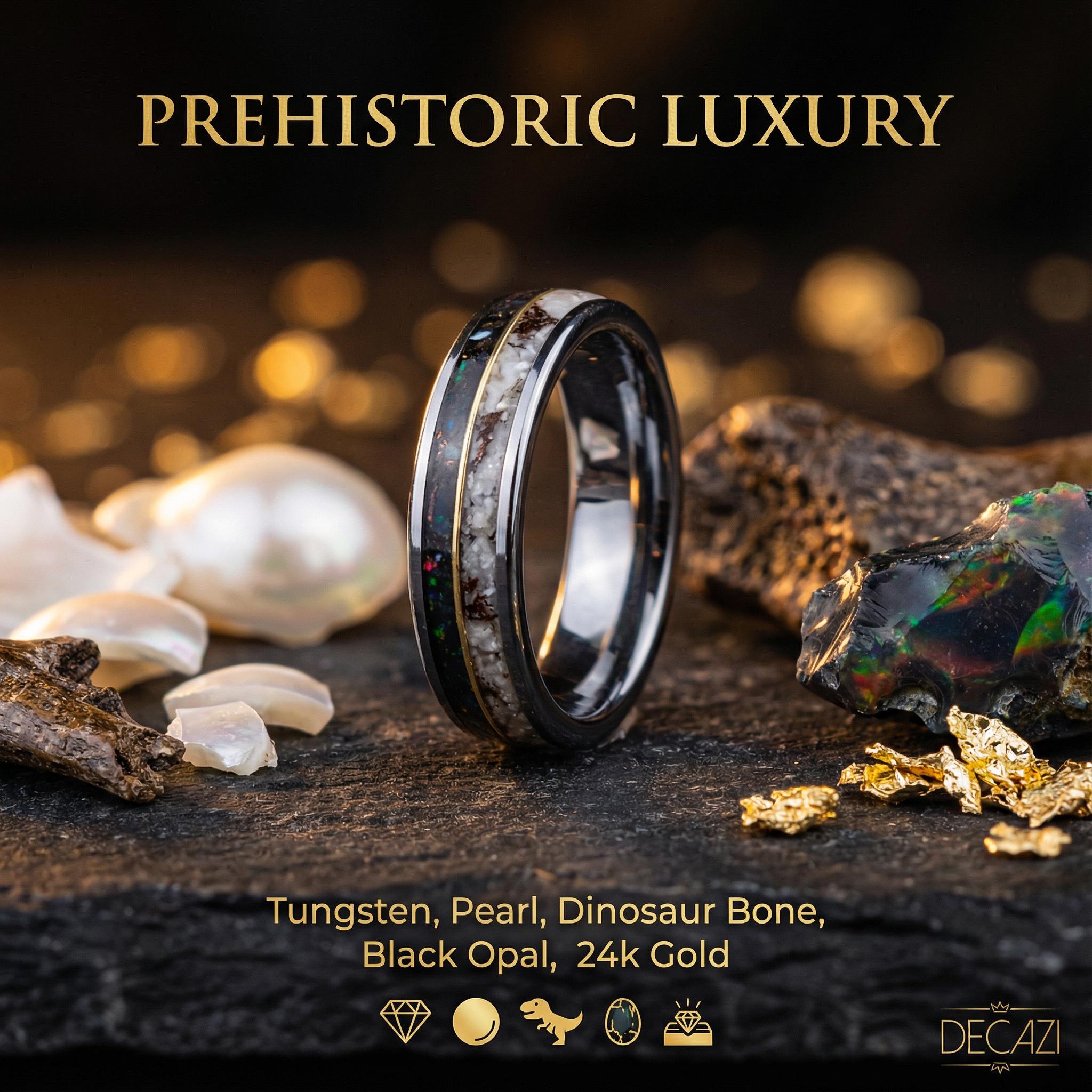 Inlay: One row of Crushed Pearl mixed with Tyrannosaurus Rex (Trex) Dinosaur Bone and one row of Black Red Fire Opal mixed with Muonionalusta Meteorite divided with one 18ct yellow gold wire