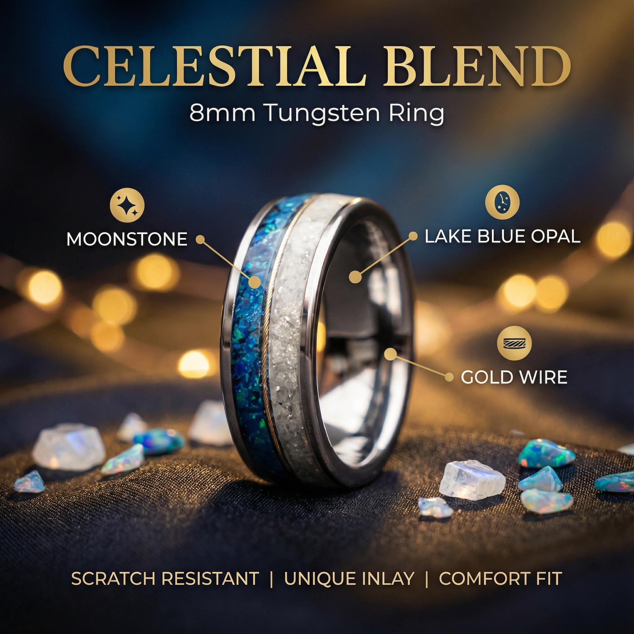 Two beautiful elements coming together in this beautiful ring. On the left rainbow moonstone healing crystal and on the right bright Blue opal separated with an 18K Yellow Goldwire. The ring designs are made out of tungsten. This set is perfect for everyday wear but can also be used as wedding rings, promise rings, engagement rings. With normal daily wear, the ring will last a lifetime.