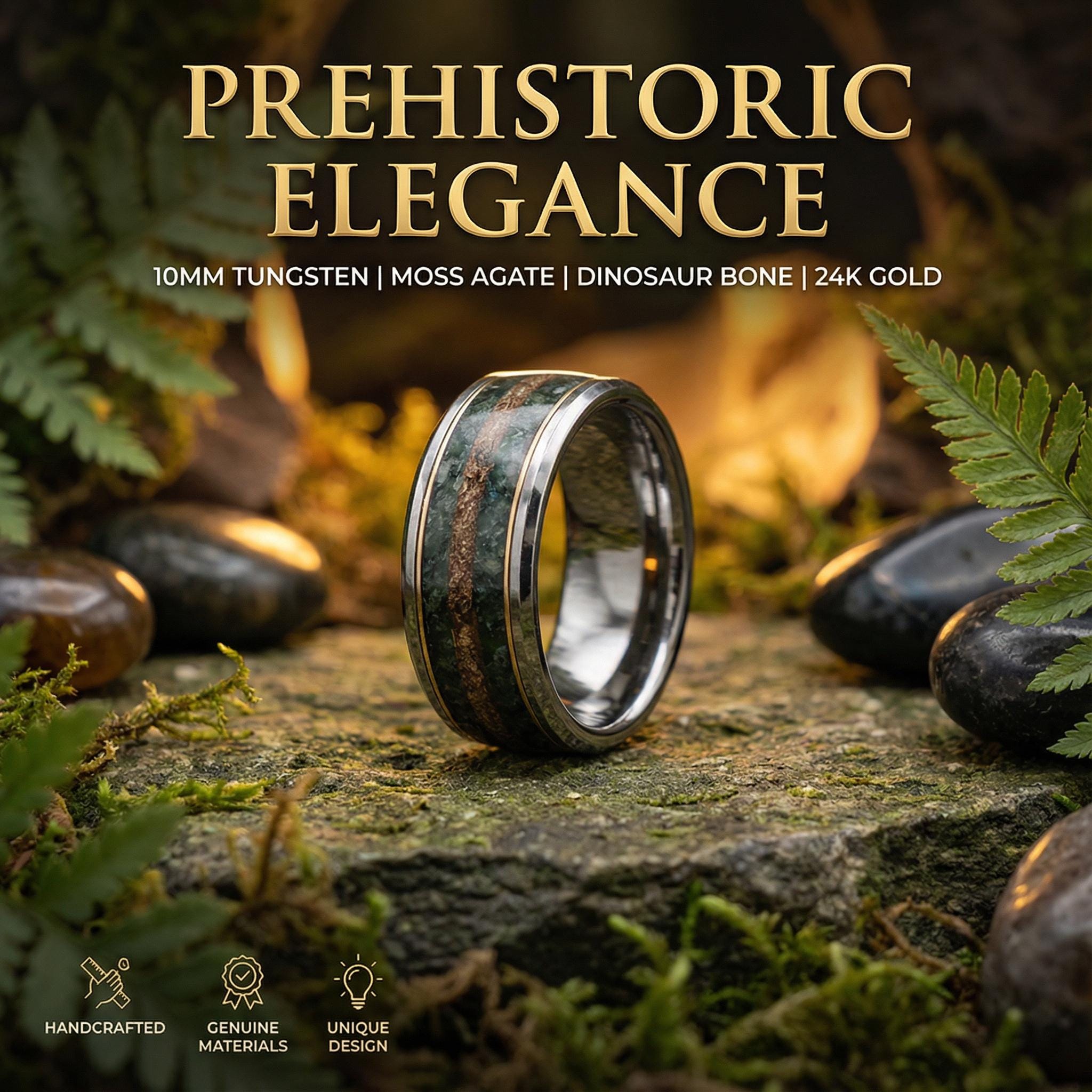 Moss Agate Dinosaur Bone Wedding Ring, Fossil Ring, Agate Jewelry, Fosilized Dinosaur Bone, Engagement Ring, Gold Wire - Decazi