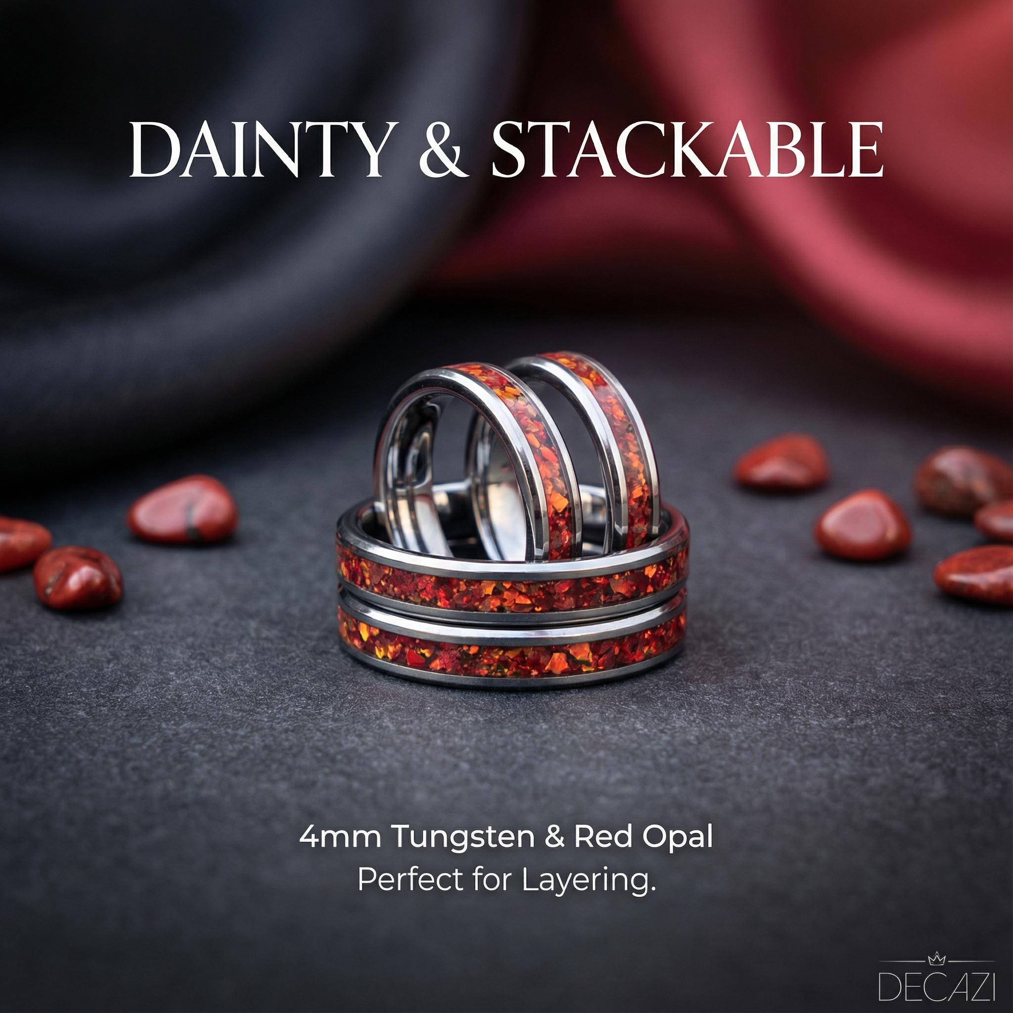 Tungsten 4mm Minimalist Engagement Ring, Ruby Red opal Wedding Band, Womens Ring, Thin Silver Tungsten Ring, Womens Wedding Band | Decazi