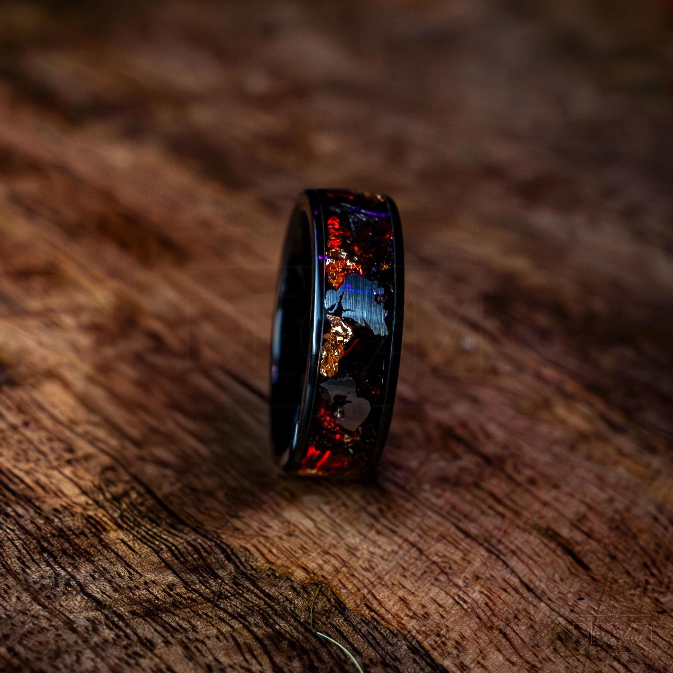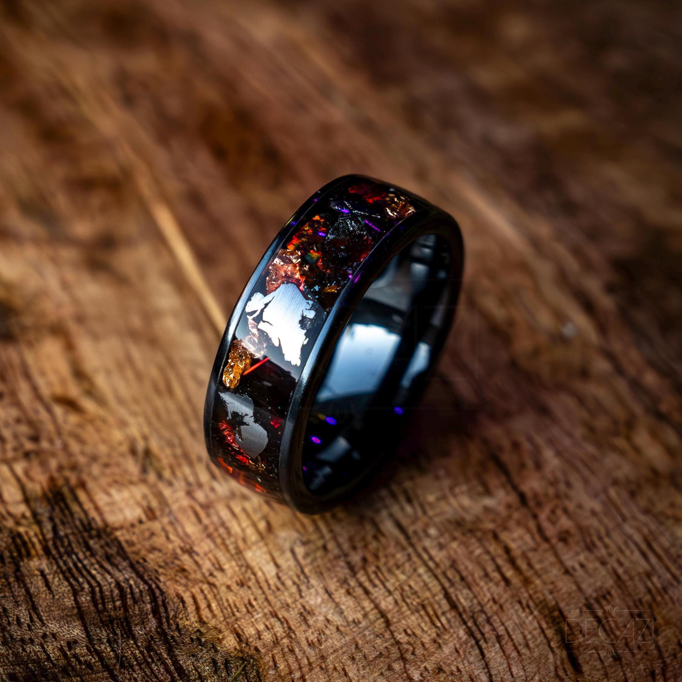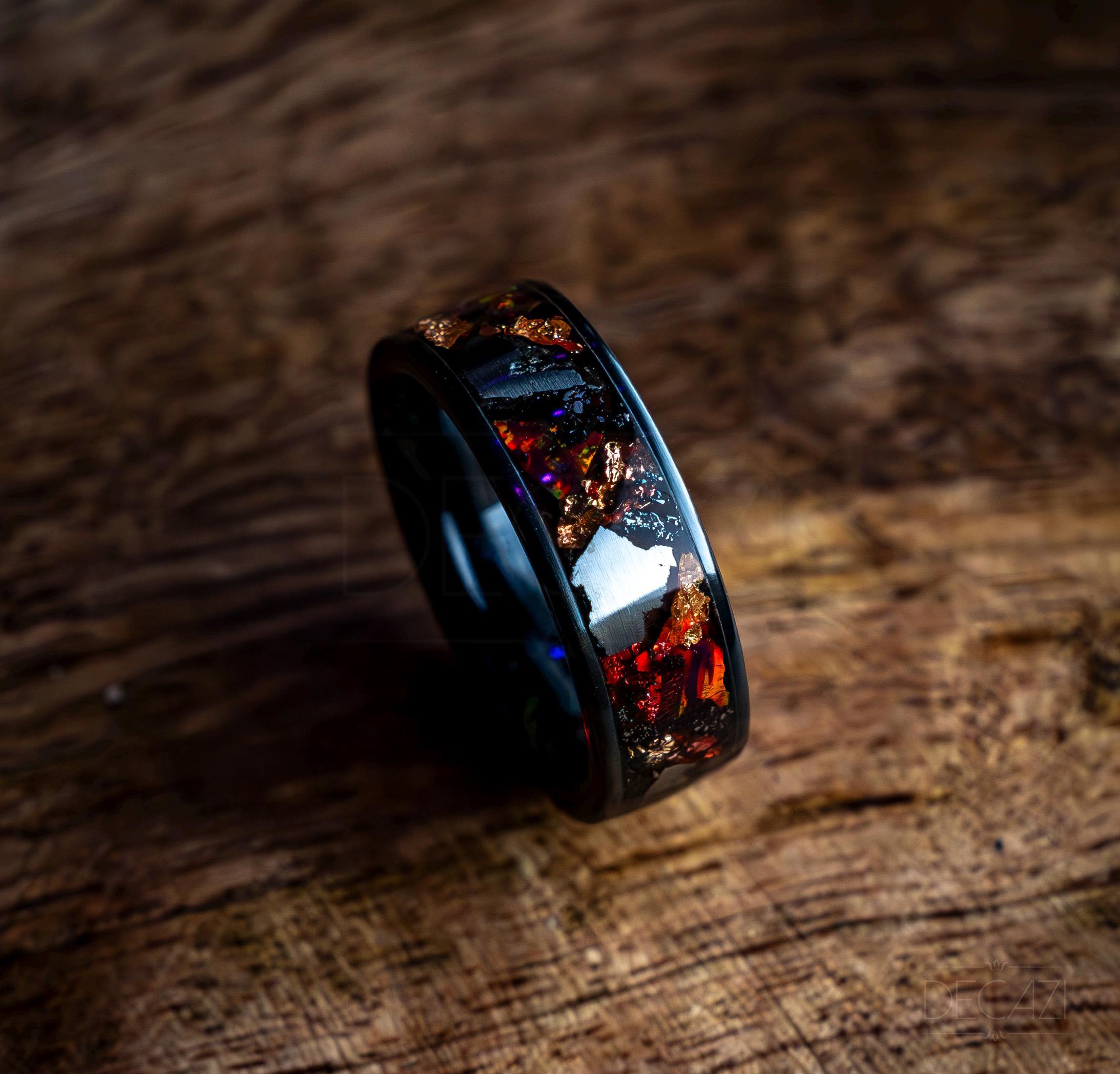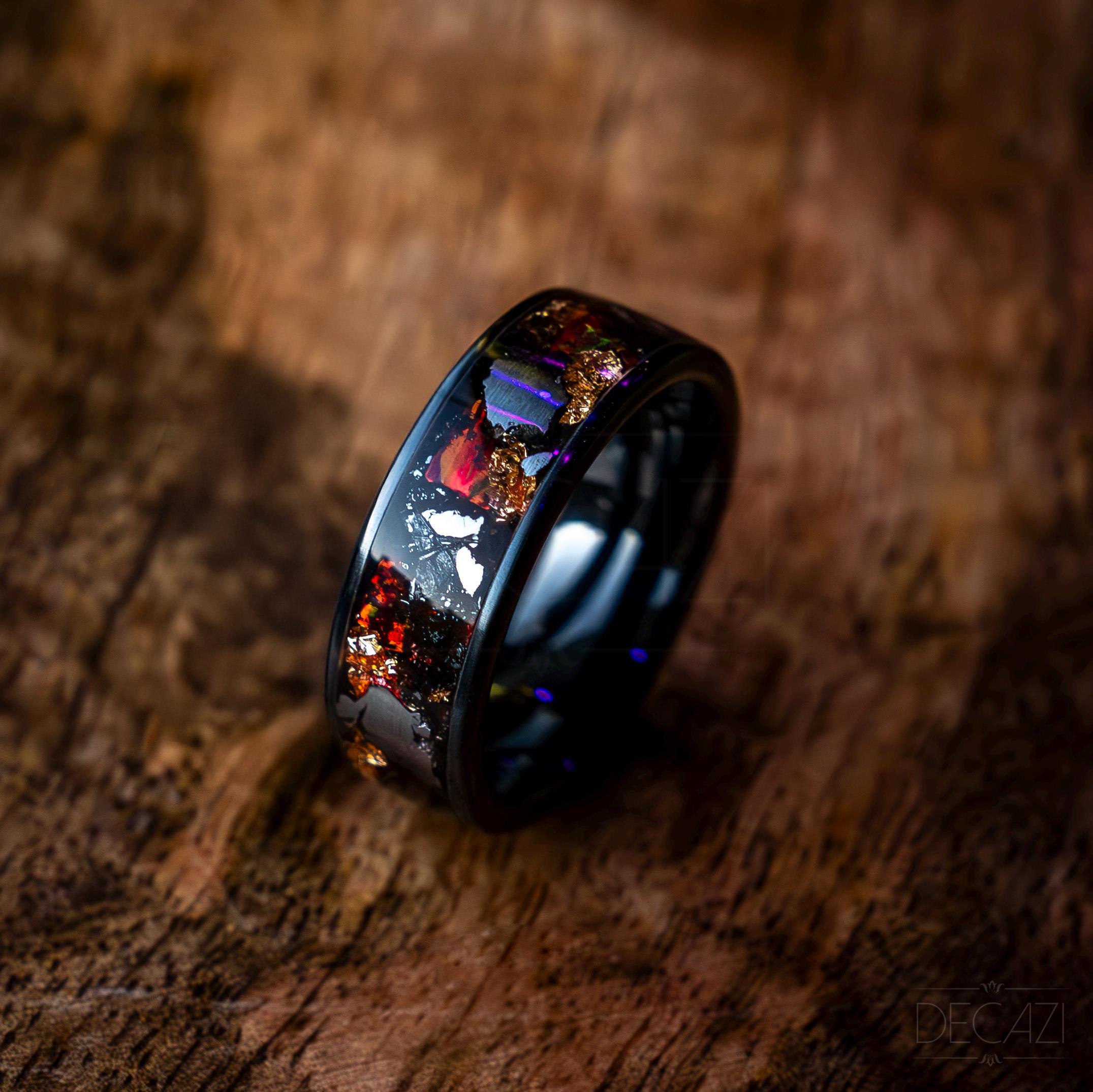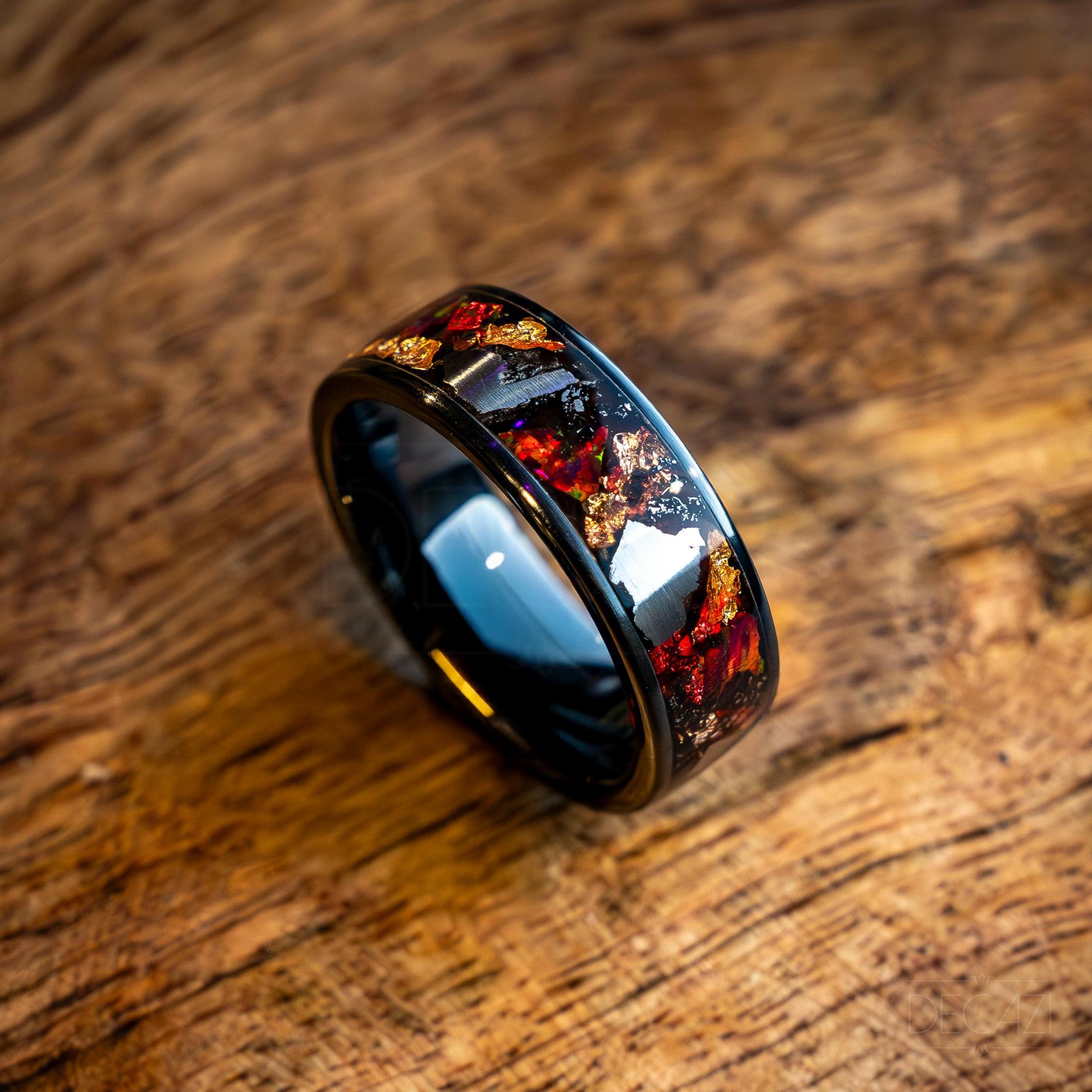 Red fire opal ceramic ring with muonionalusta meteorite chunks and 18K gold leaf, his and her, couples set | Decazi