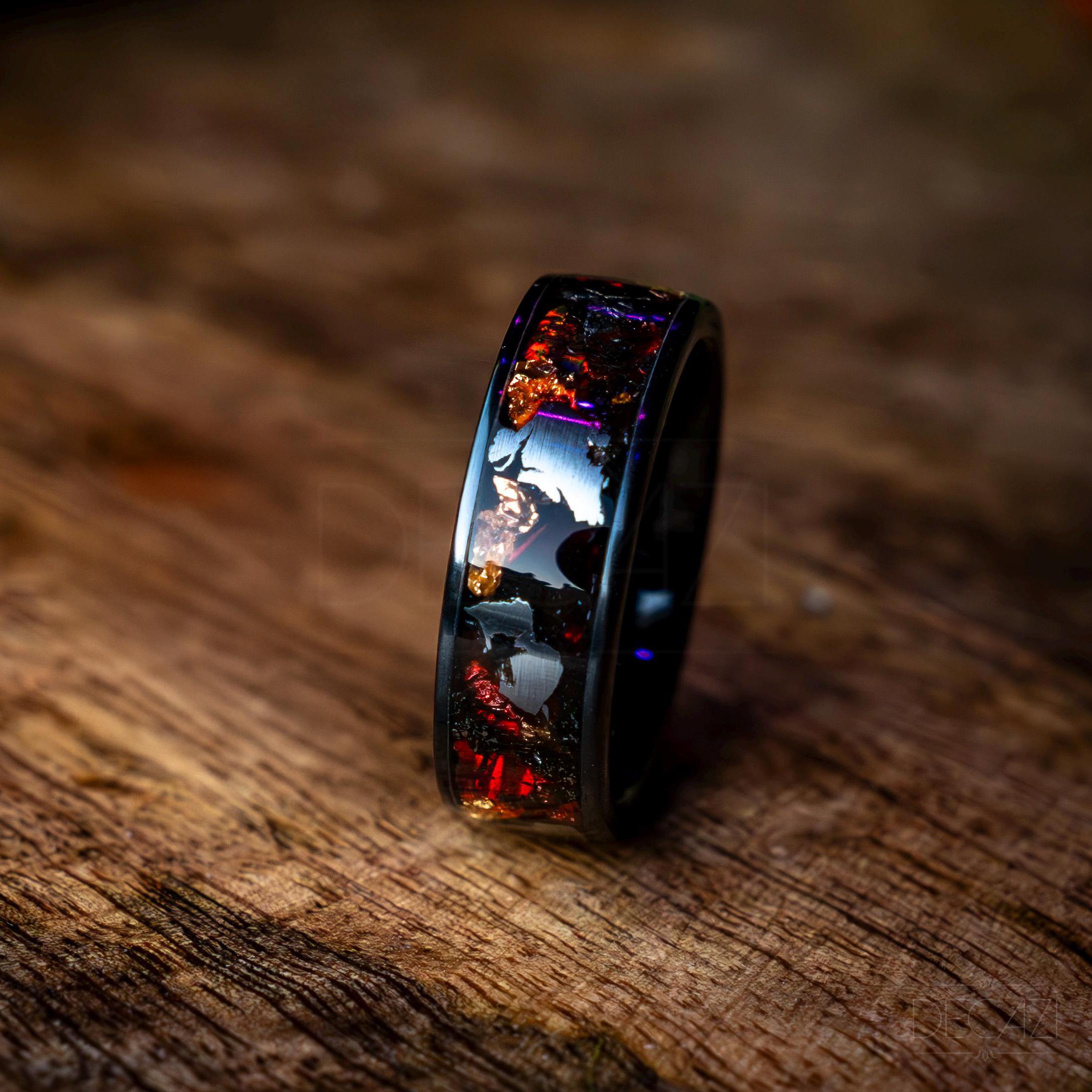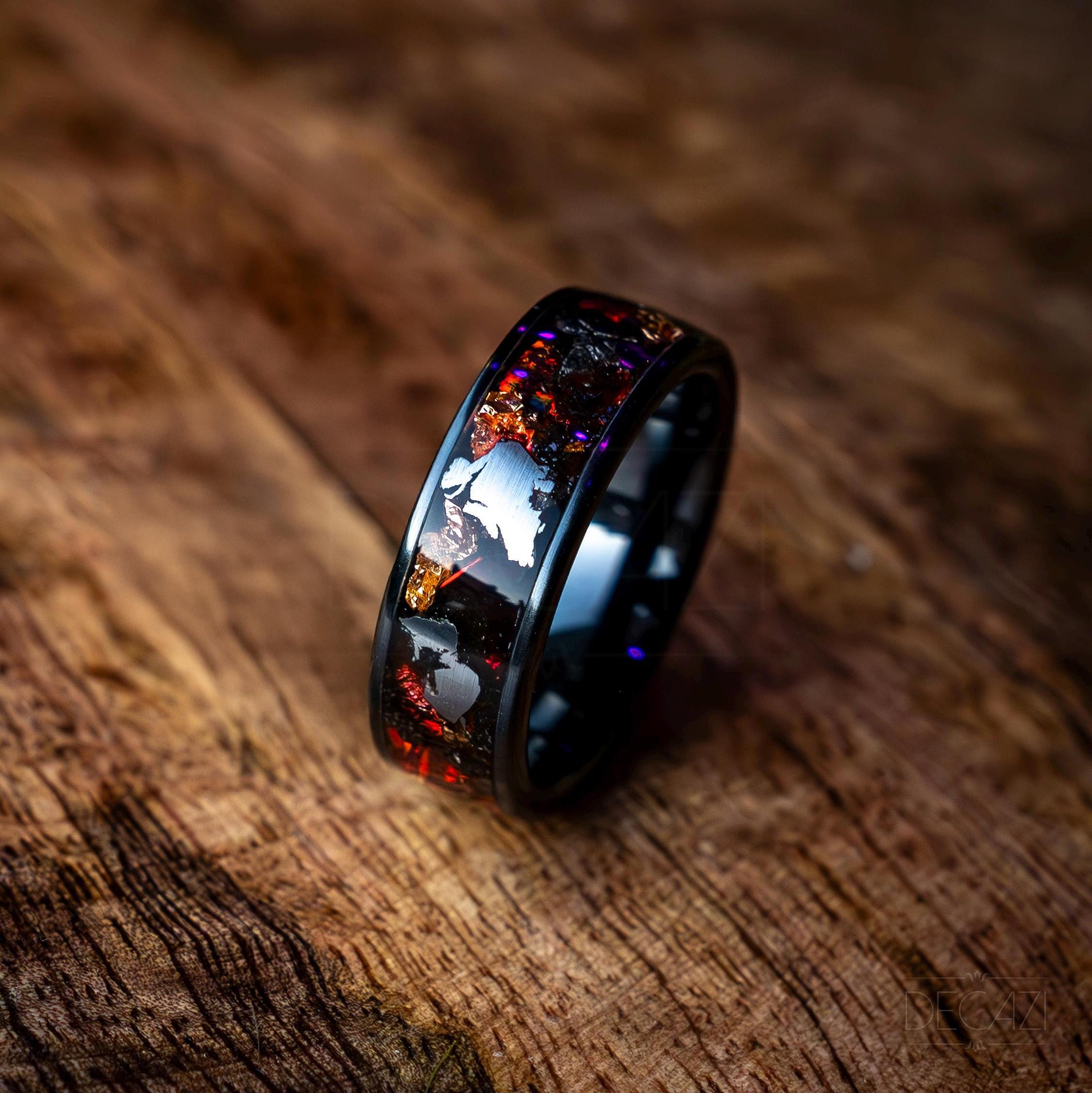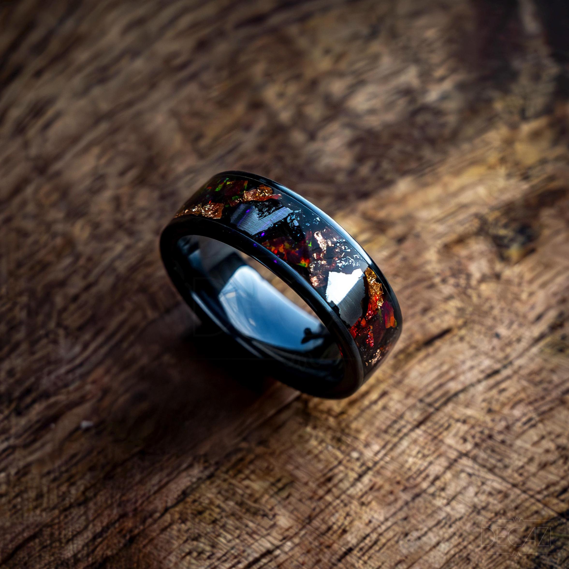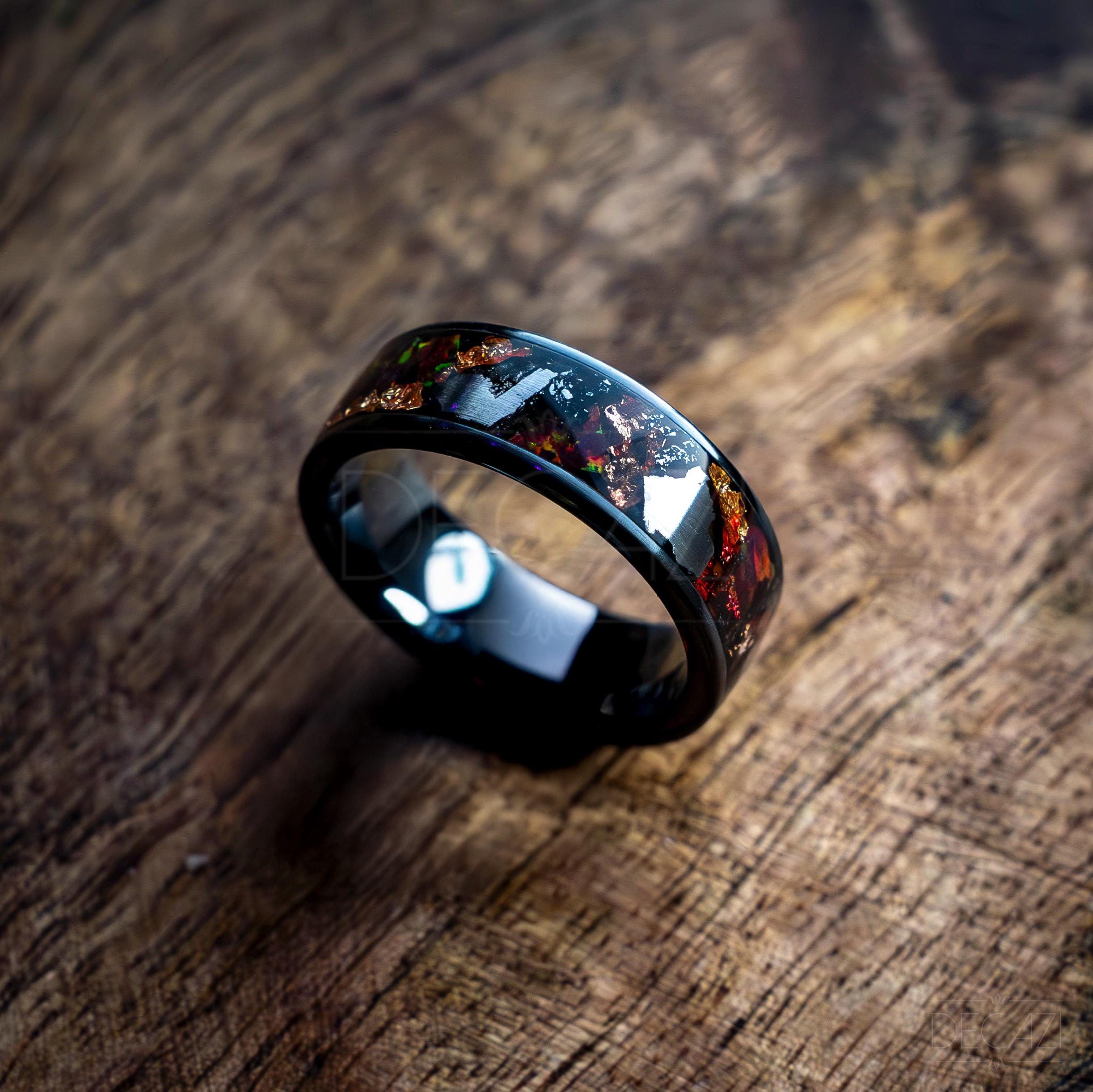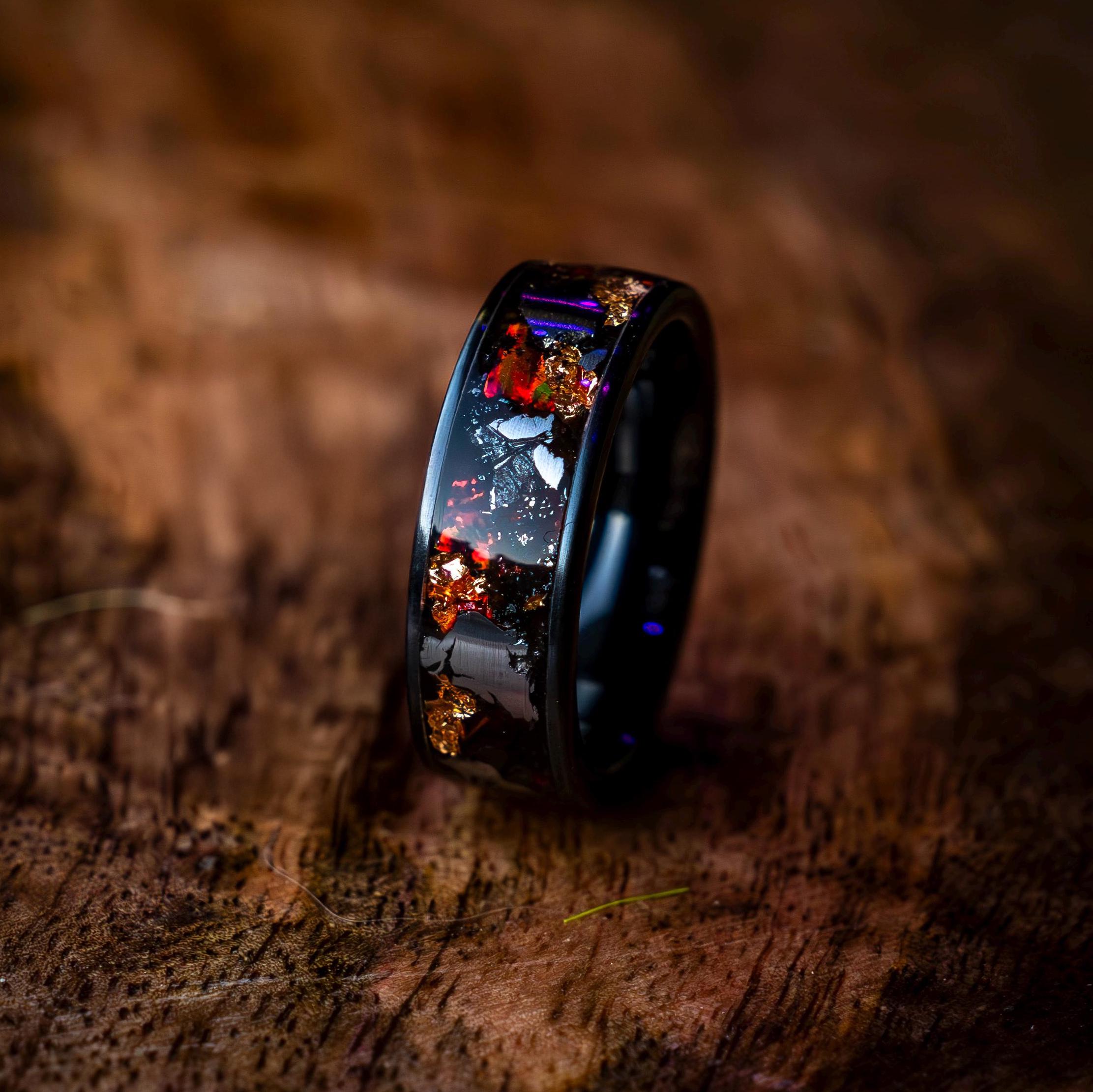 Red fire opal ceramic ring with muonionalusta meteorite chunks and 18K gold leaf, his and her, couples set | Decazi