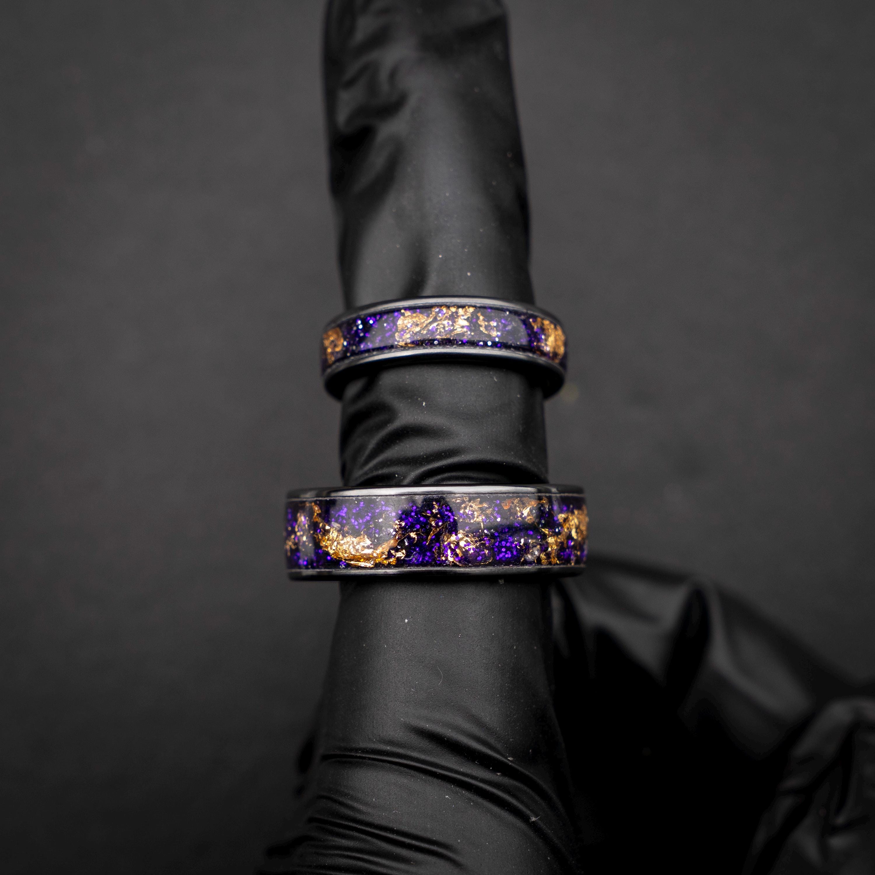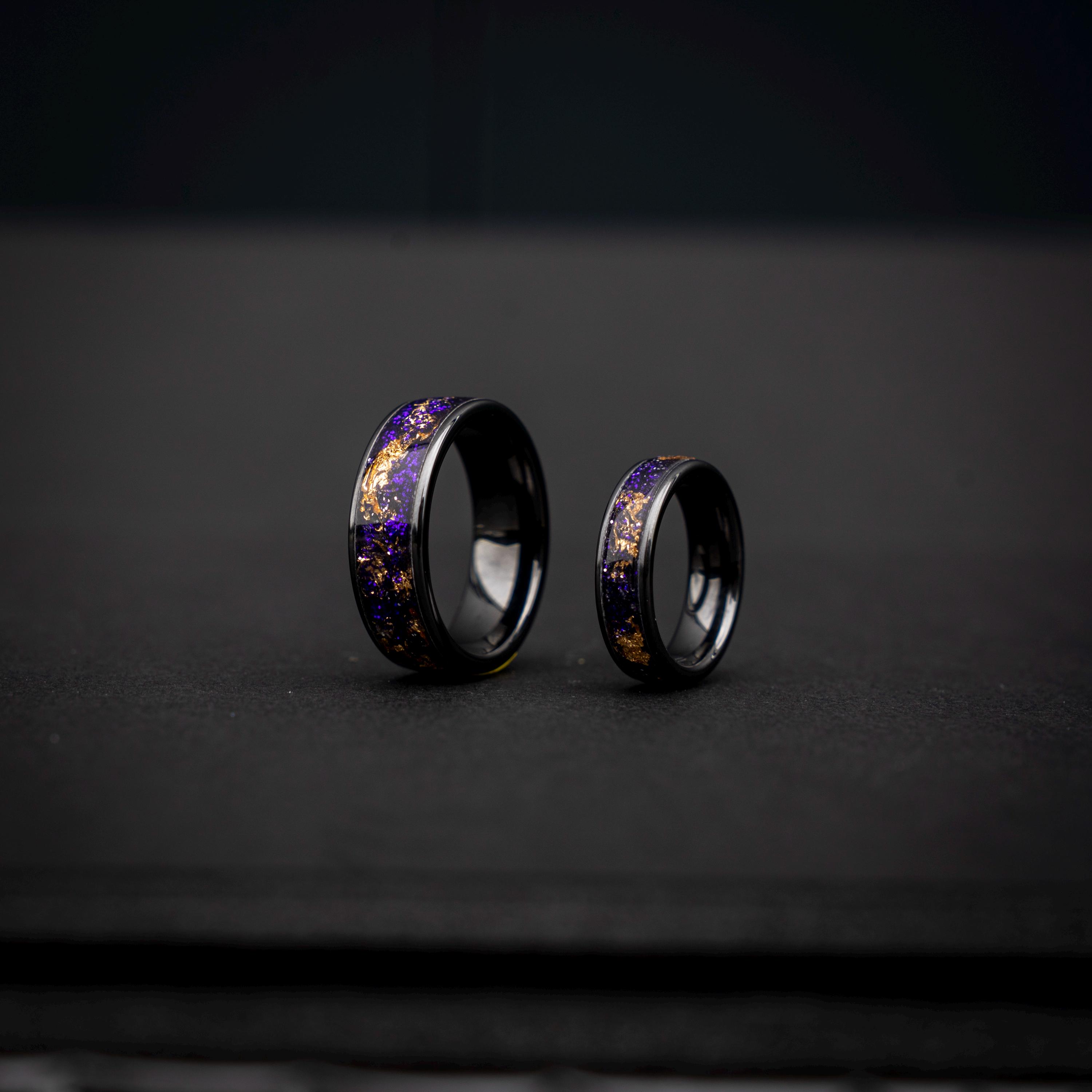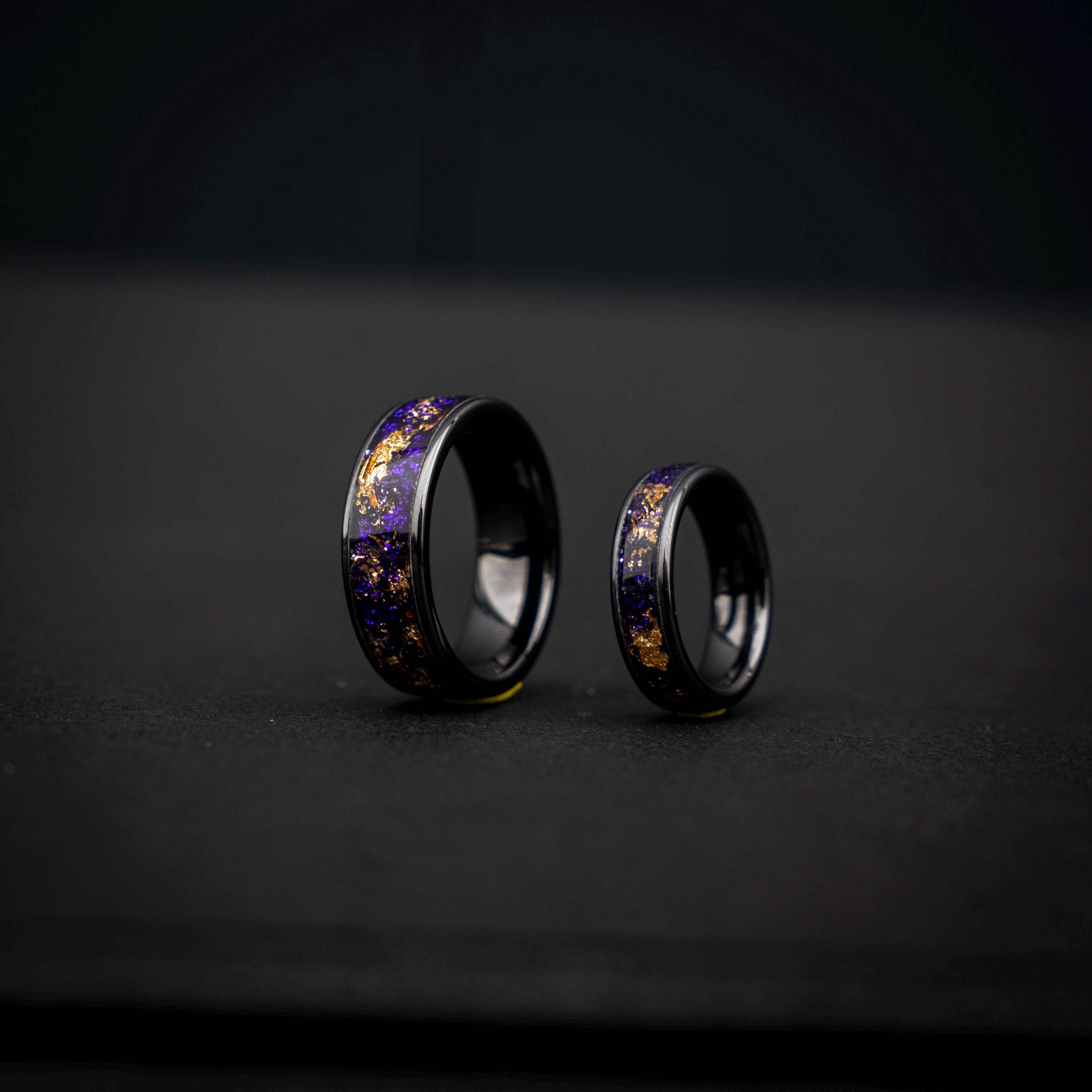 Black ceramic wedding ring set 8mm and 6mm with 18K gold leaf and purple galaxy dust.
