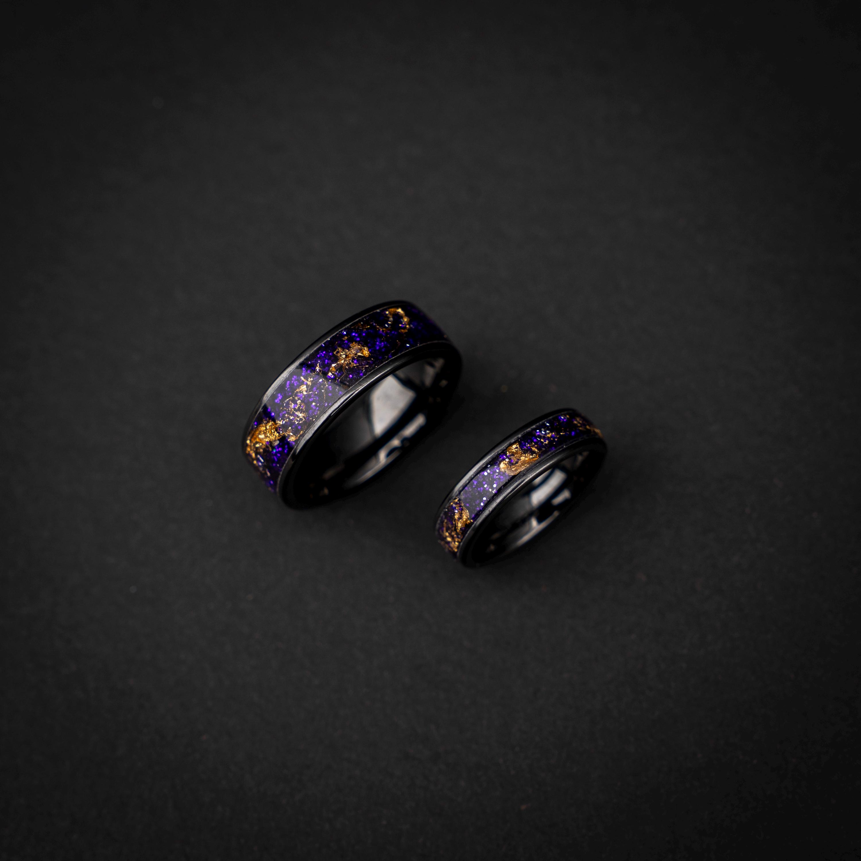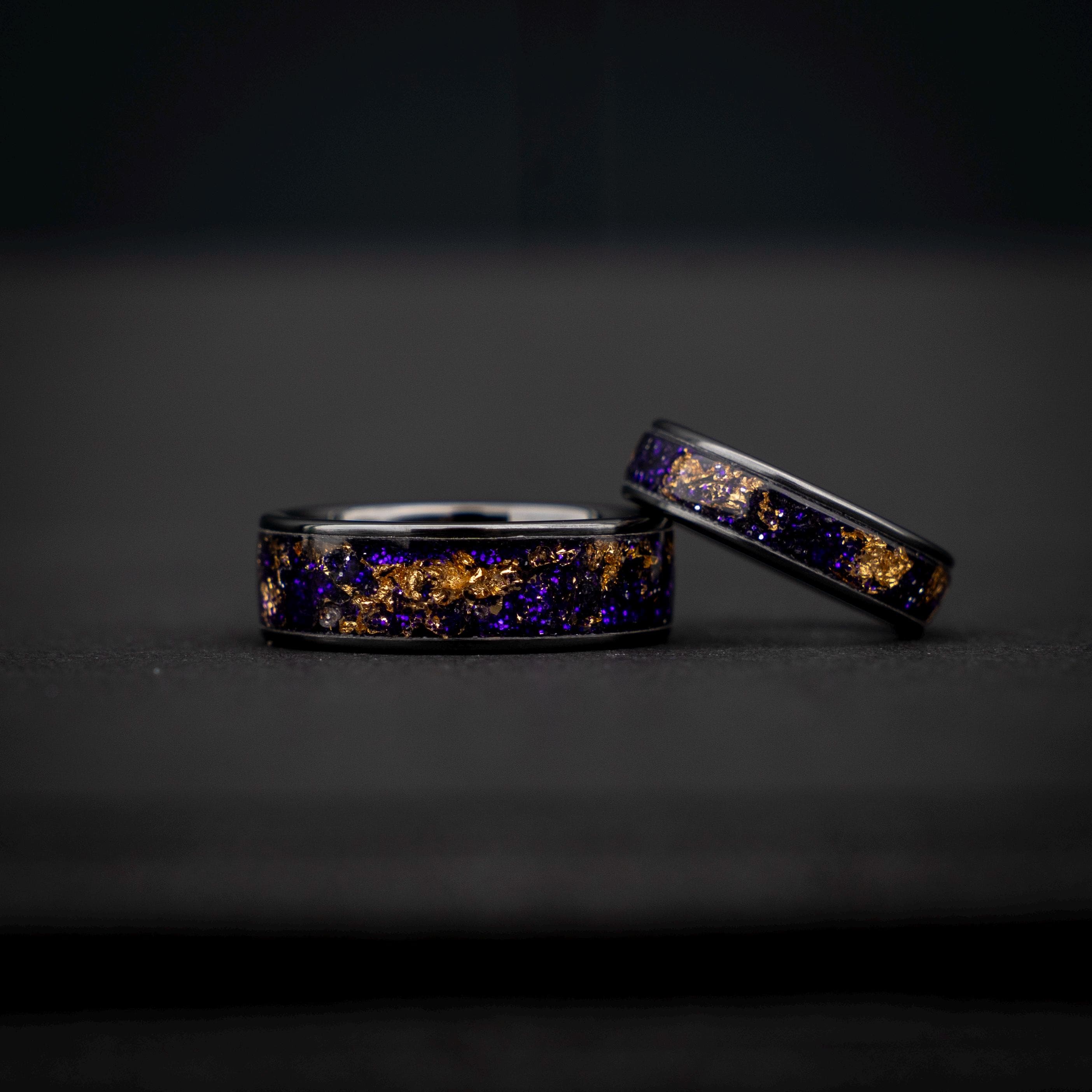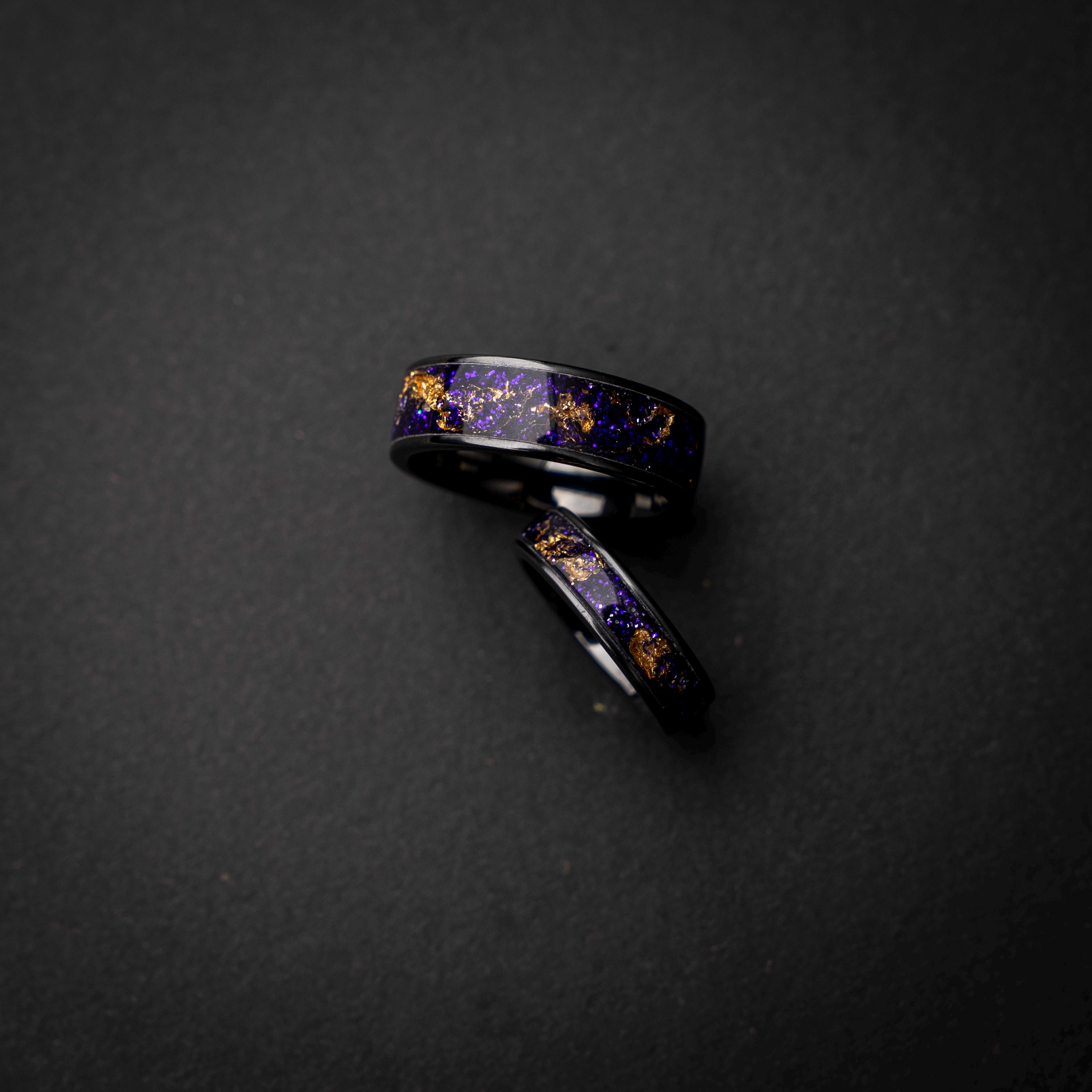Black ceramic wedding ring set 8mm and 6mm with 18K gold leaf and purple galaxy dust.