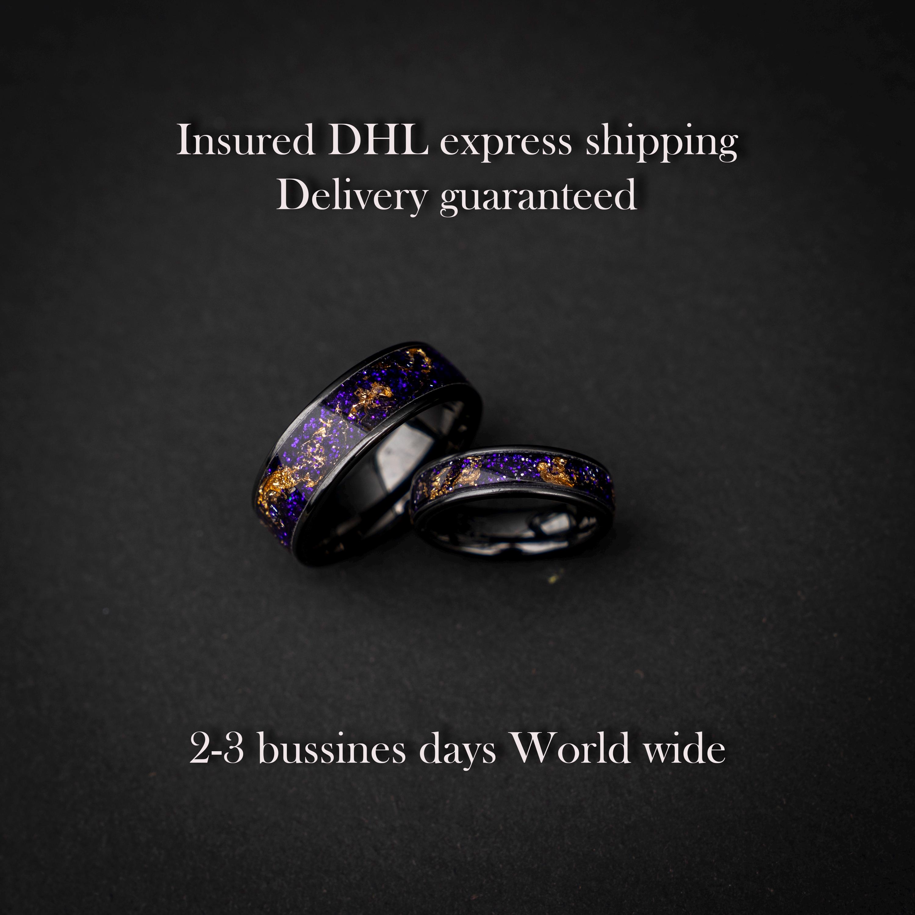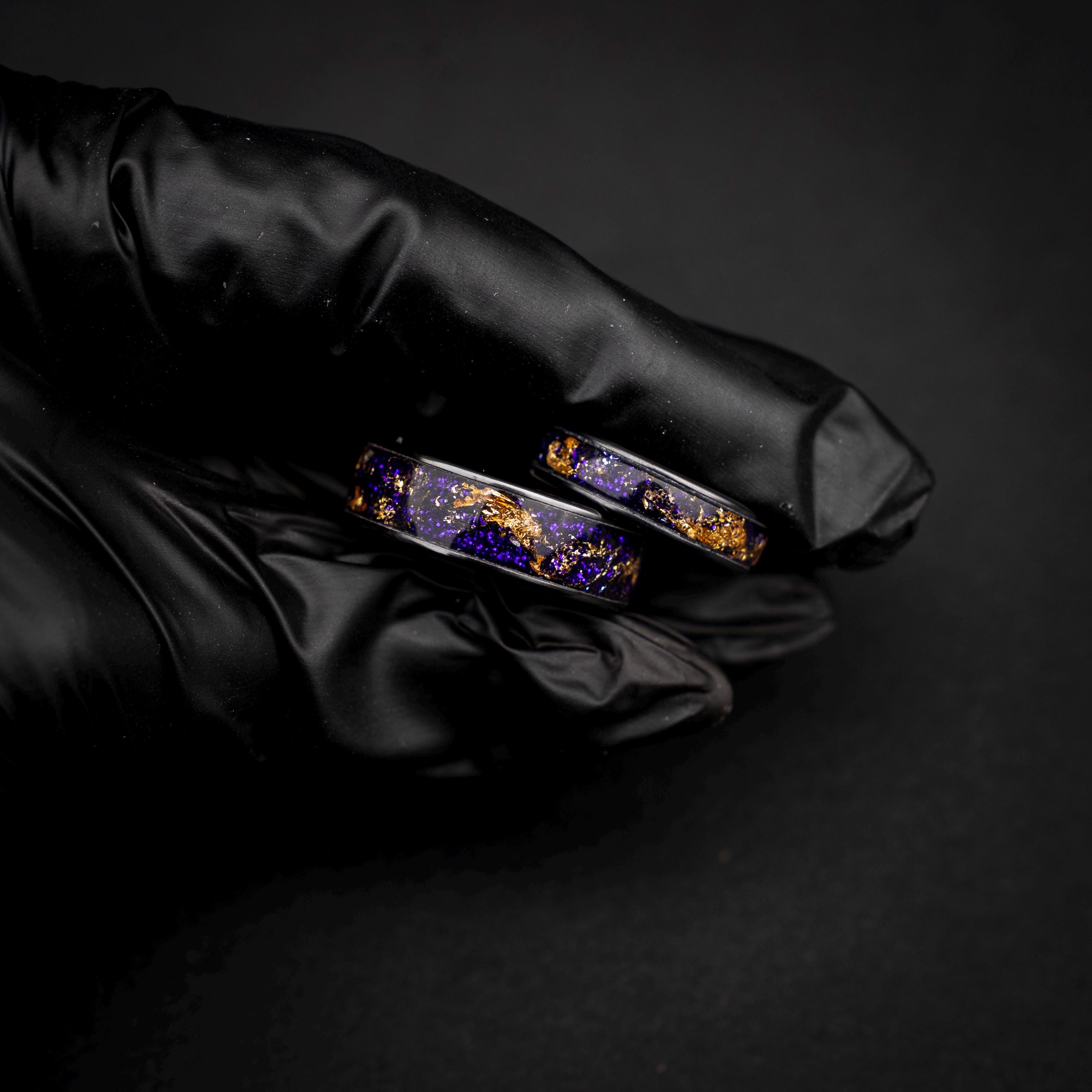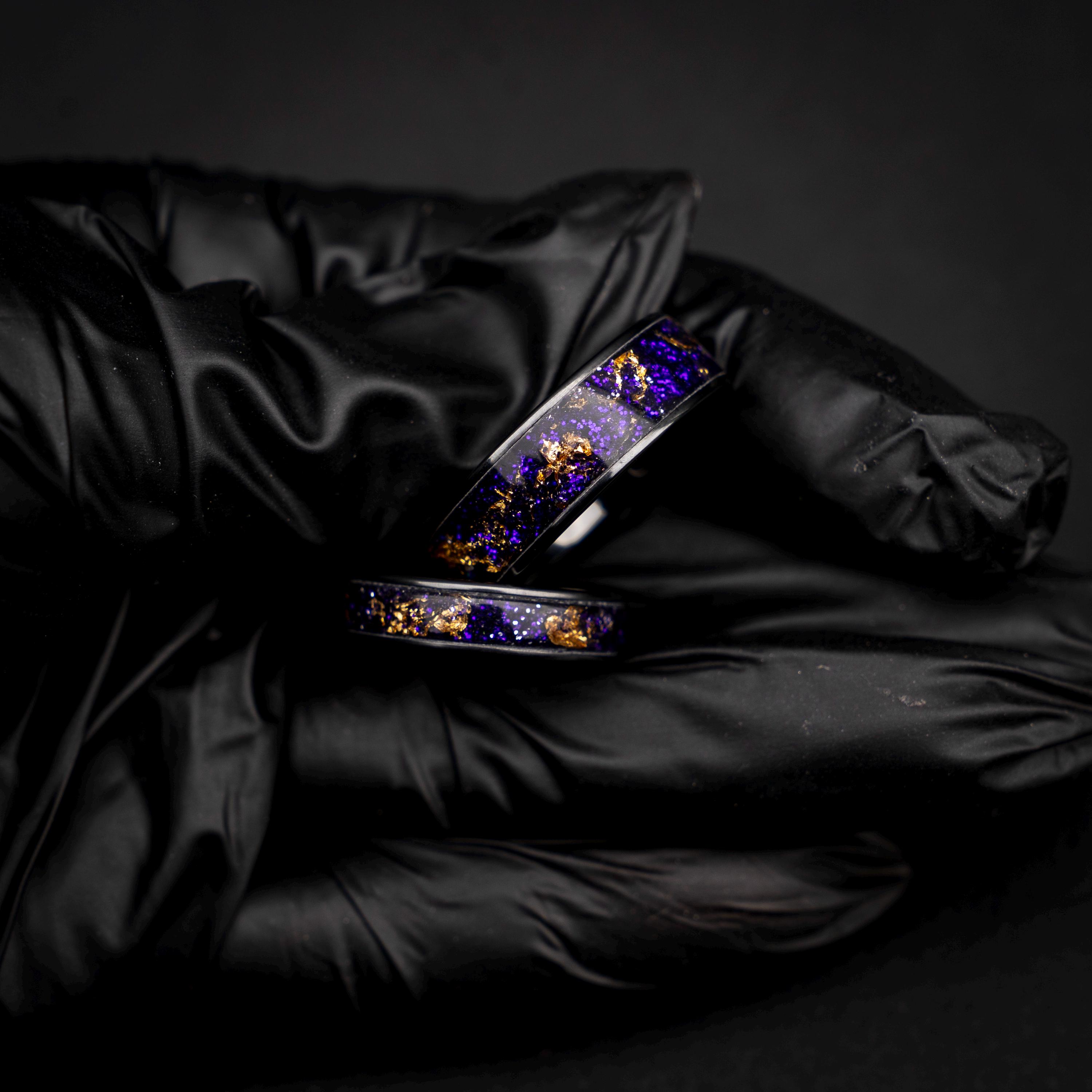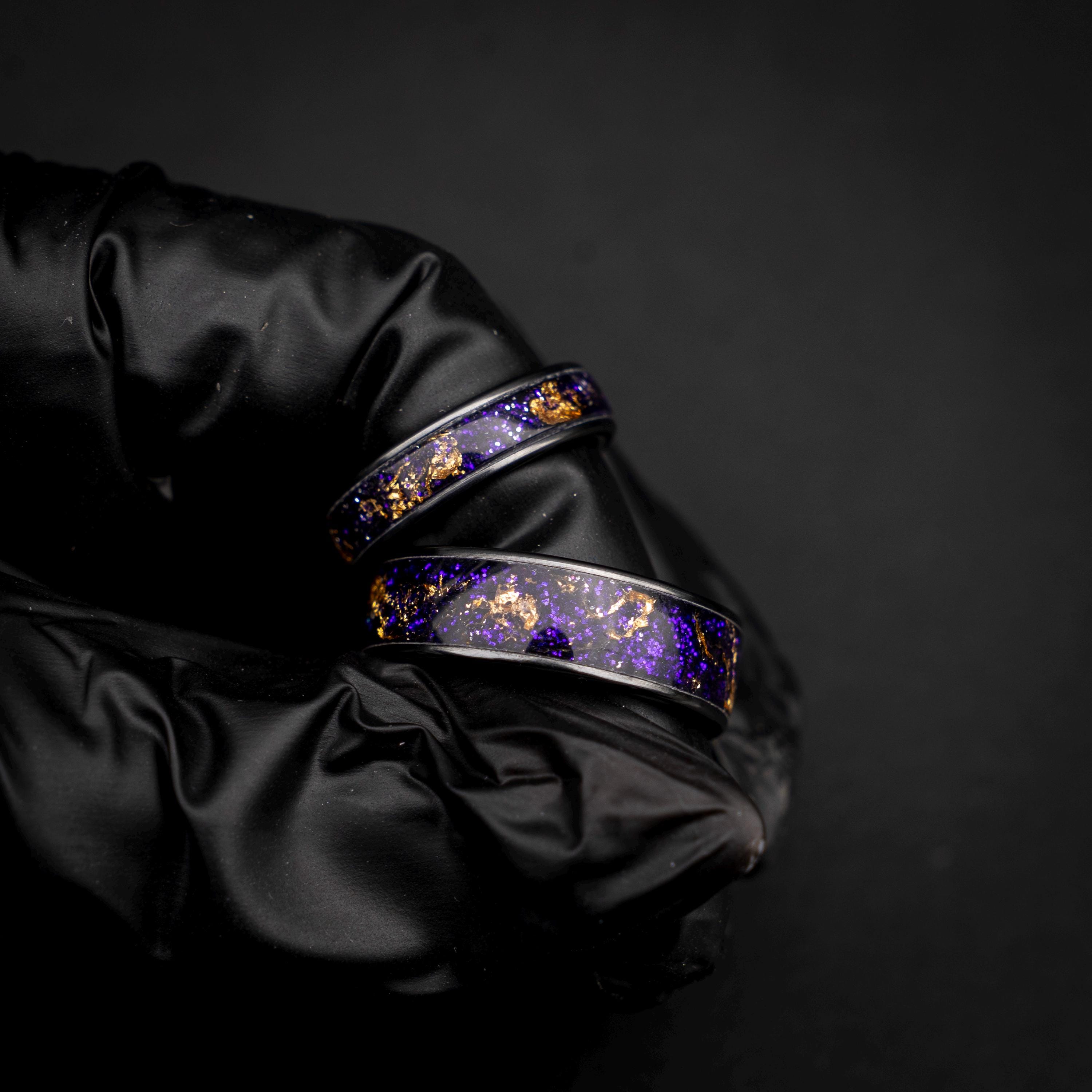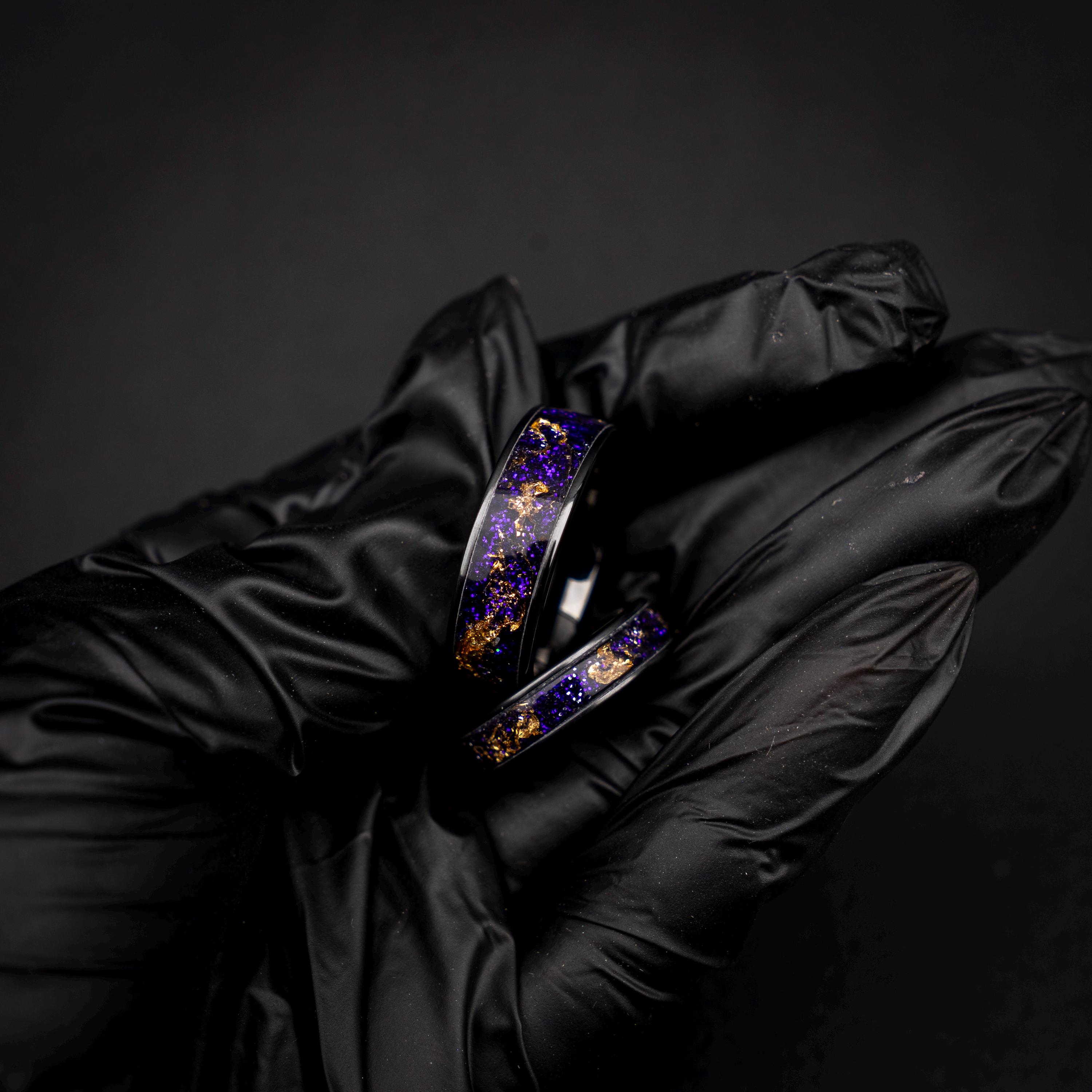 Step into a world of cosmic elegance with this handcrafted black ring, featuring a stunning inlay of deep purple opal and gold flakes. Designed for those who appreciate luxury and individuality, this ring captures the beauty of the universe in a sleek, modern band.