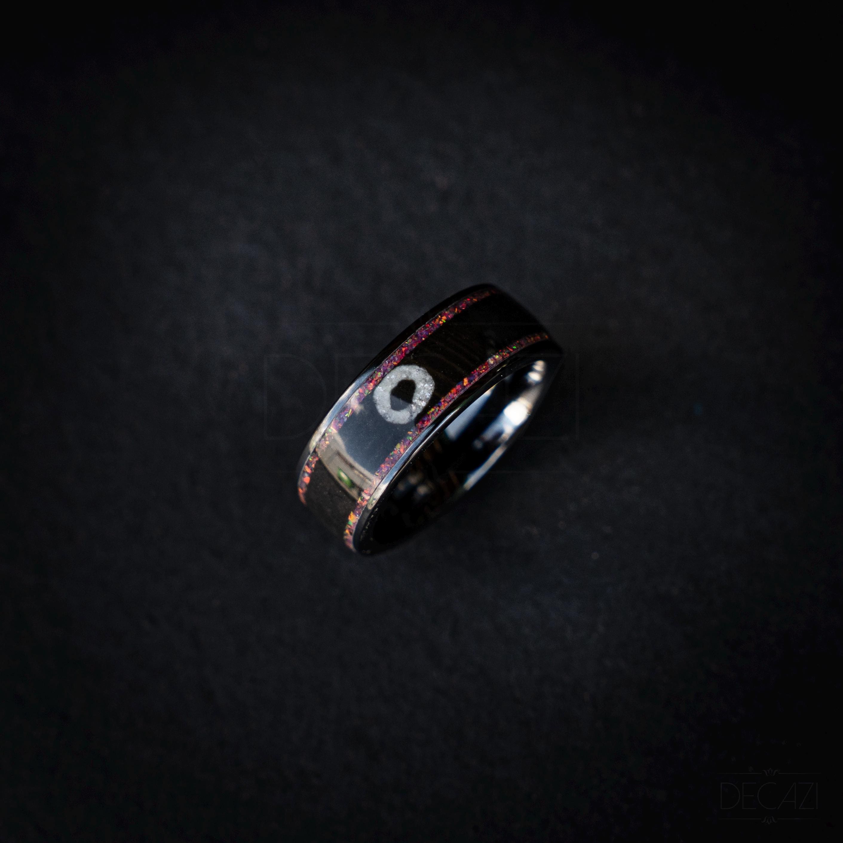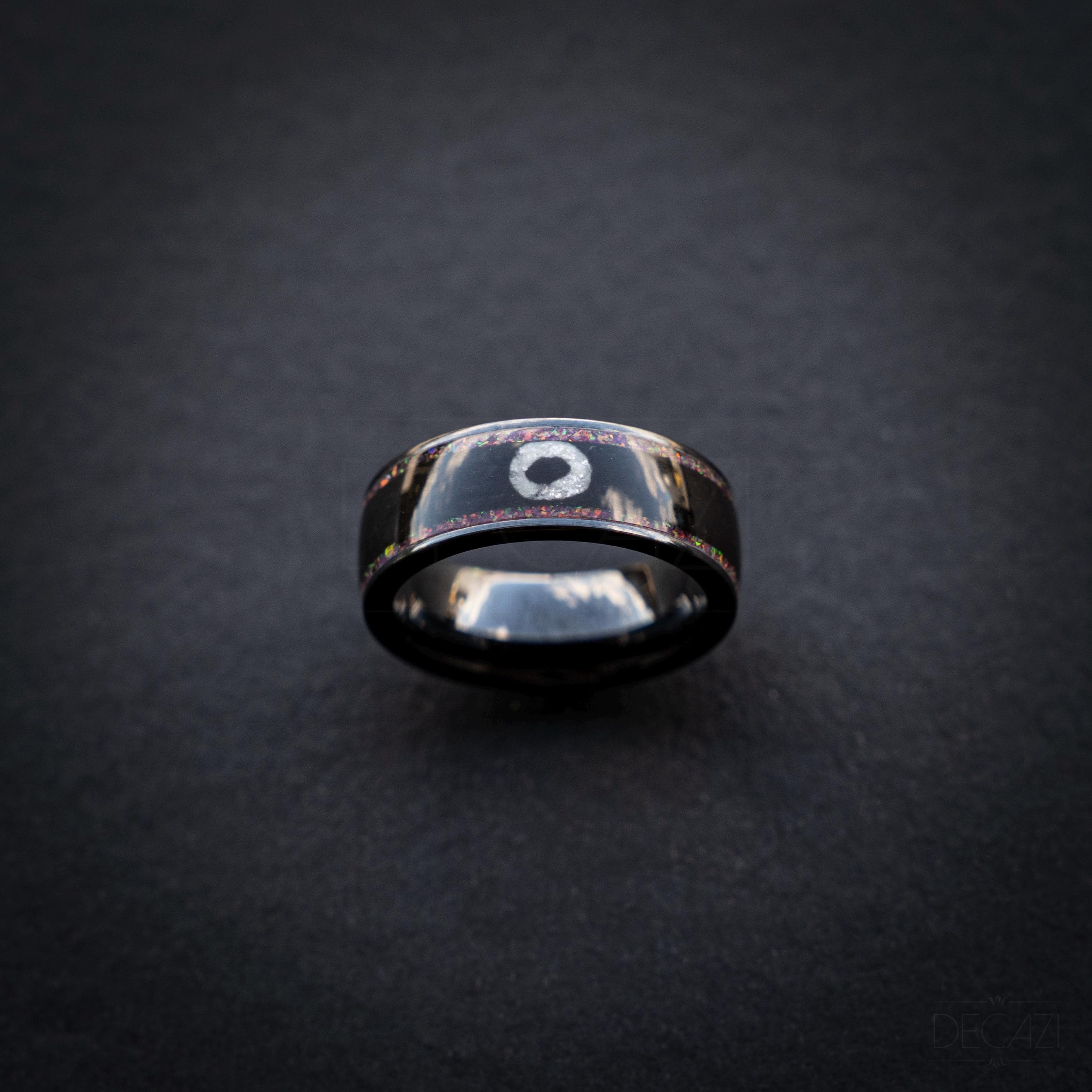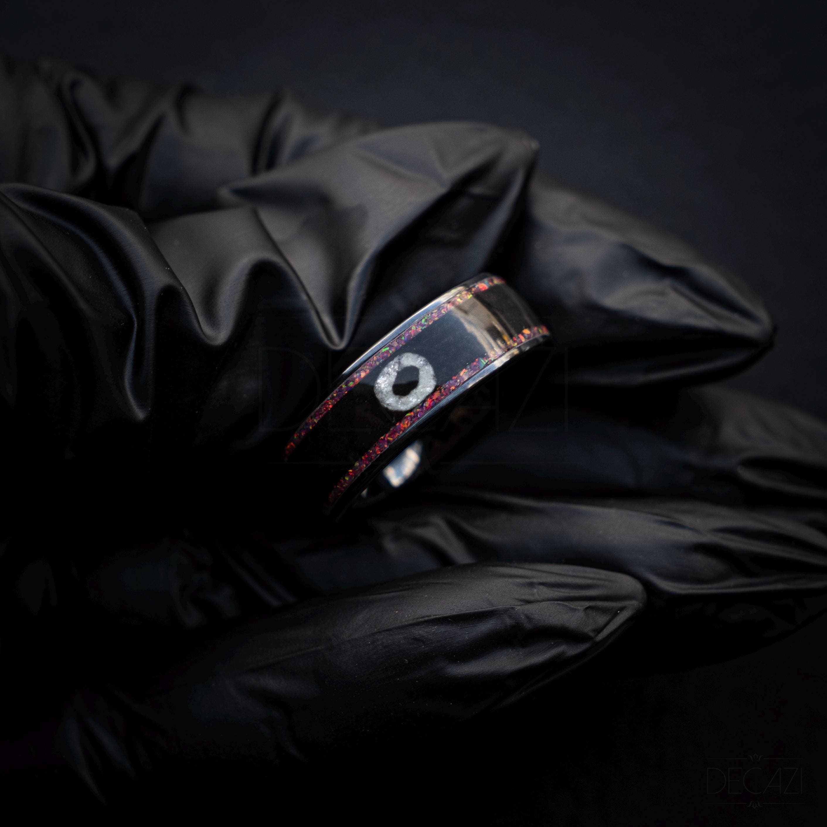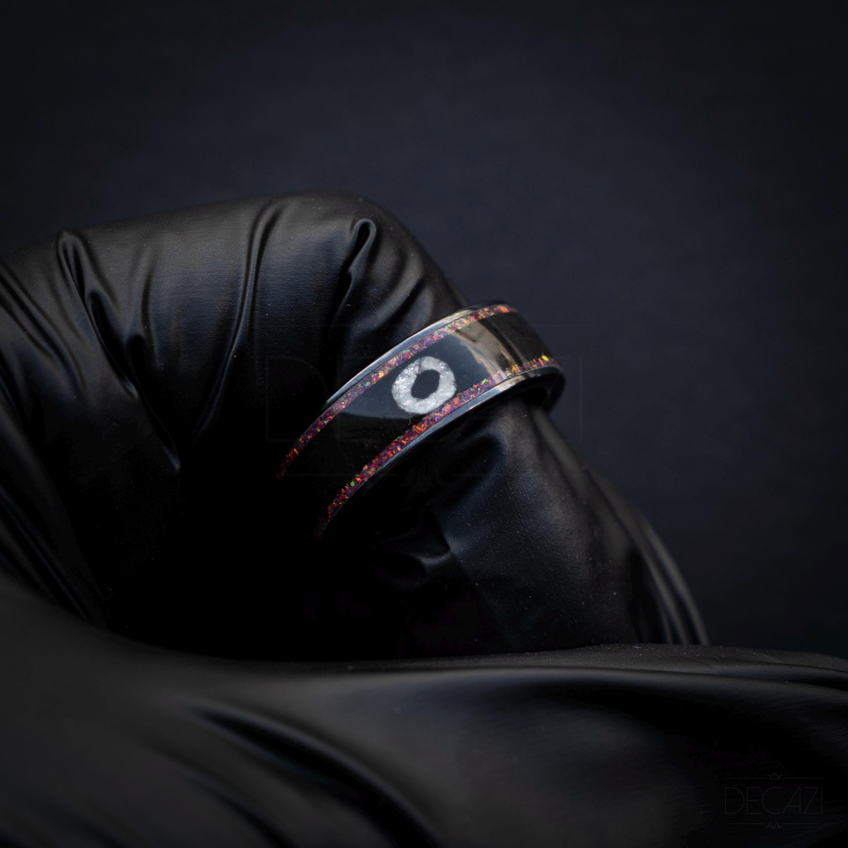 Black Ring with Pink Opal and White Circle Symbol – Geometric Aesthetic Jewelry, Subtle Fandom Jewelry, Drama, Geometric Gamer