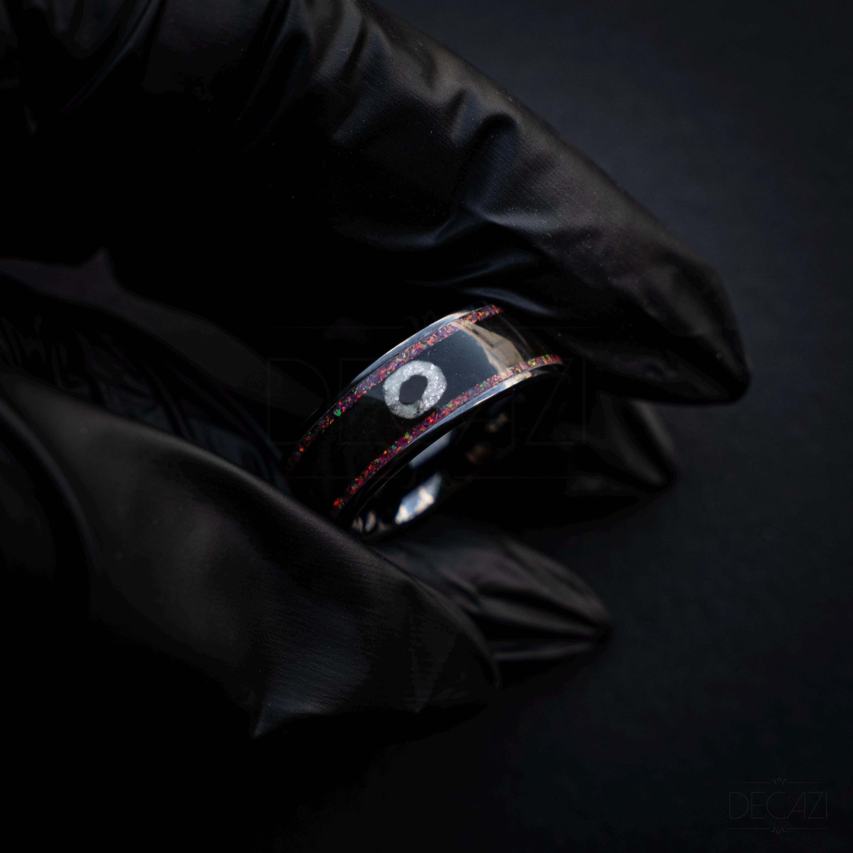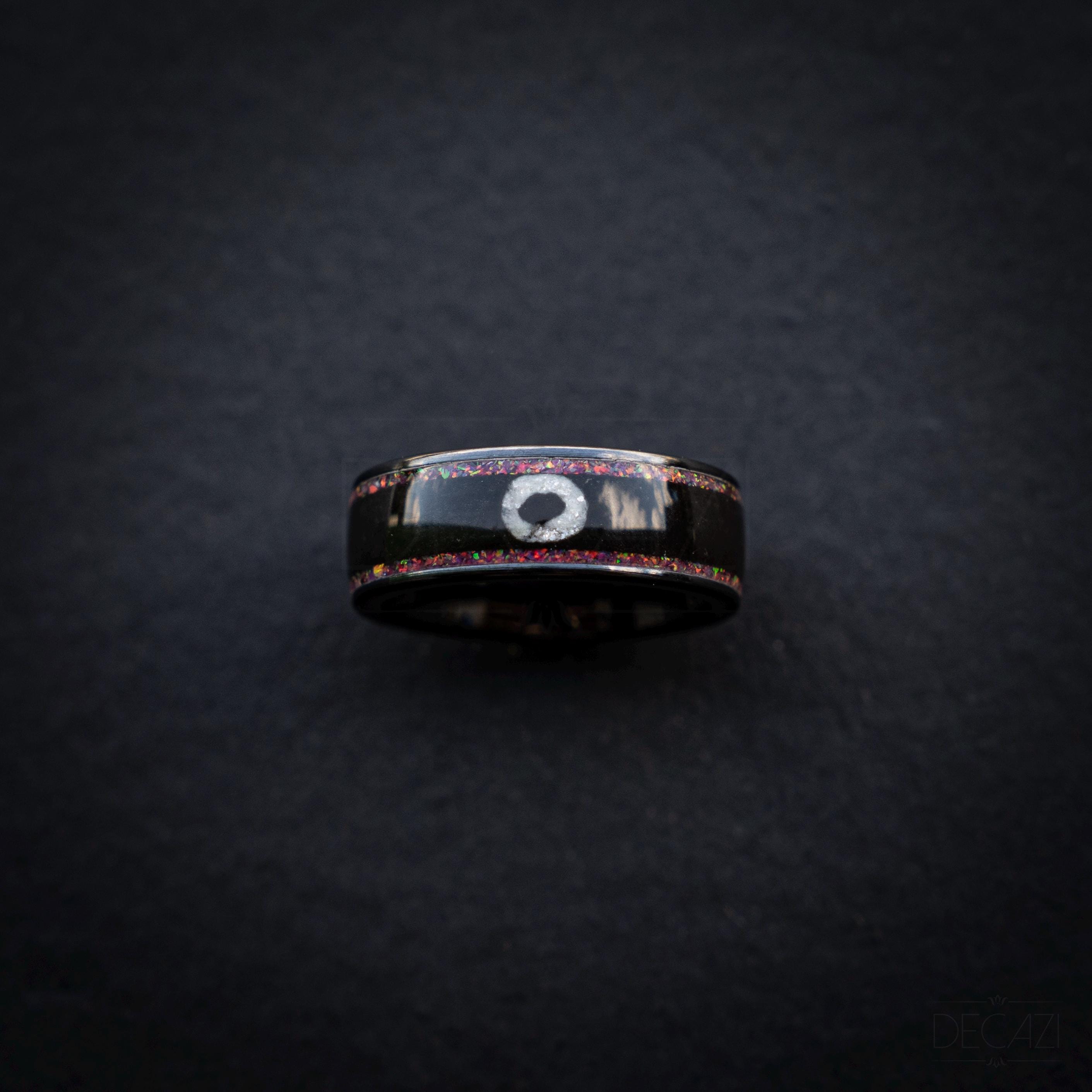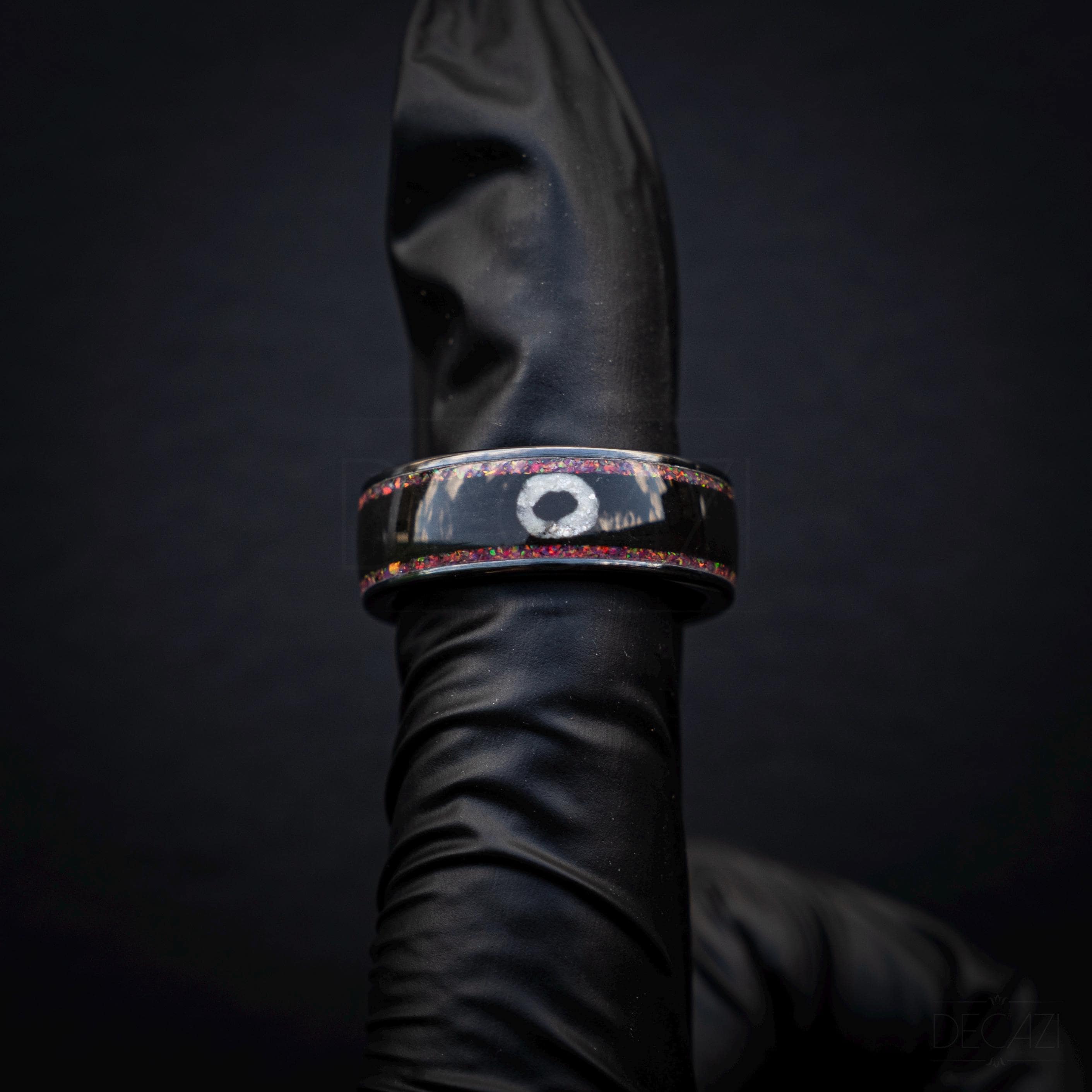 Elegant with a touch of mystery — this black statement ring showcases a shimmering pink opal and a clean white circle symbol, creating a minimalist yet eye-catching design. Perfect for lovers of geometric shapes, subtle symbolism, and dark modern aesthetics.