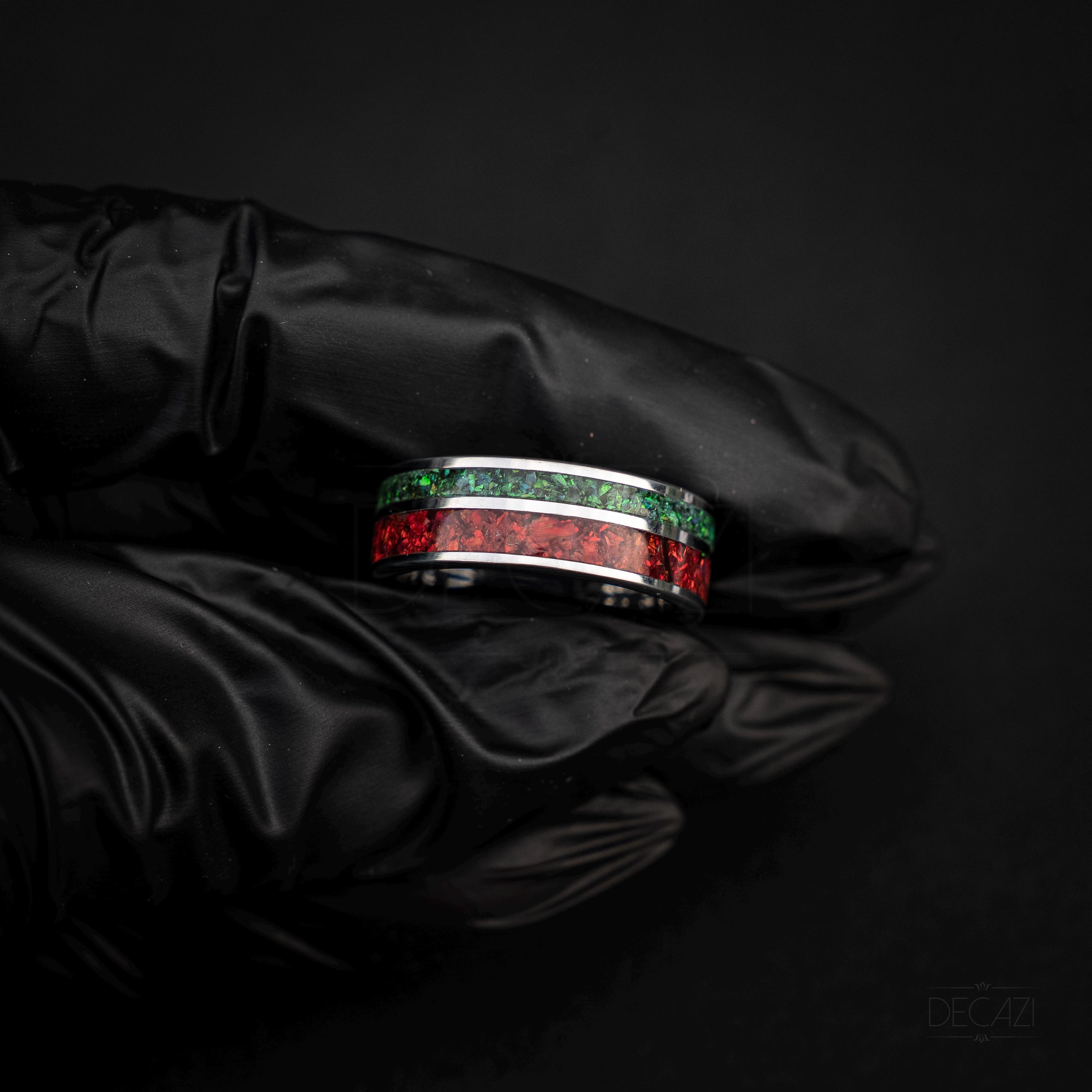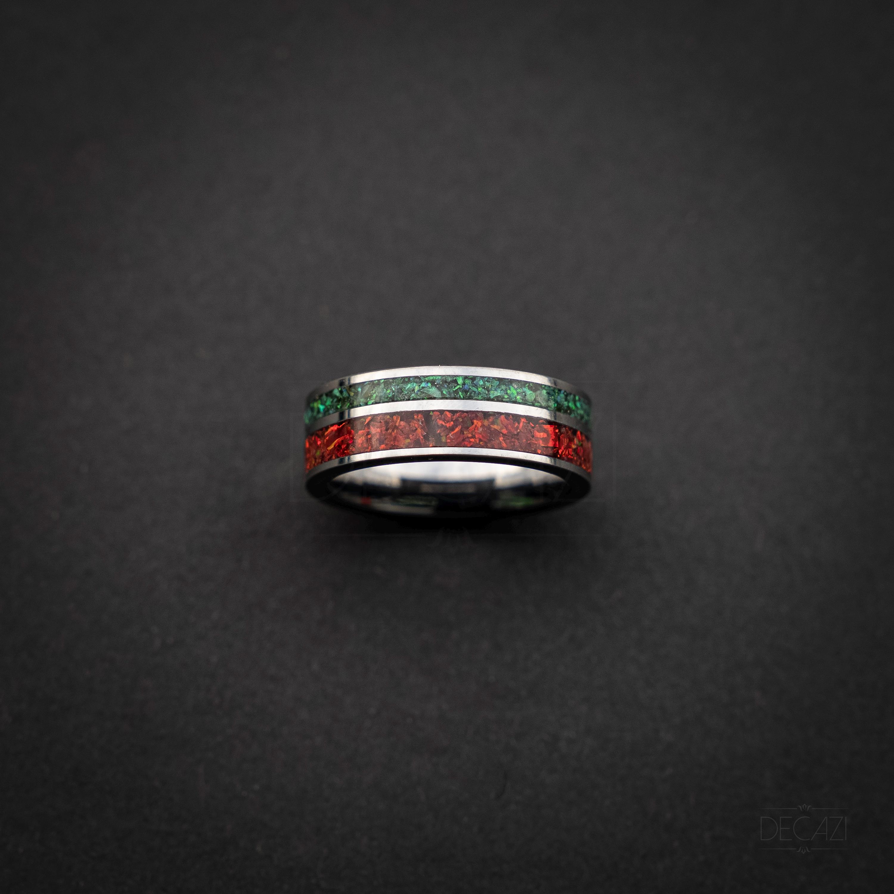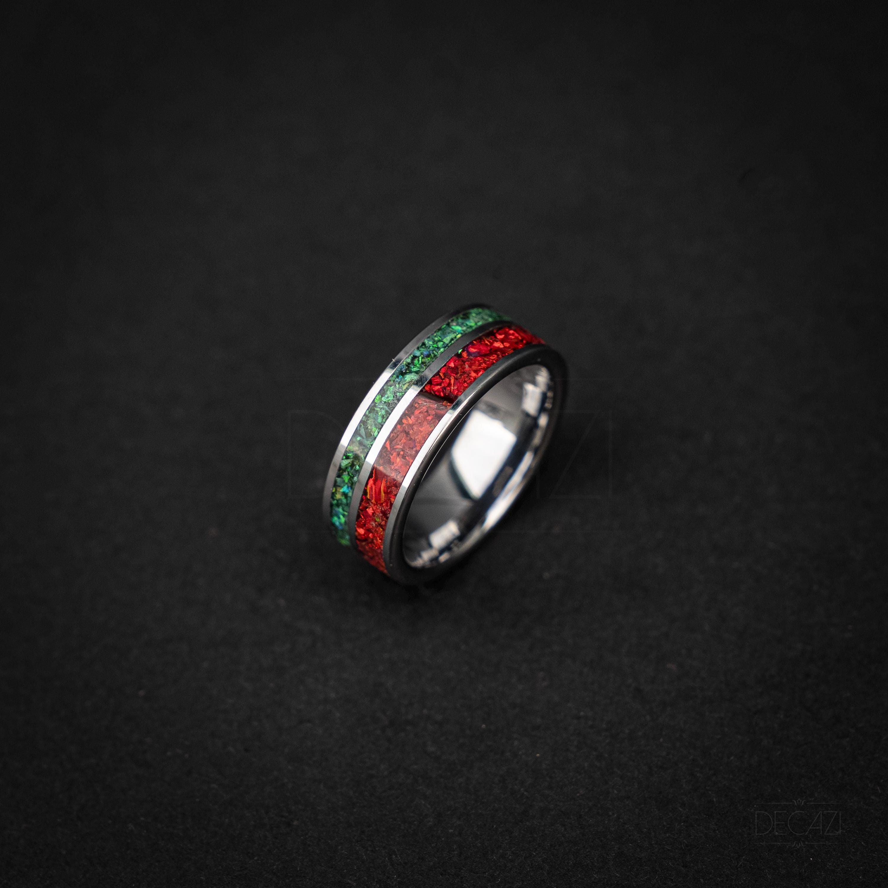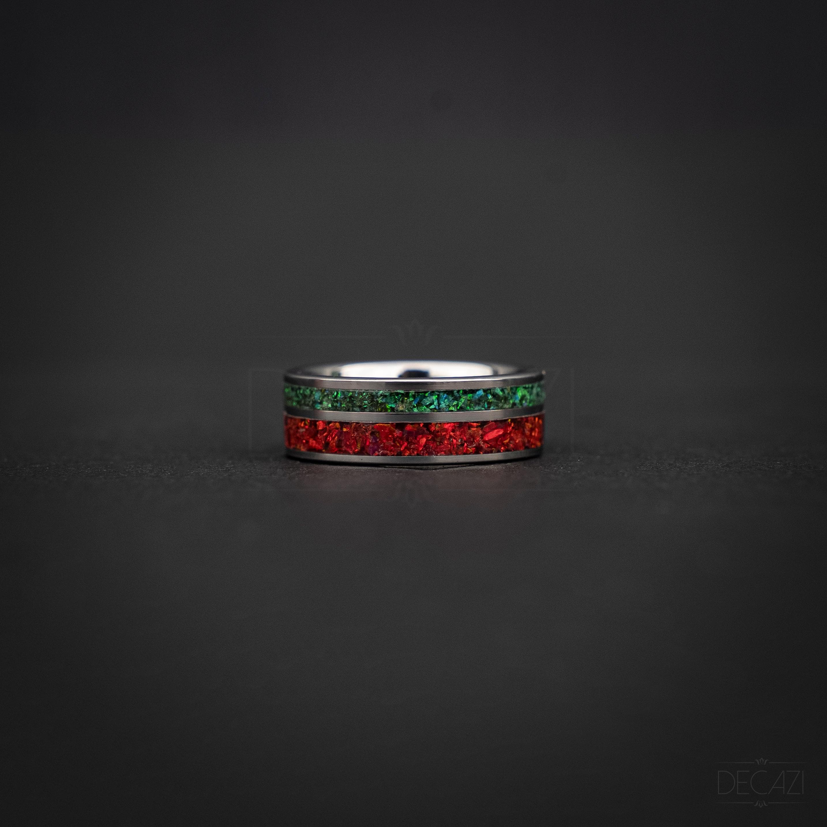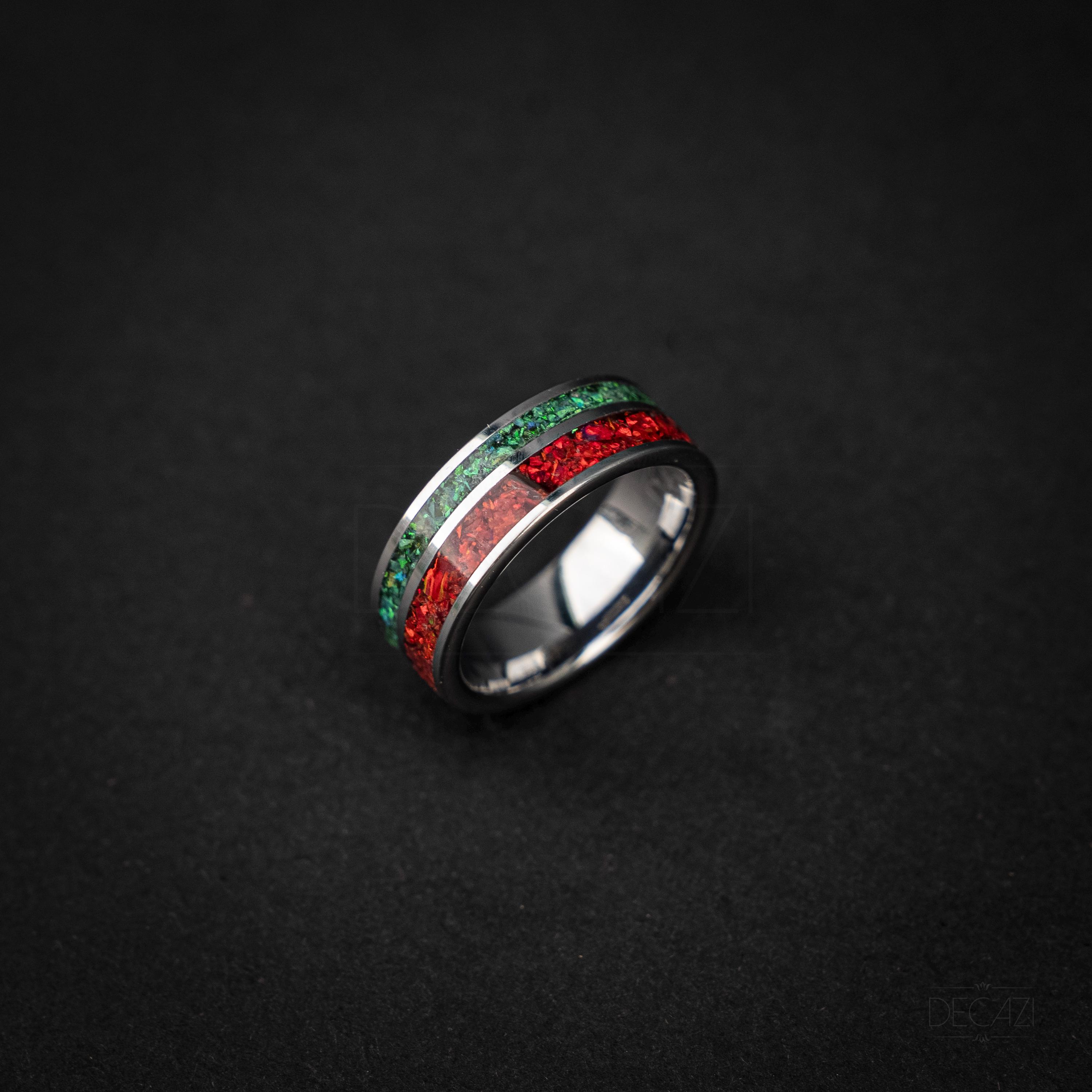 Celebrate the holiday season with this stunning tungsten Christmas ring, featuring two vibrant inlays filled with shimmering green and red opal. The rich colors of the opal catch the light beautifully, creating a warm, festive glow reminiscent of holiday lights and Christmas décor.
