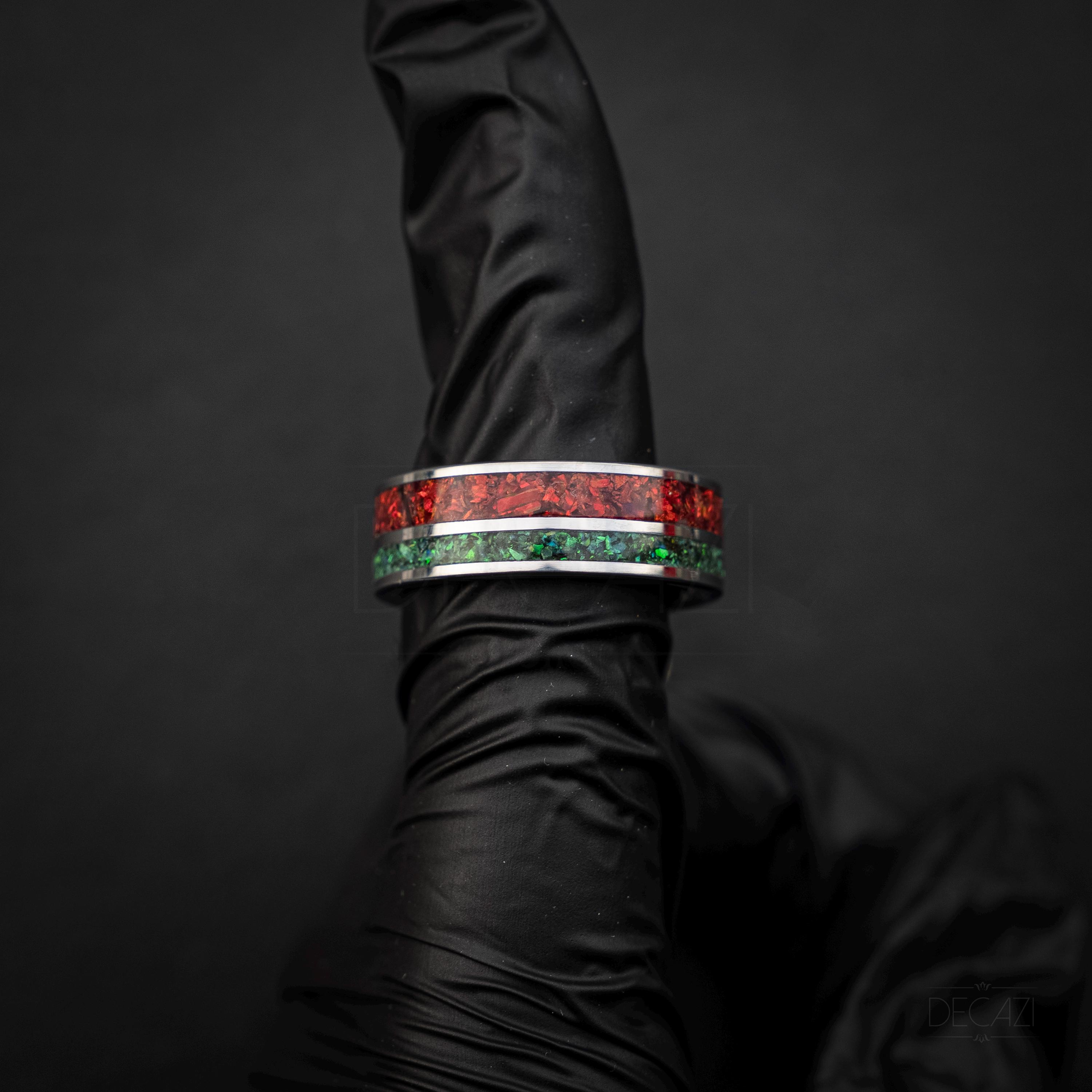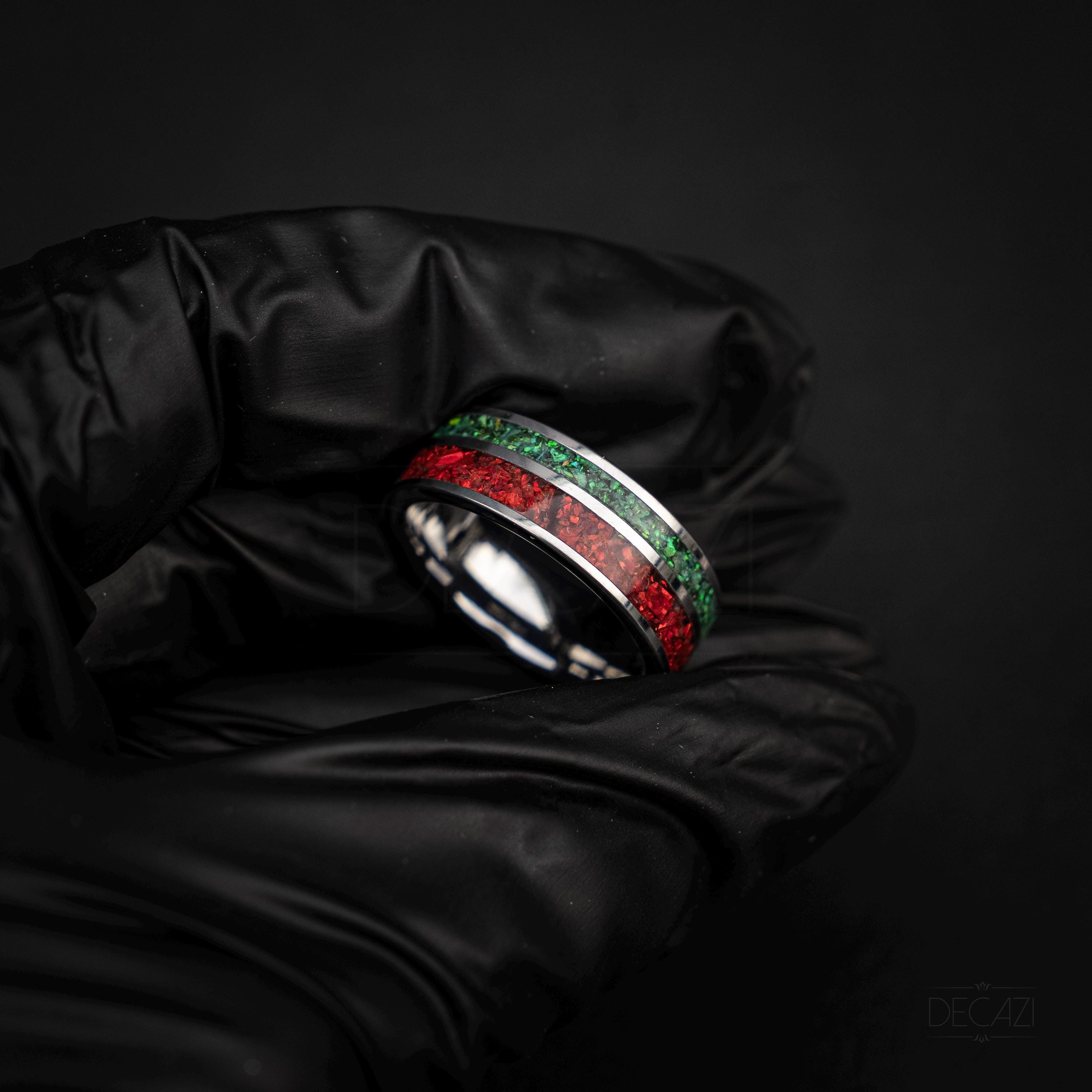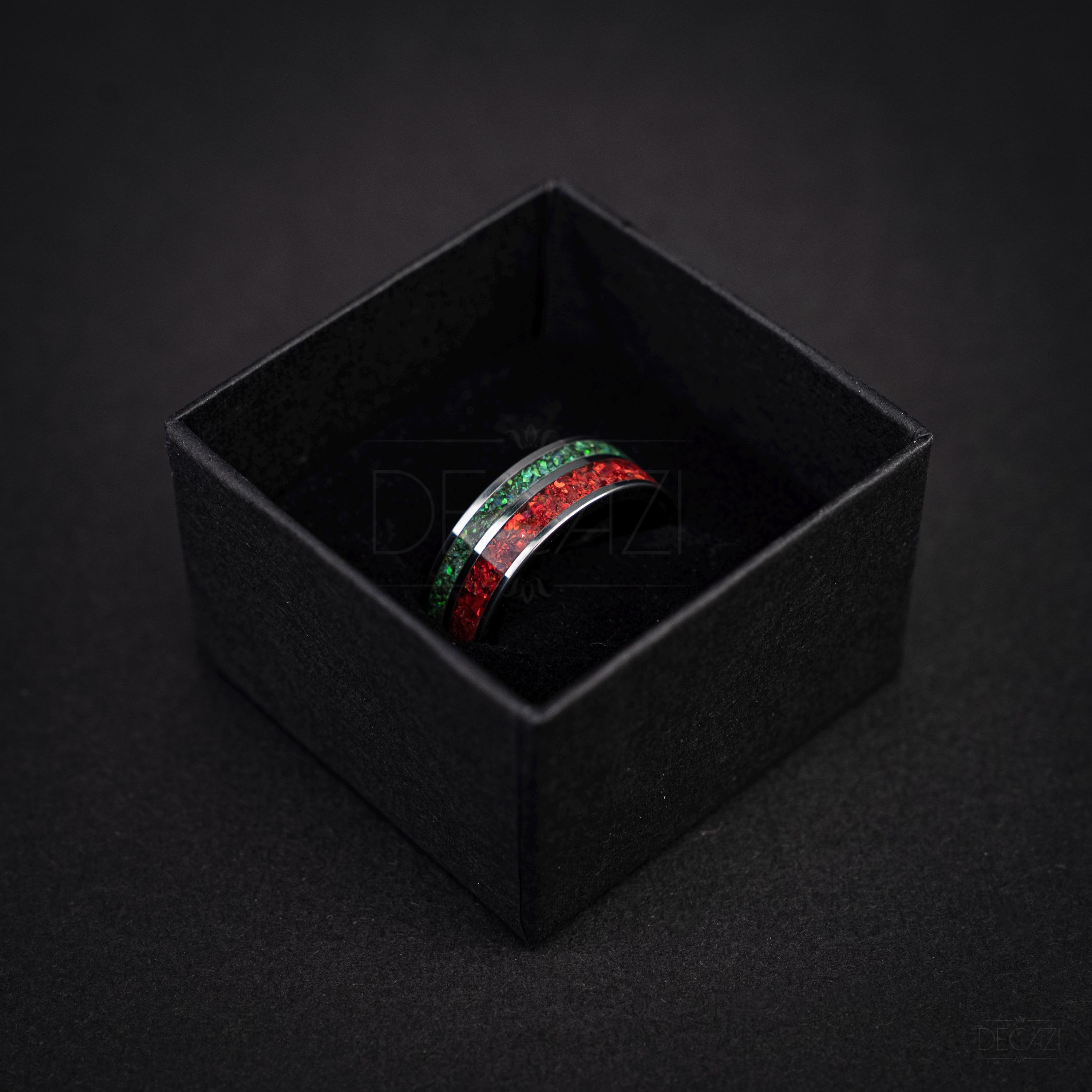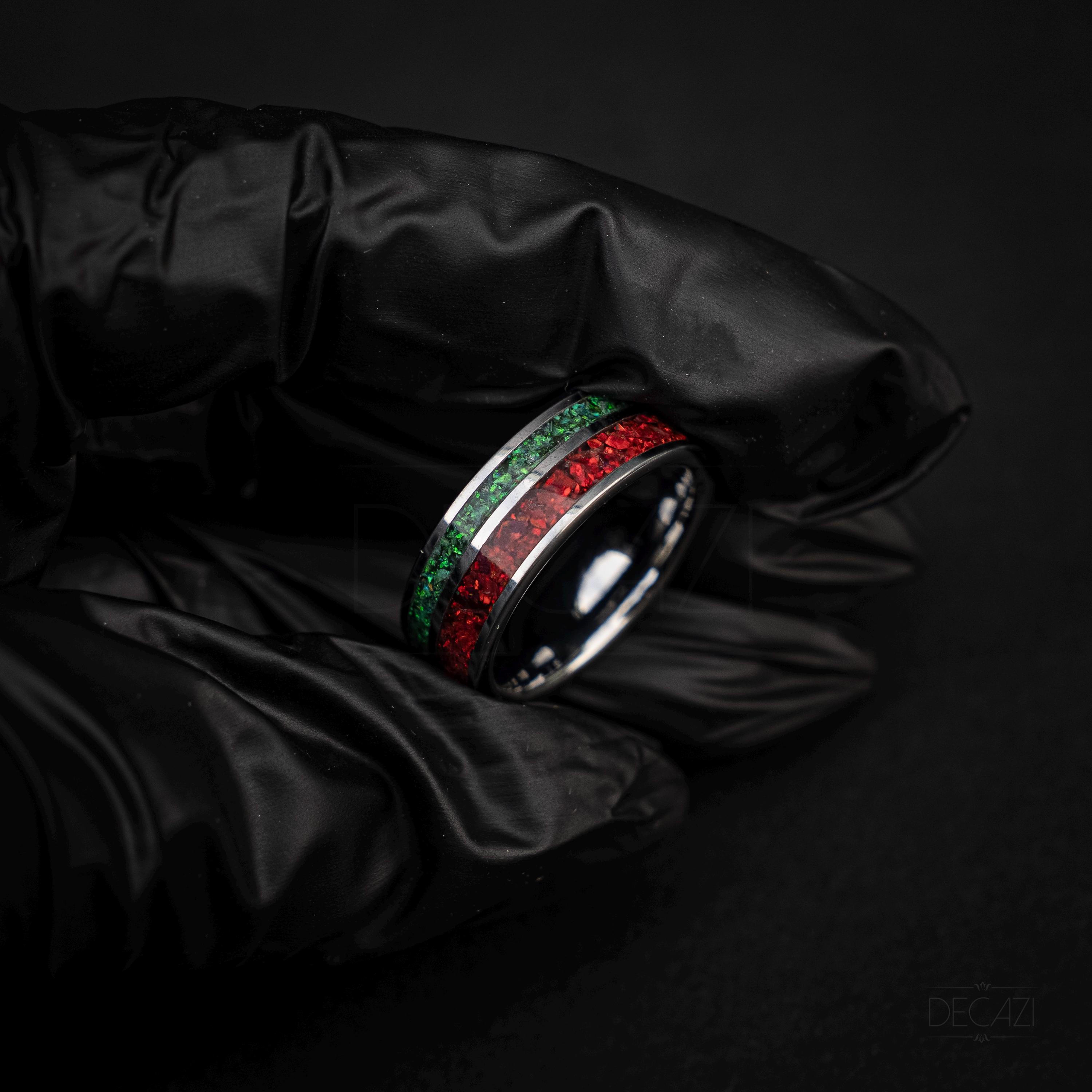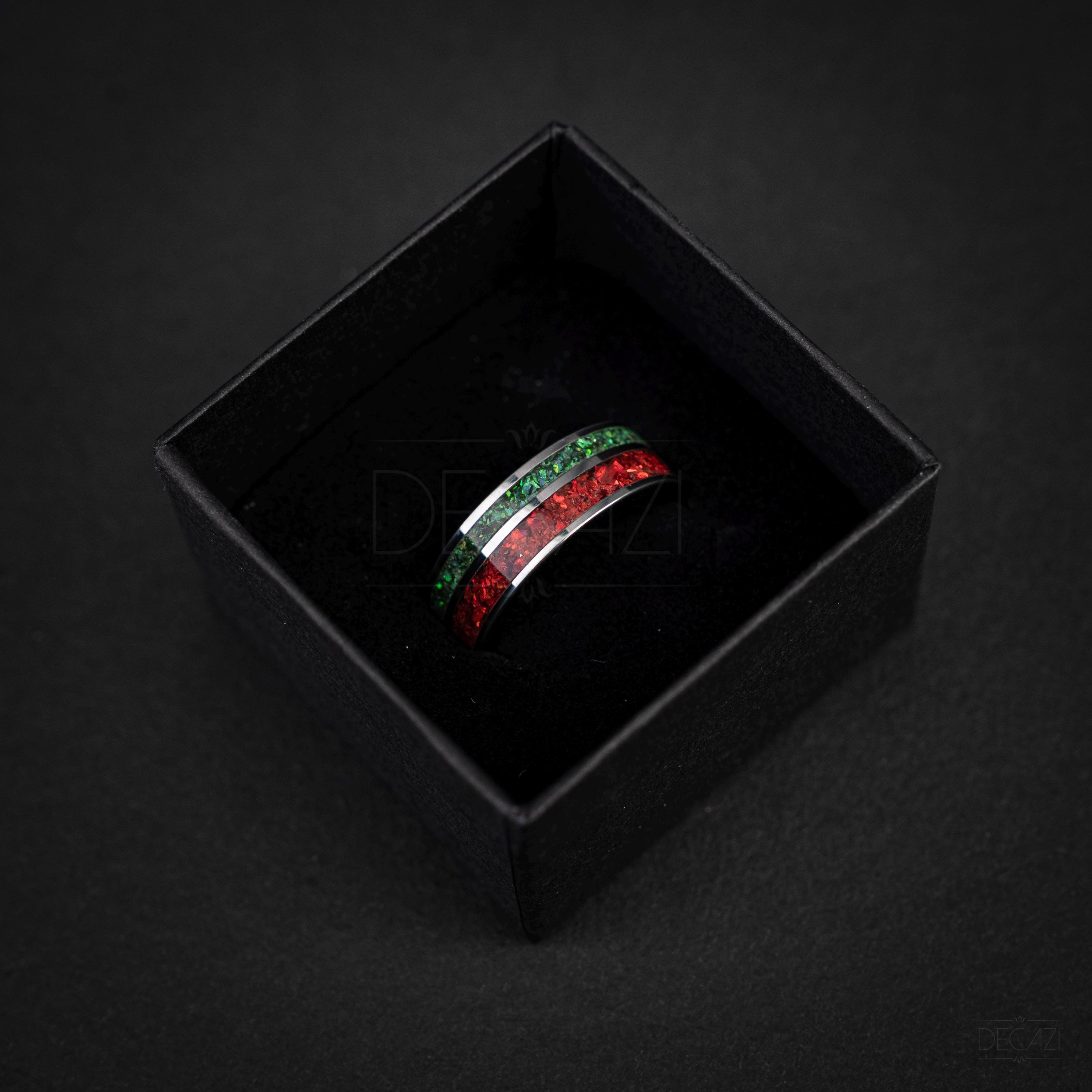 Celebrate the holiday season with this stunning tungsten Christmas ring, featuring two vibrant inlays filled with shimmering green and red opal. The rich colors of the opal catch the light beautifully, creating a warm, festive glow reminiscent of holiday lights and Christmas décor.