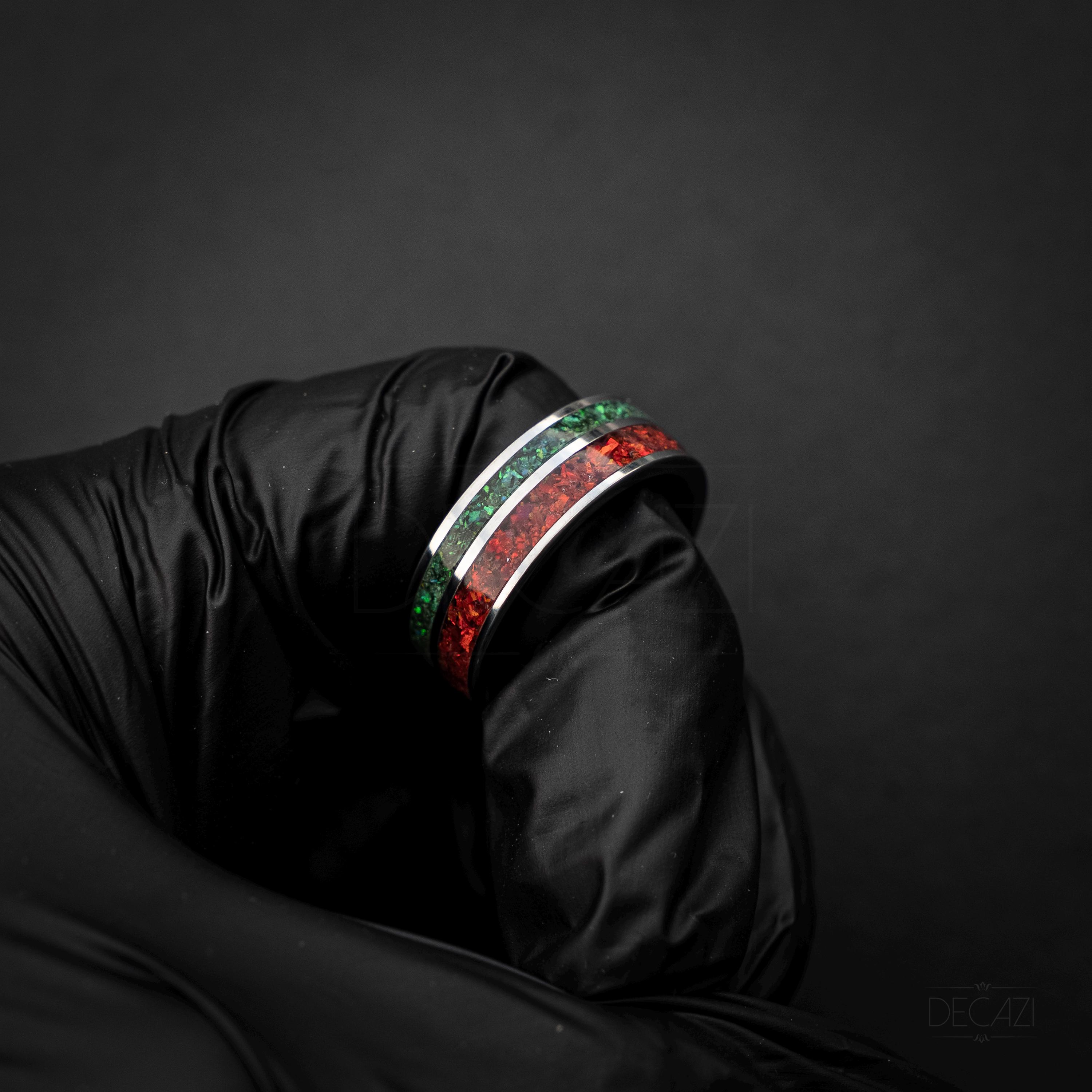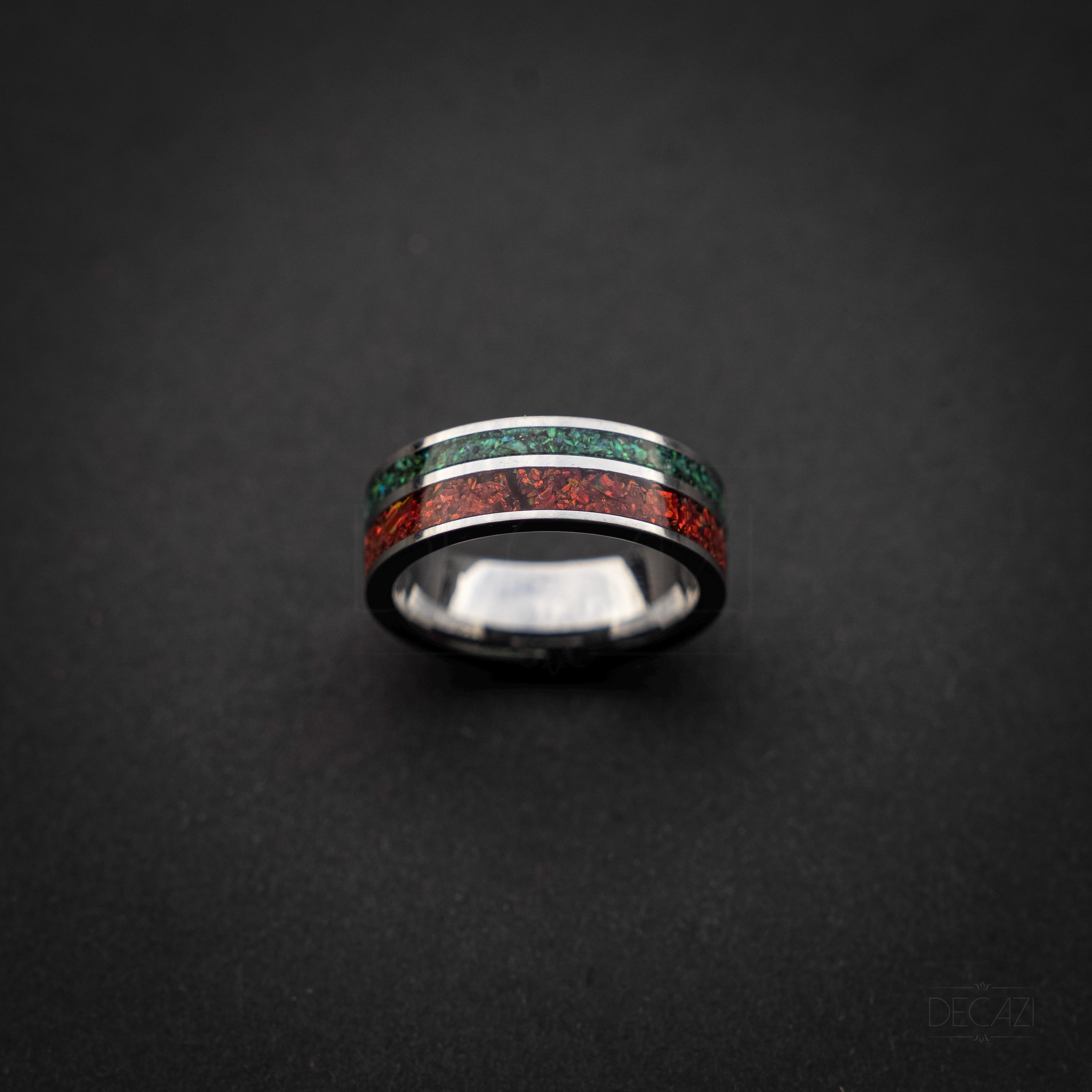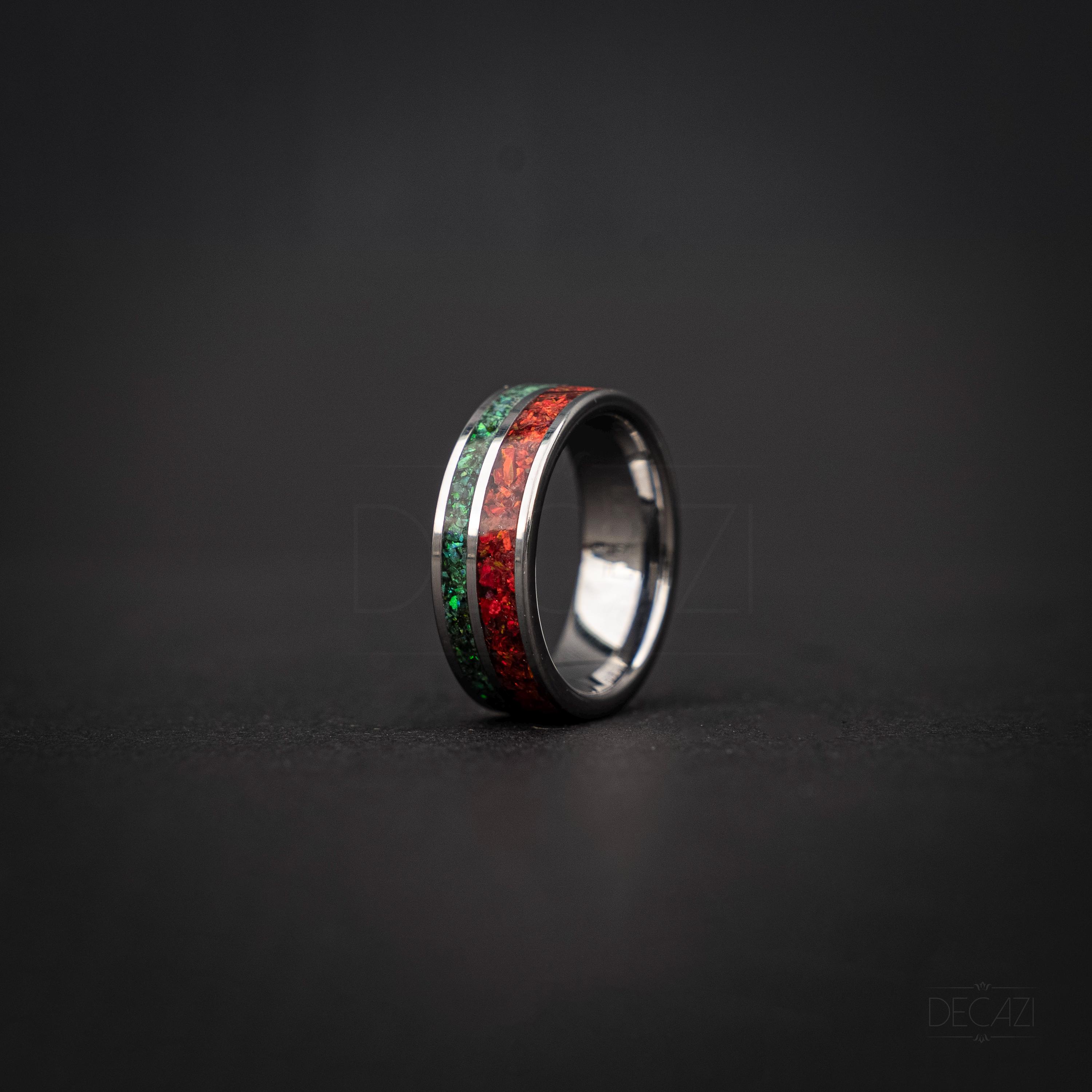 Tungsten Christmas Ring with Dual Green & Red Opal Inlays – Festive Holiday Band, Shimmering Opal Jewelry, Christmas Gift for Him or Her