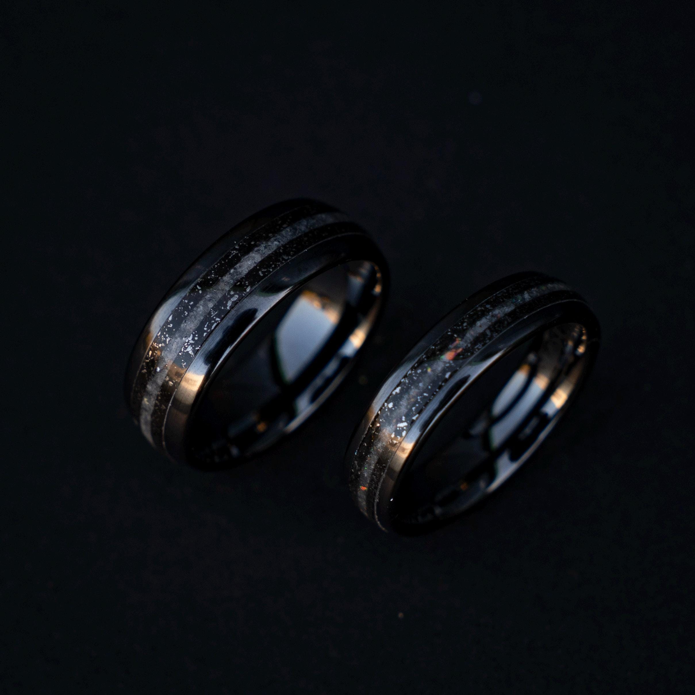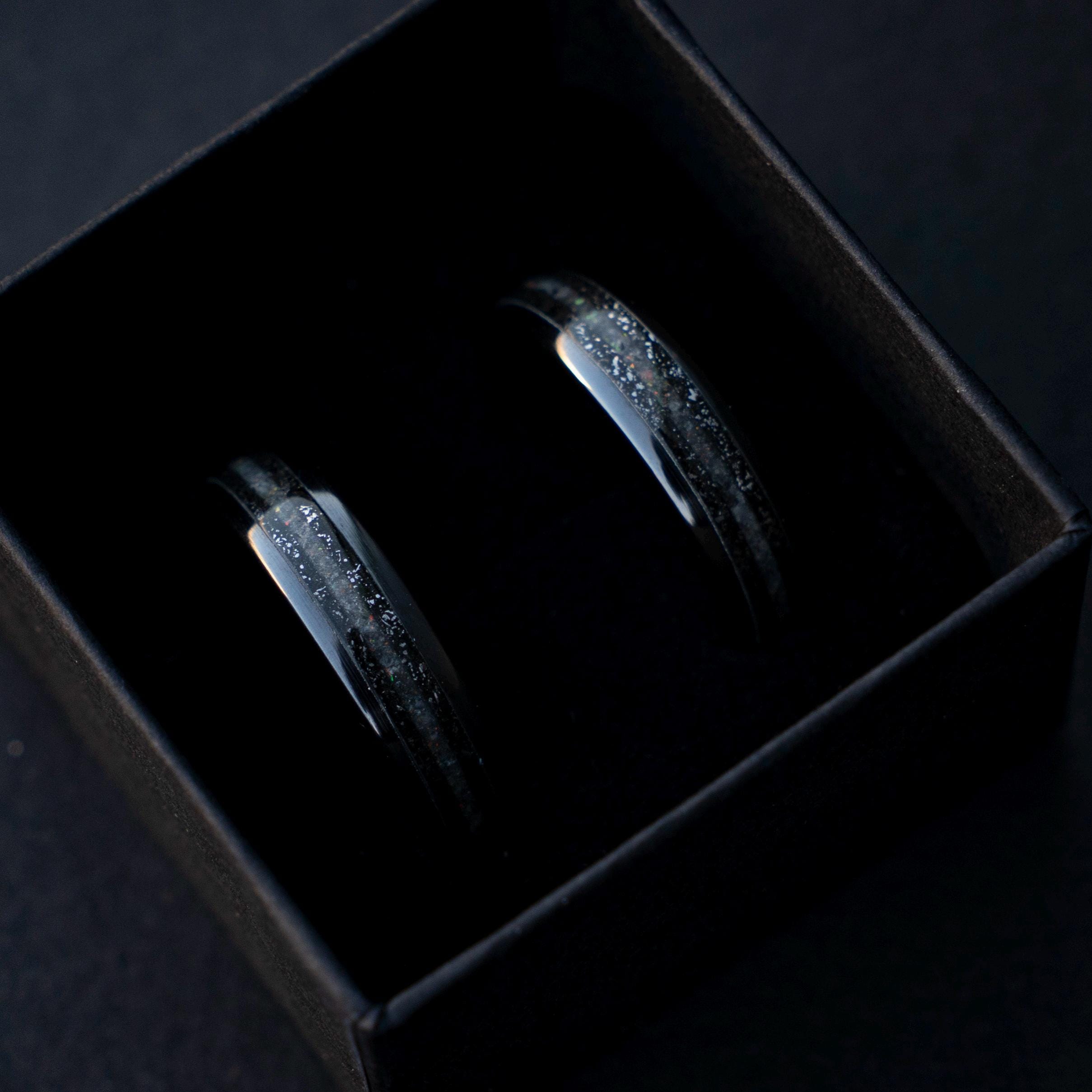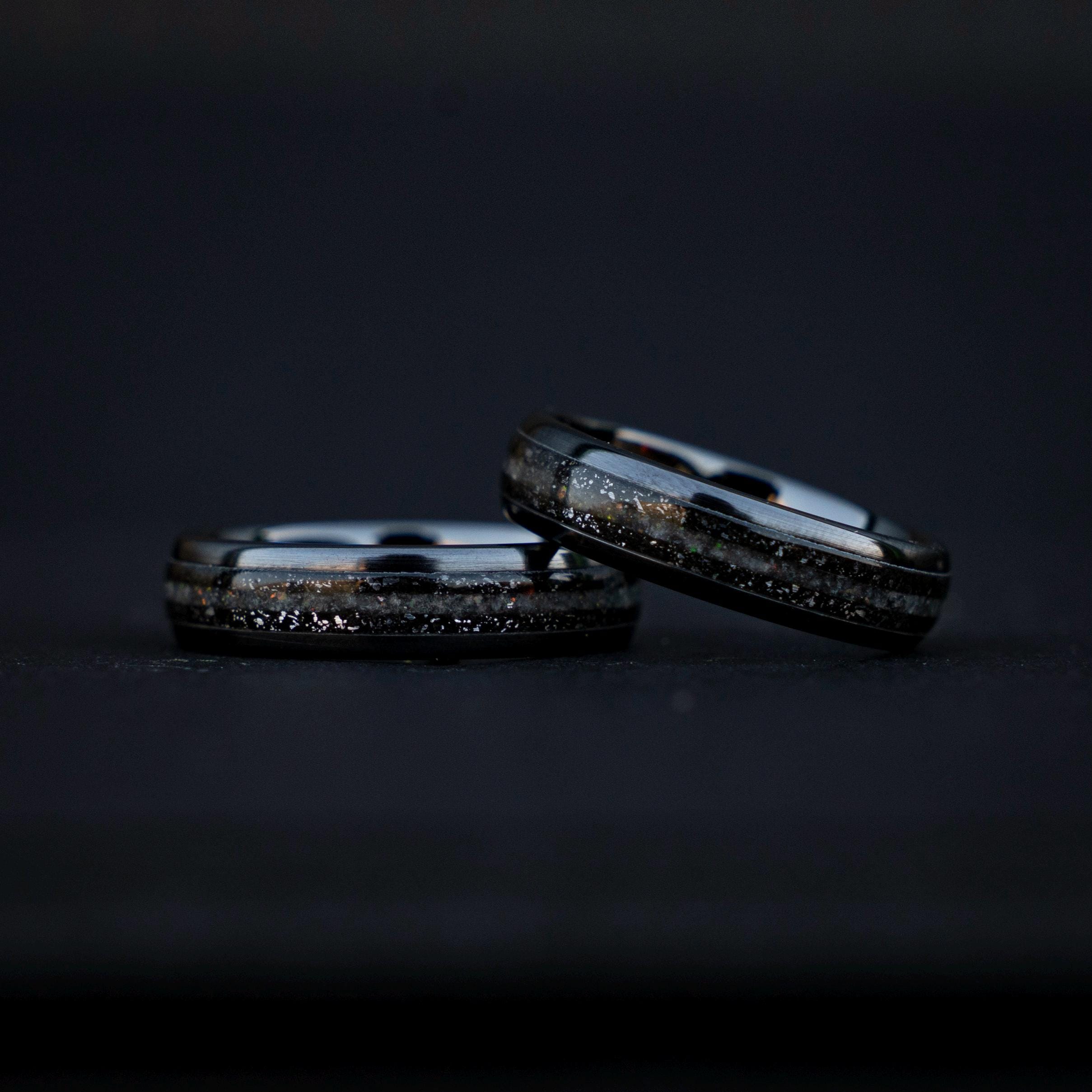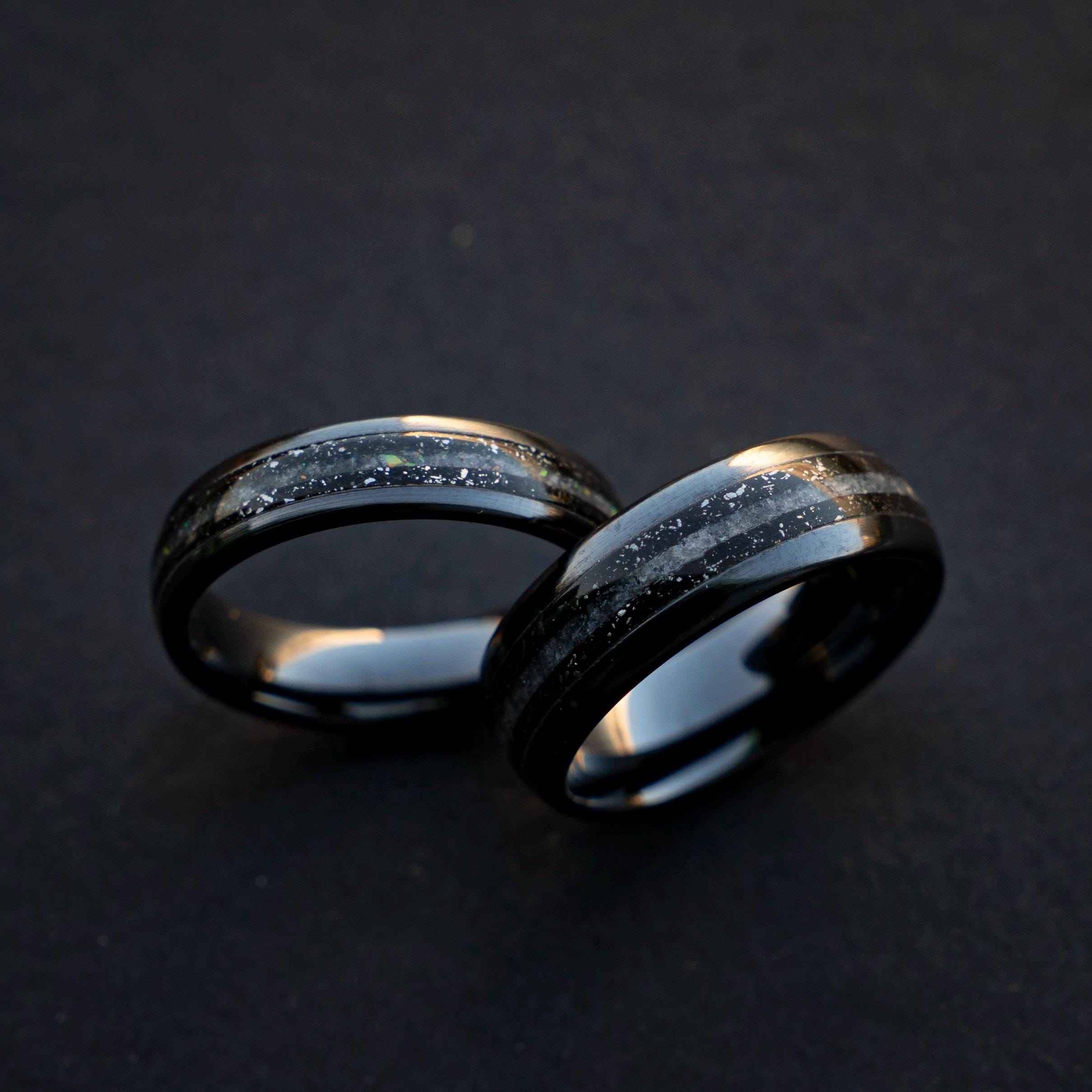 Celebrate your love with this domed ceramic ring set, featuring genuine Muonionalusta meteorite dust inlays and a delicate rainbow moonstone accent line. Each ring in the set is handcrafted from durable, scratch-resistant ceramic, creating a modern, cosmic-inspired look that’s perfect for wedding bands, promise rings, or matching couple rings.