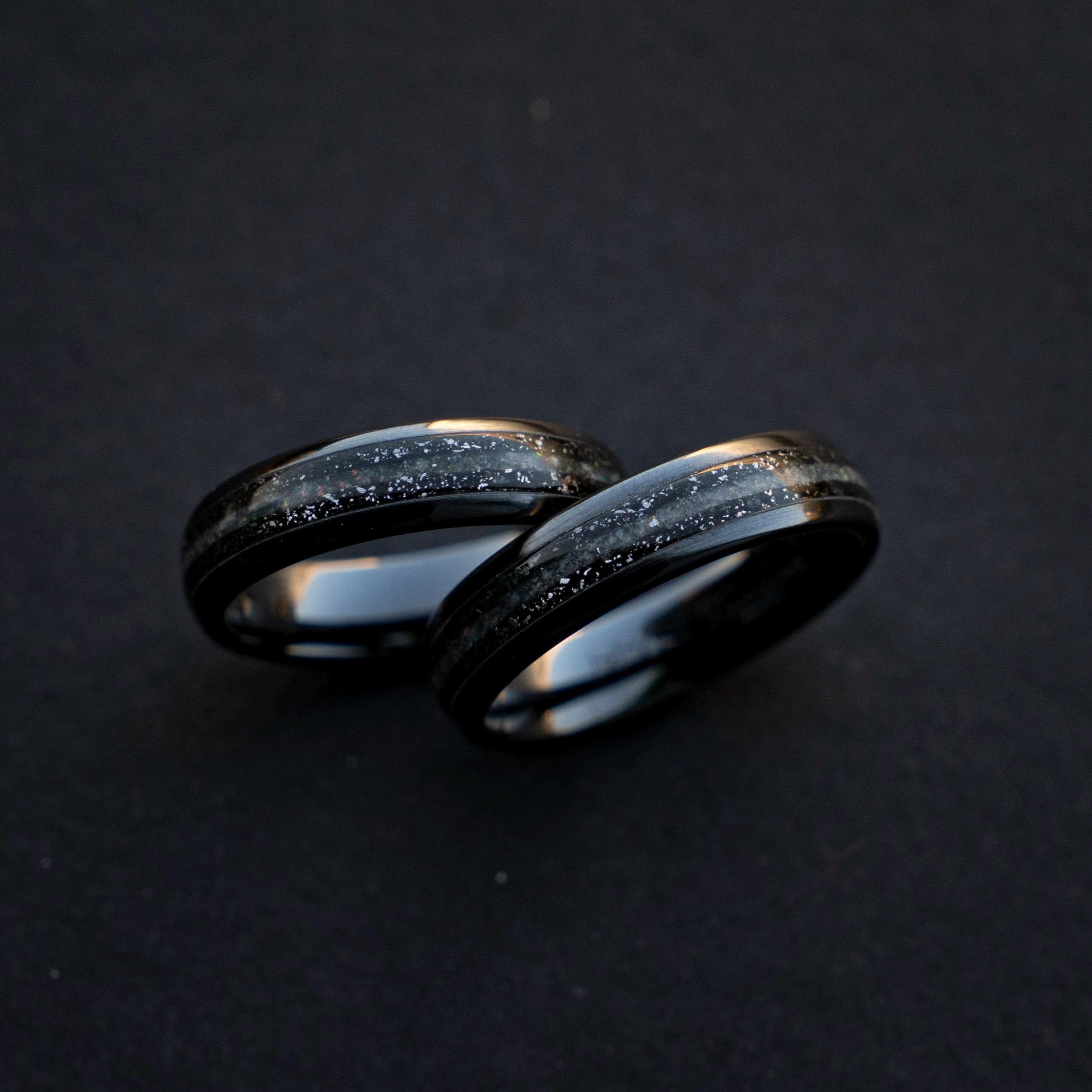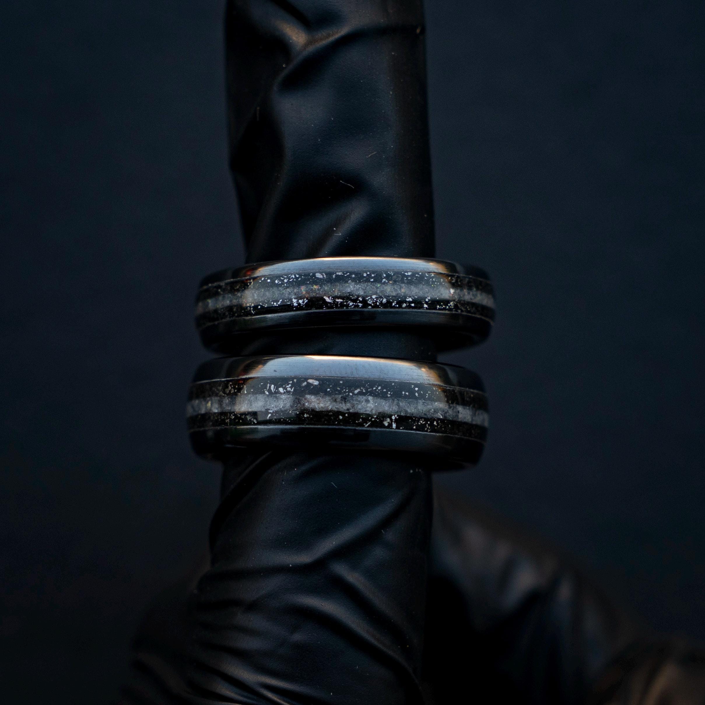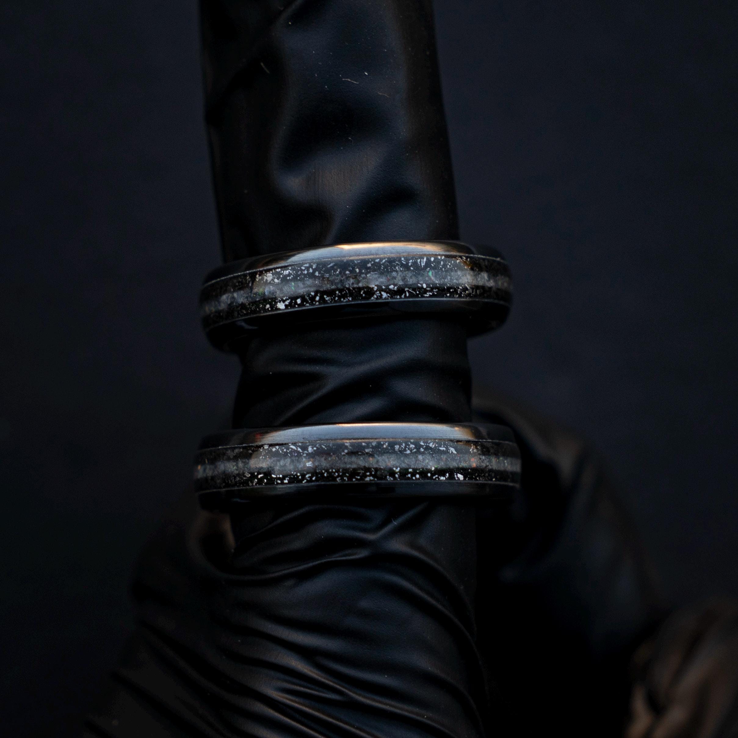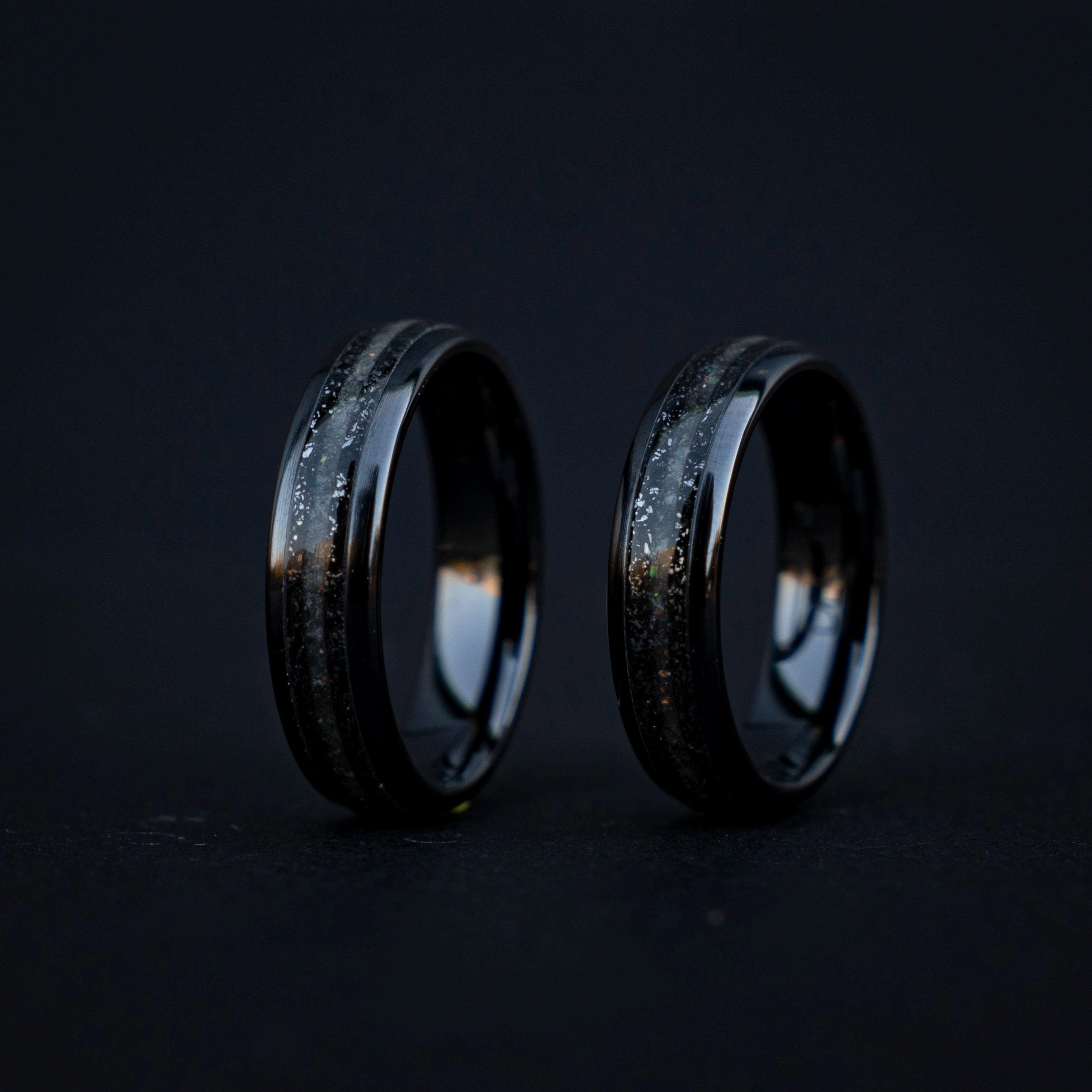 Celebrate your love with this domed ceramic ring set, featuring genuine Muonionalusta meteorite dust inlays and a delicate rainbow moonstone accent line. Each ring in the set is handcrafted from durable, scratch-resistant ceramic, creating a modern, cosmic-inspired look that’s perfect for wedding bands, promise rings, or matching couple rings.