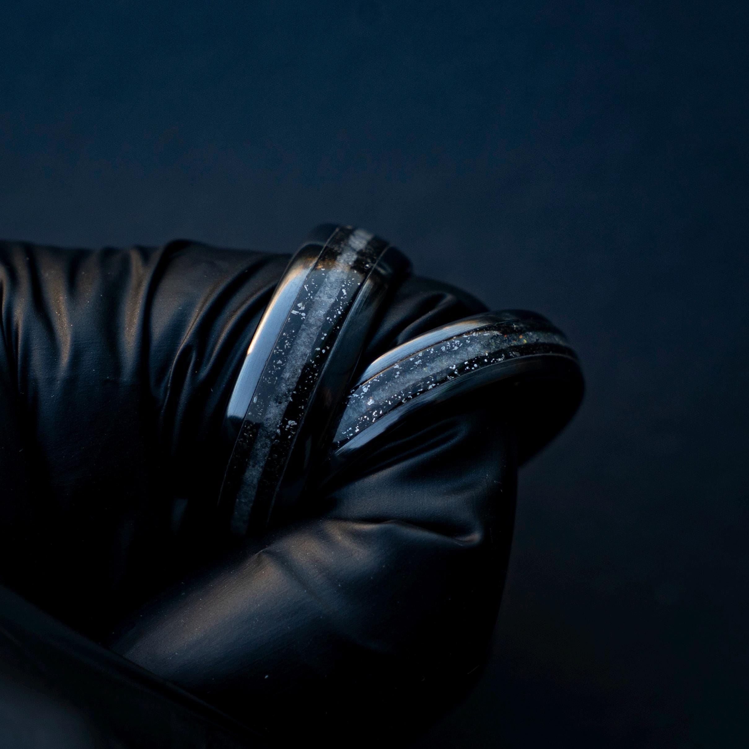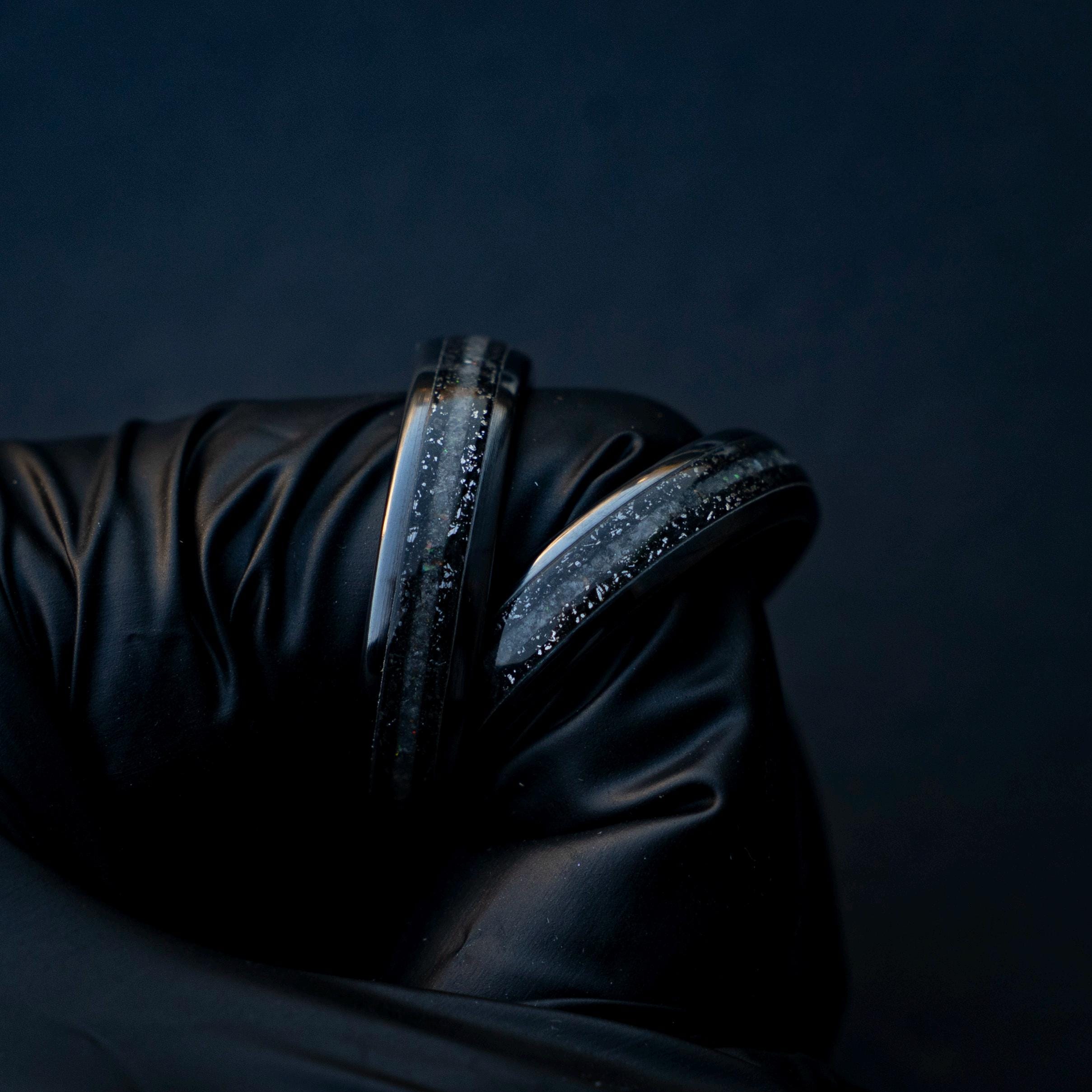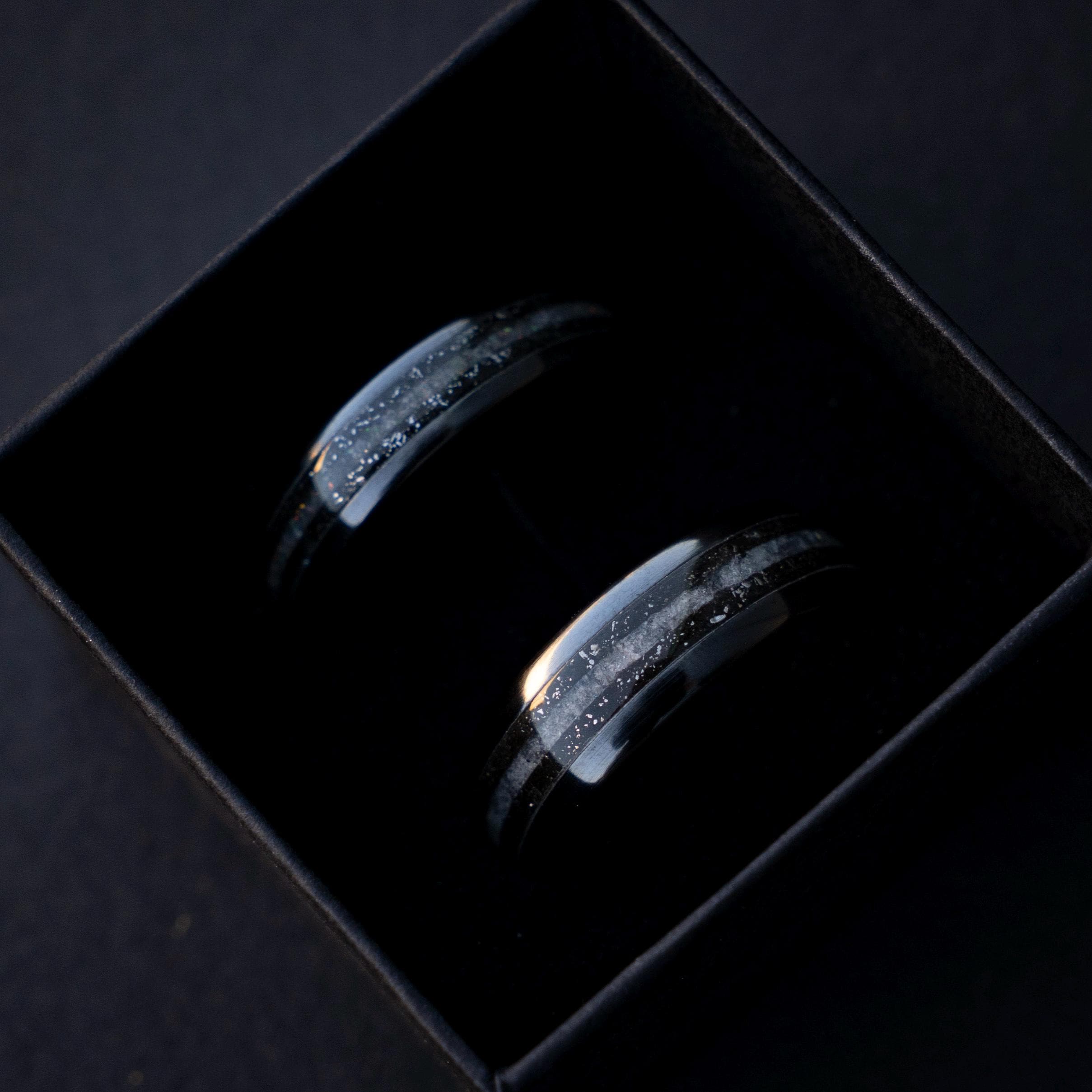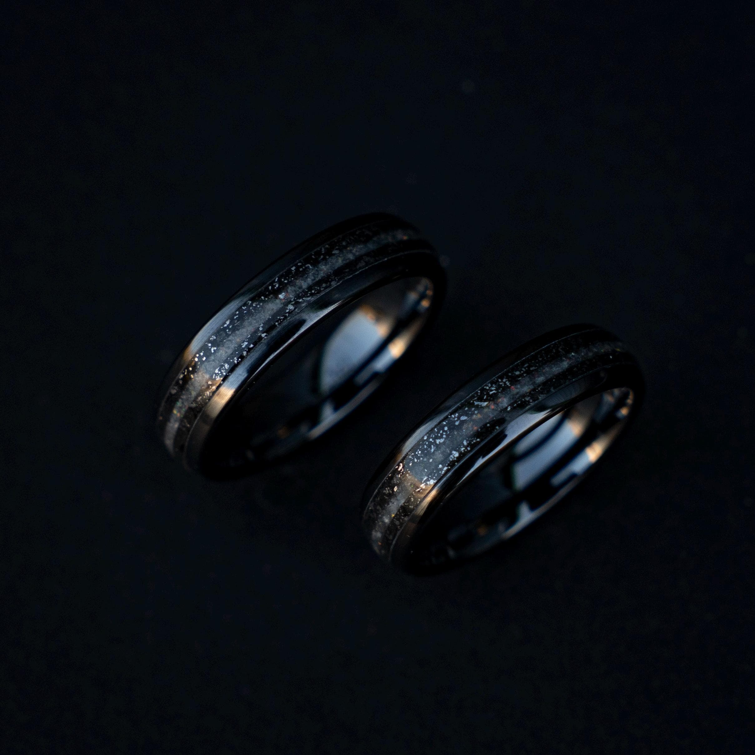 Celebrate your love with this domed ceramic ring set, featuring genuine Muonionalusta meteorite dust inlays and a delicate rainbow moonstone accent line. Each ring in the set is handcrafted from durable, scratch-resistant ceramic, creating a modern, cosmic-inspired look that’s perfect for wedding bands, promise rings, or matching couple rings.