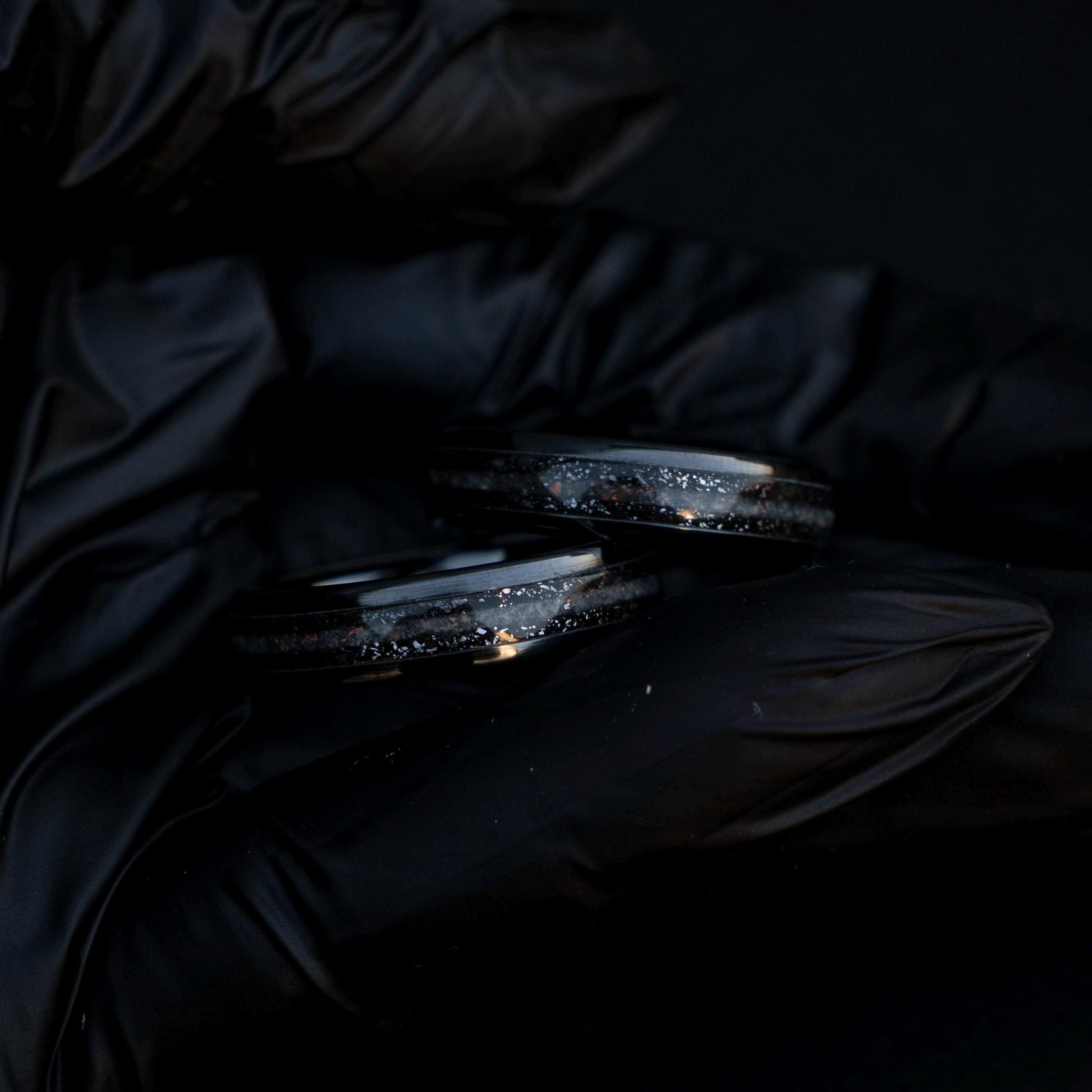 Domed Ceramic Ring Set • Muonionalusta Meteorite Dust Inlay • Rainbow Moonstone • Cosmic Wedding Bands • Matching Men’s & Women’s Rings