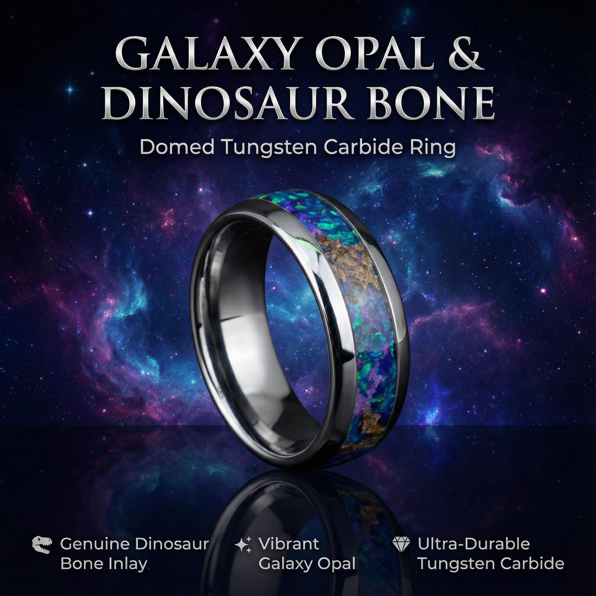 Each ring is handcrafted from premium tungsten carbide, providing scratch resistance, durability, and a comfort-fit interior. The naturally varying colors of the opal and fossilized bone make every ring one-of-a-kind, perfect for couples, space enthusiasts, or anyone who wants a truly unique wedding band or statement piece.
