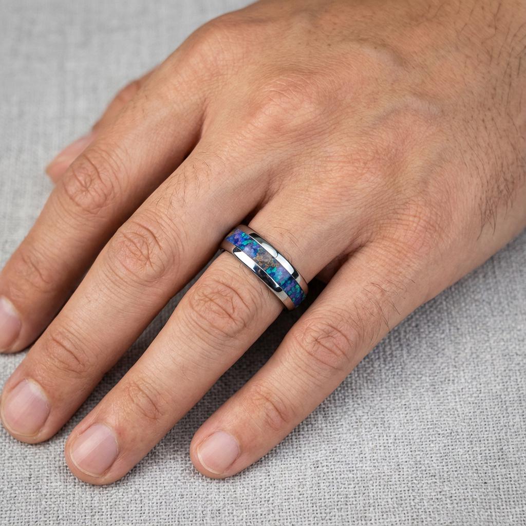 This galaxy ring is perfect as a men's or women's wedding band, promise ring, or statement jewelry piece. It's a cosmic masterpiece that blends the beauty of opals, the mystery of ancient fossils, and the strength of tungsten into one extraordinary ring.