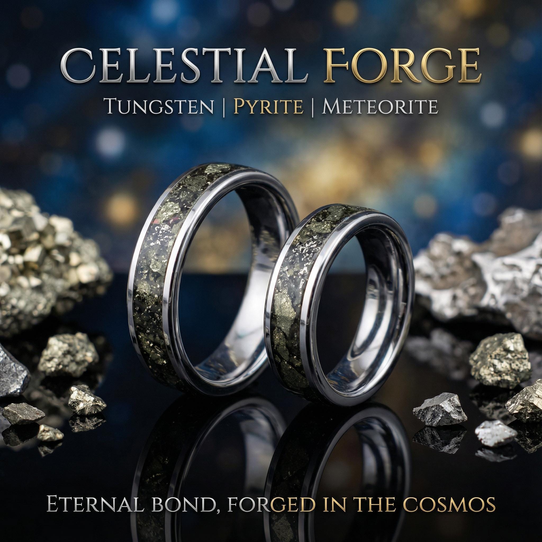 Celebrate your bond with this 6mm tungsten ring set, featuring genuine pyrite and meteorite inlays. Each ring is crafted from durable tungsten carbide, ensuring a scratch-resistant, long-lasting design. The shimmering golden tones of pyrite (Fool's Gold) paired with the celestial patterns of Muonionalusta meteorite make these rings a unique cosmic-inspired set.