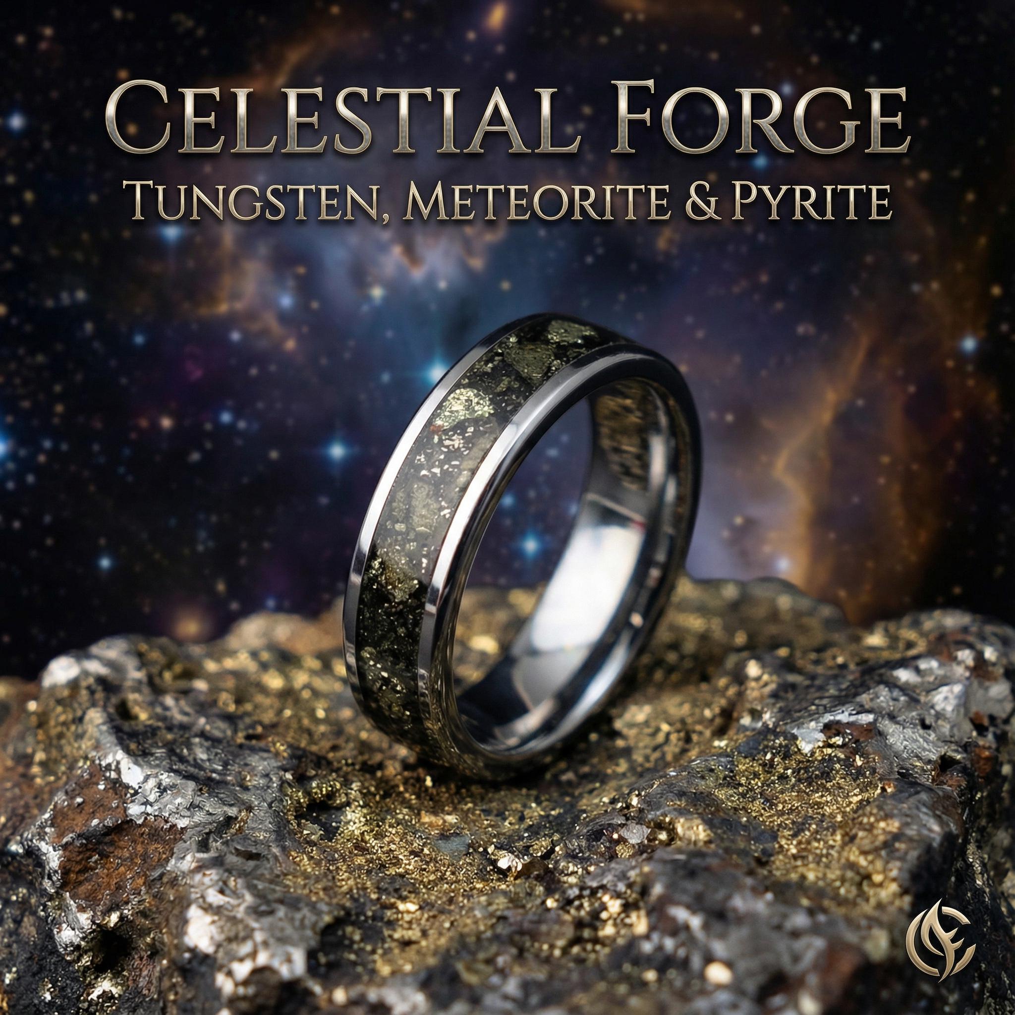 This tungsten band is ideal as a men's or women's wedding band, anniversary gift, or statement ring, combining durability, elegance, and a touch of cosmic history. Each inlay is one-of-a-kind, reflecting the natural variations in pyrite and meteorite.