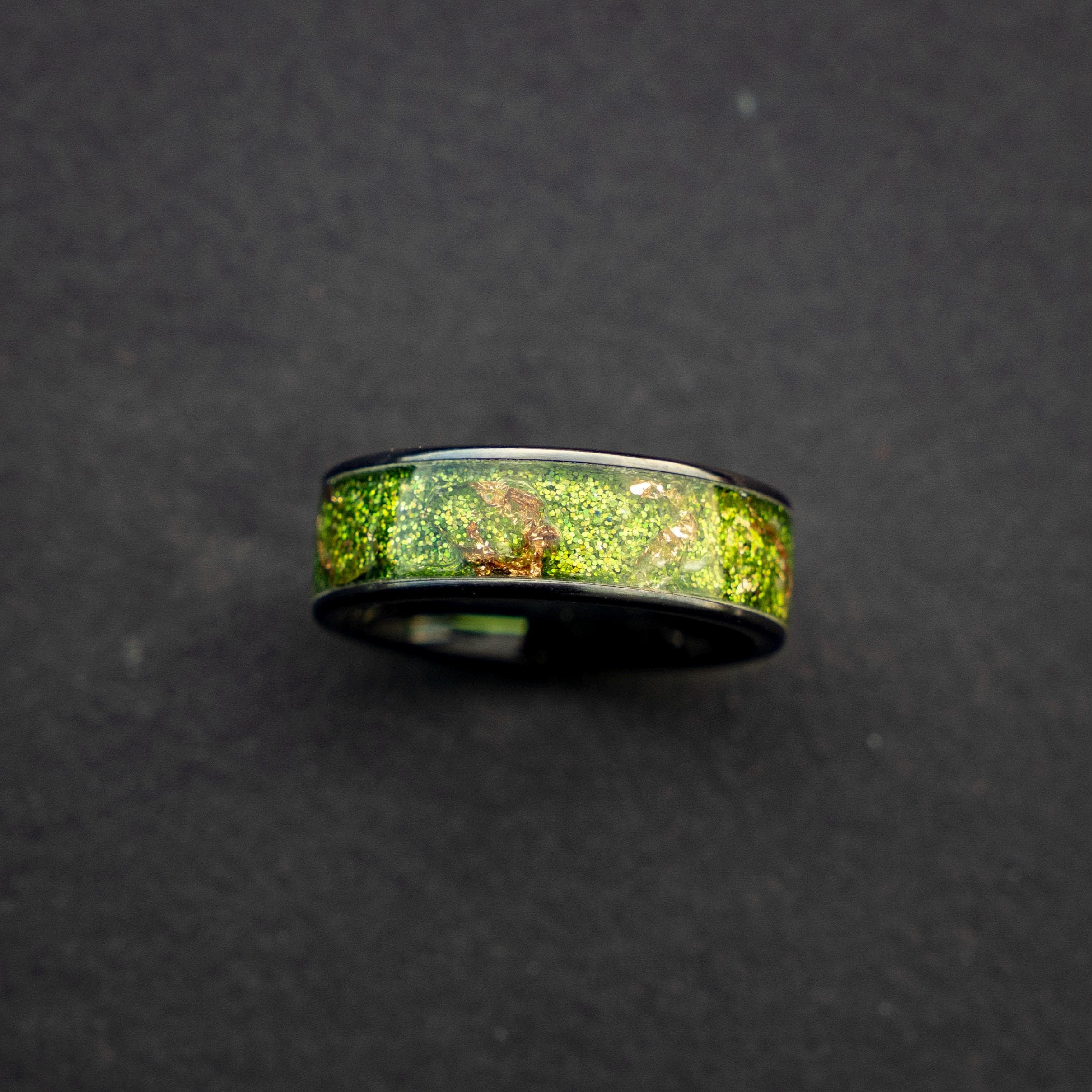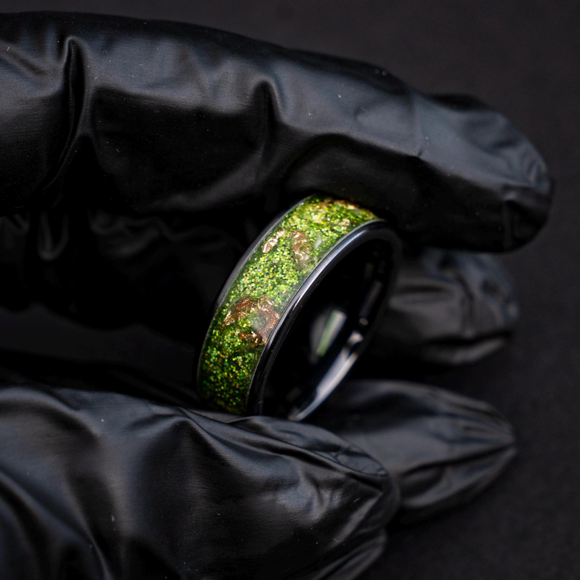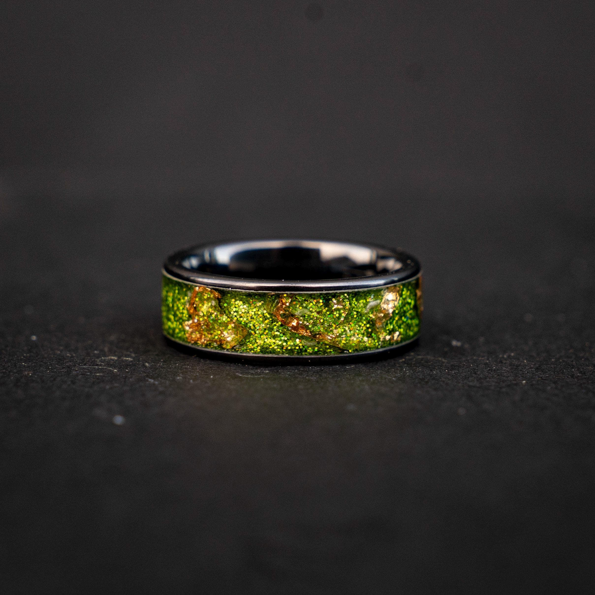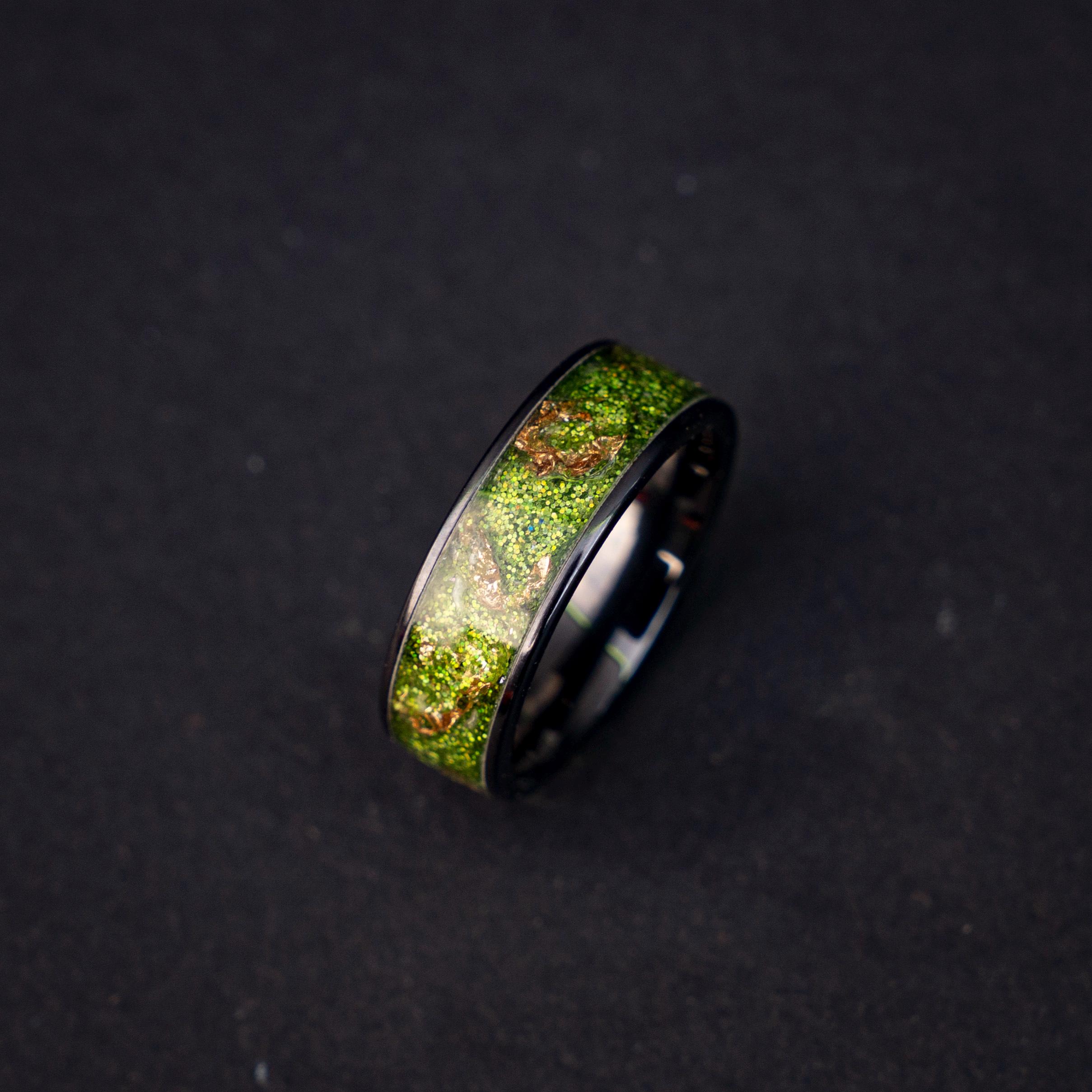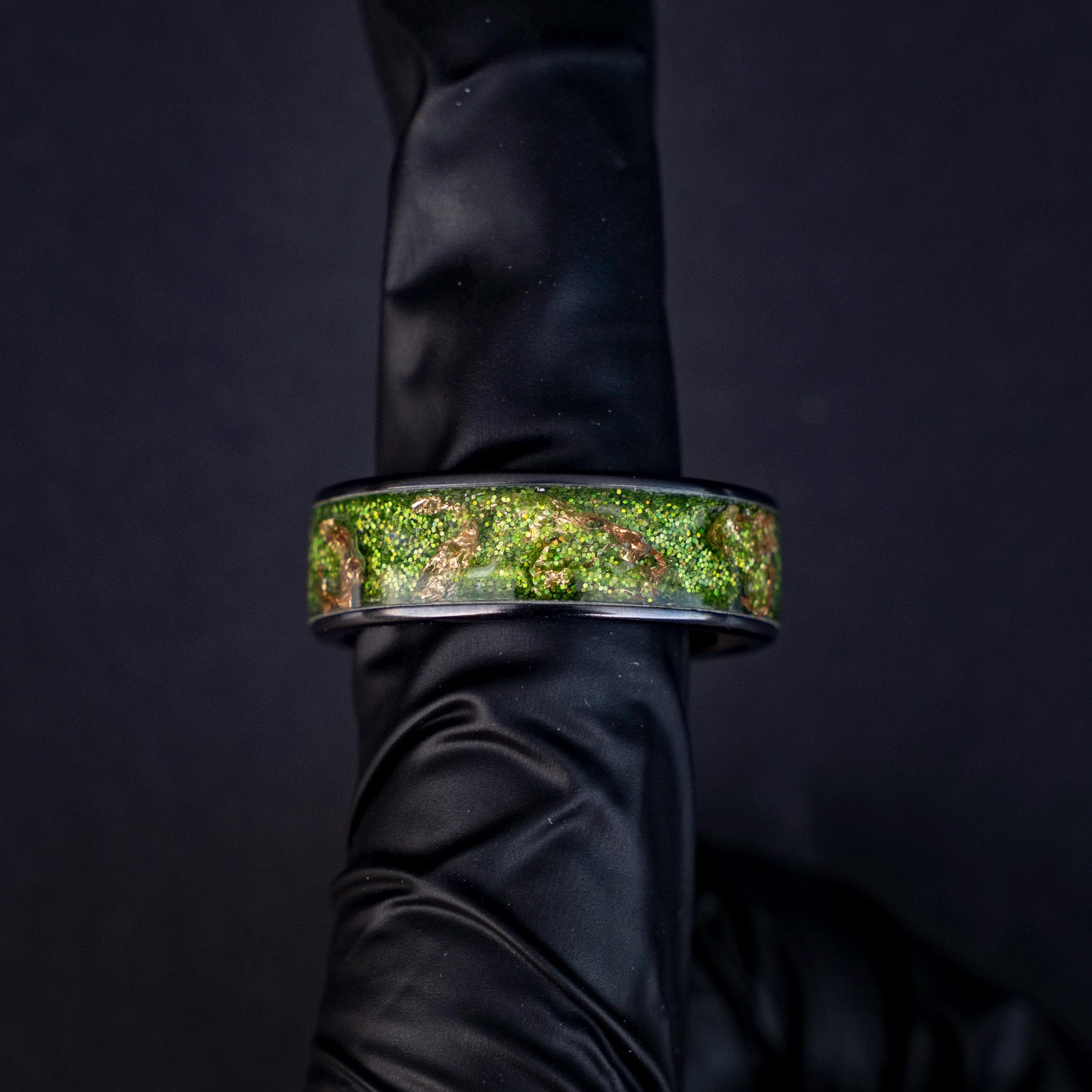 Black Green Gold Men's Ring, Green Glitter Ceramic Flat Ring with 18K Gold Leaf, Festive Holiday Jewelry Gift, Inspired Statement Ring