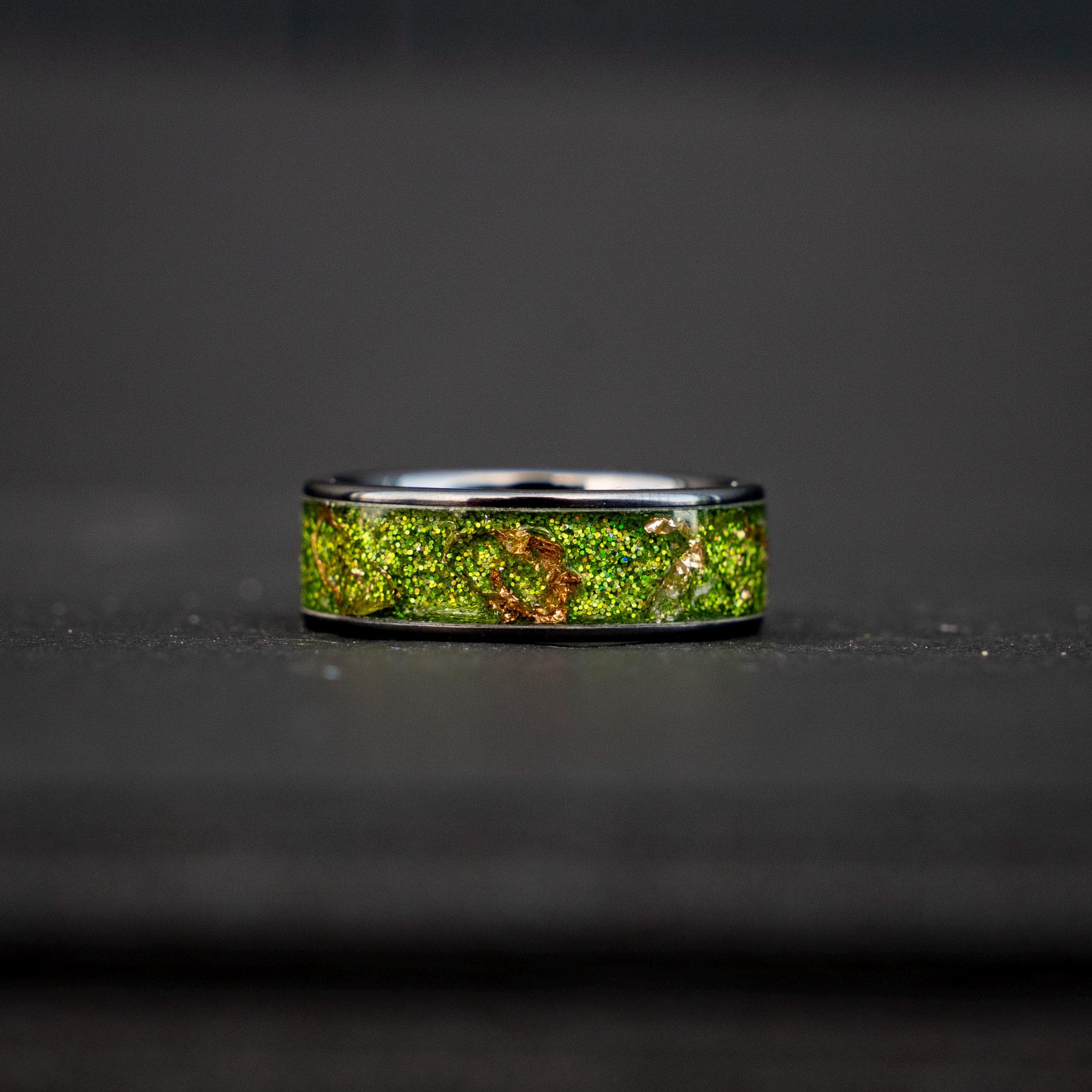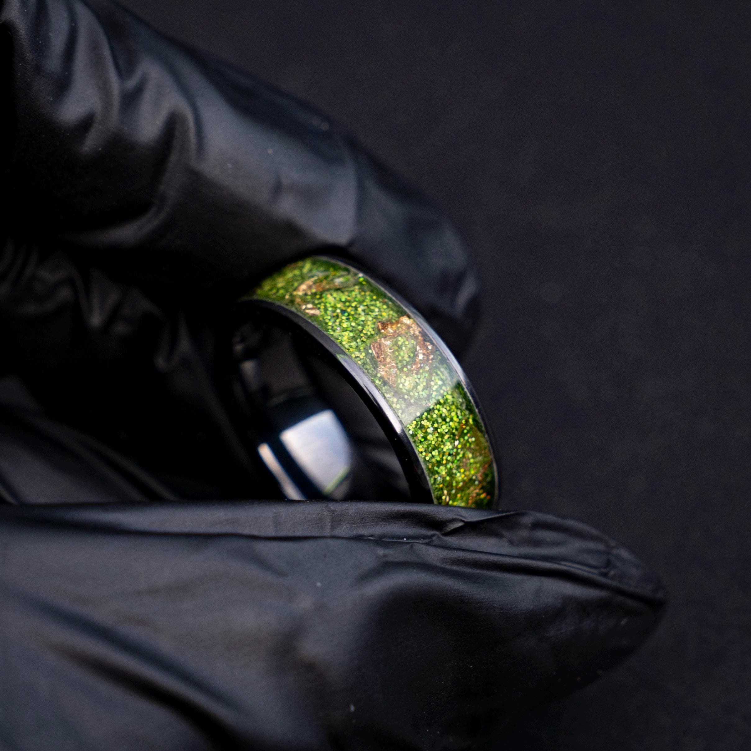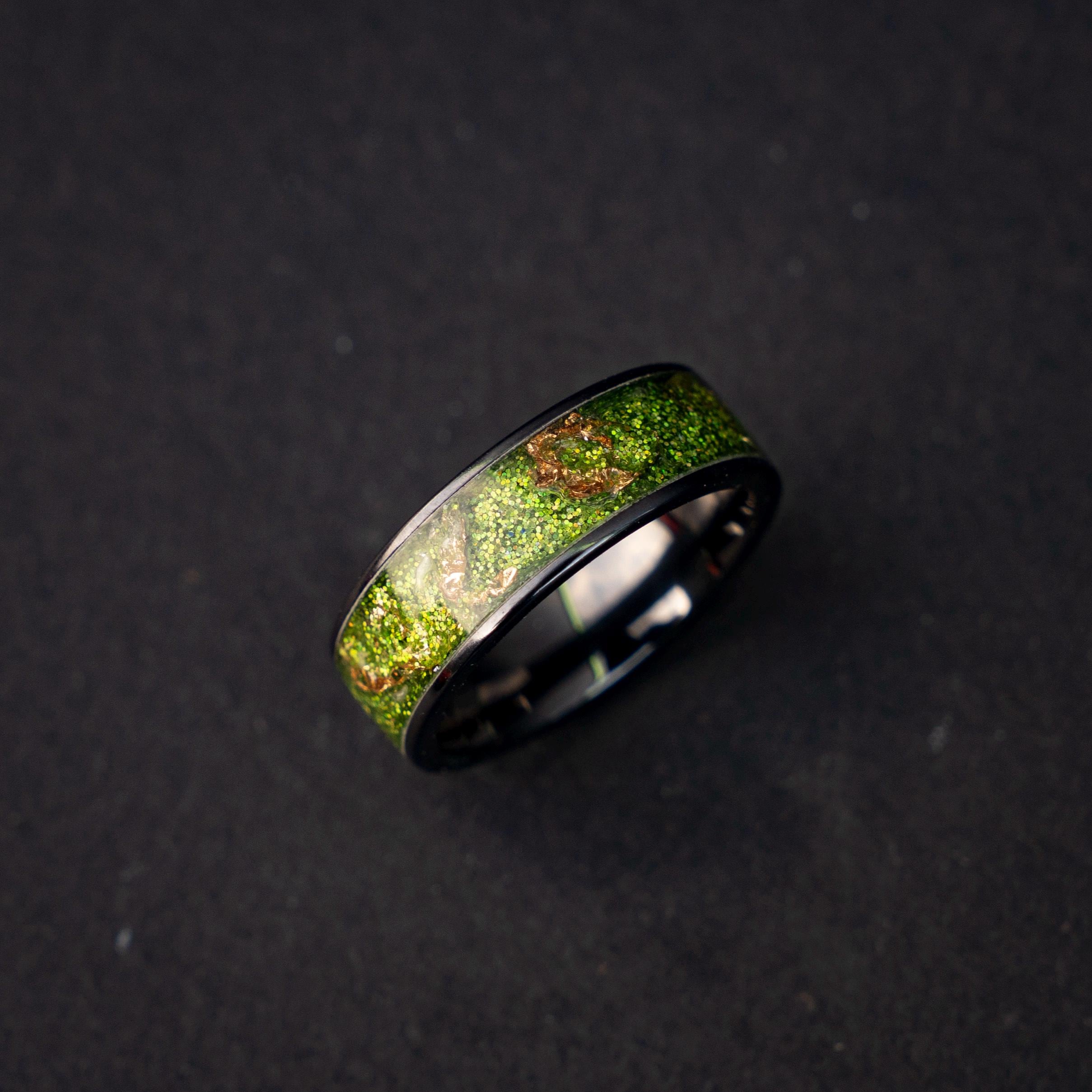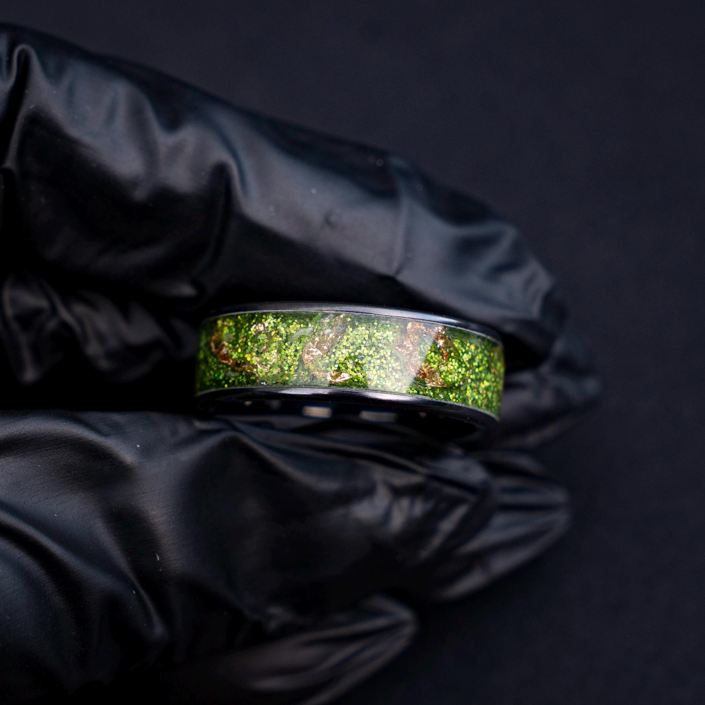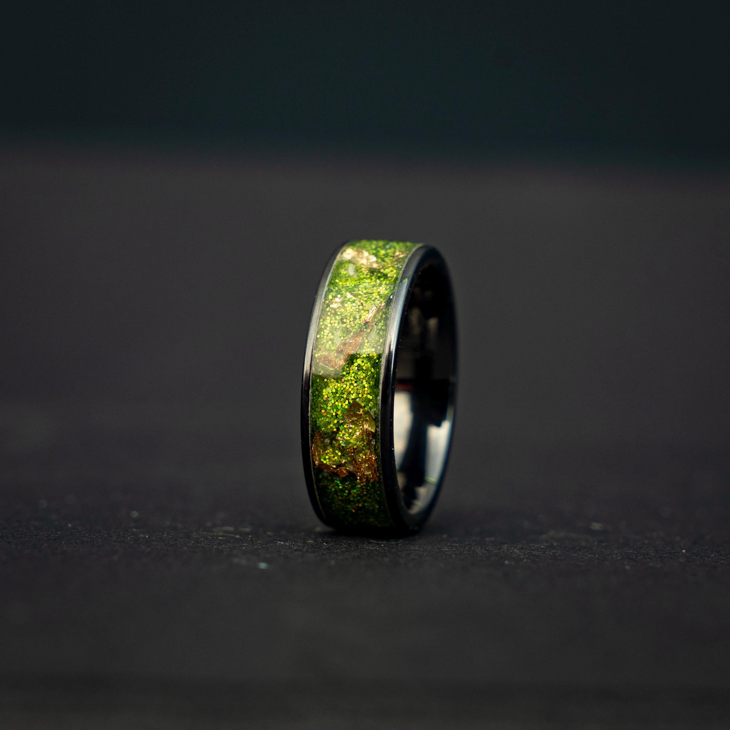 Black Green Gold Men's Ring, Green Glitter Ceramic Flat Ring with 18K Gold Leaf, Festive Holiday Jewelry Gift, Inspired Statement Ring
