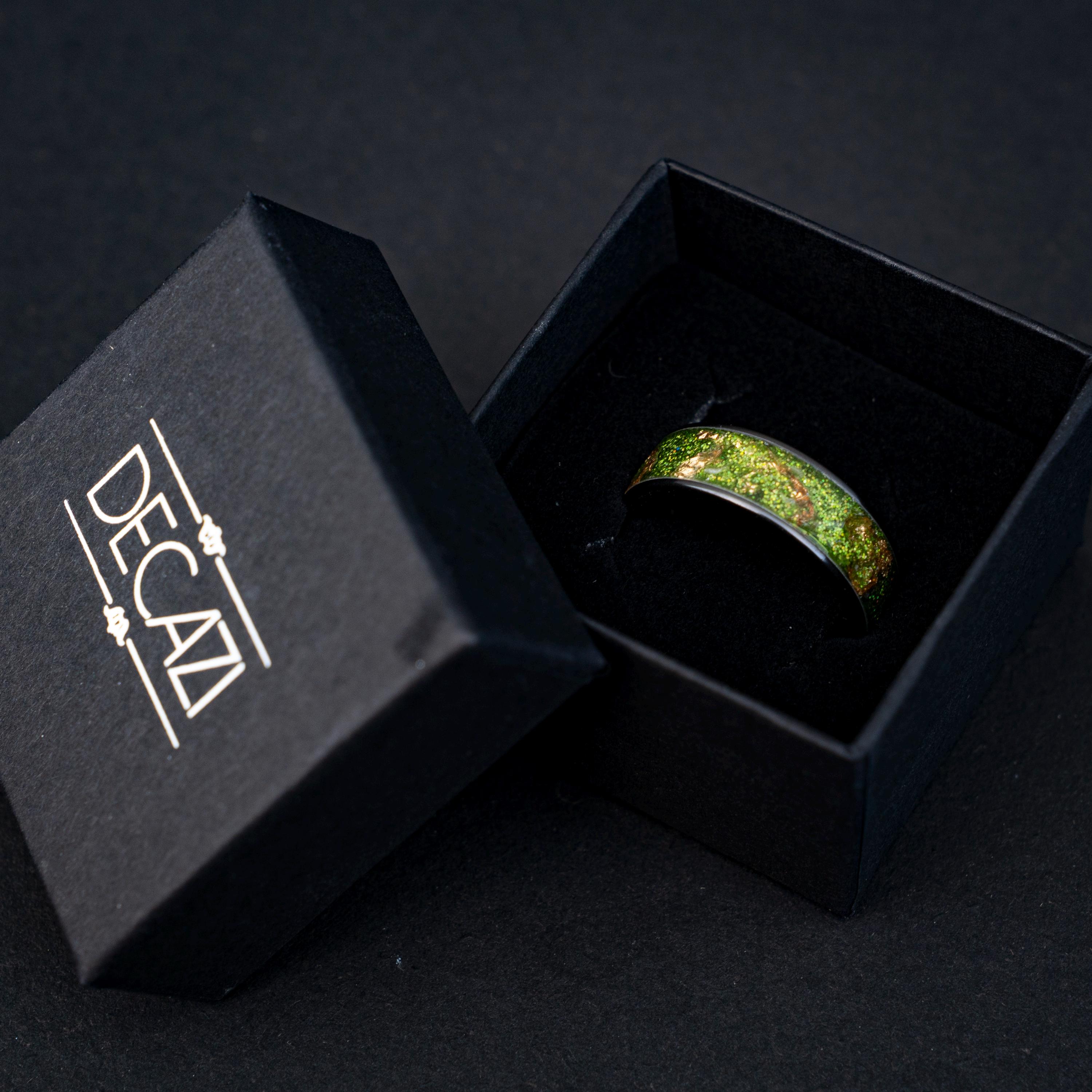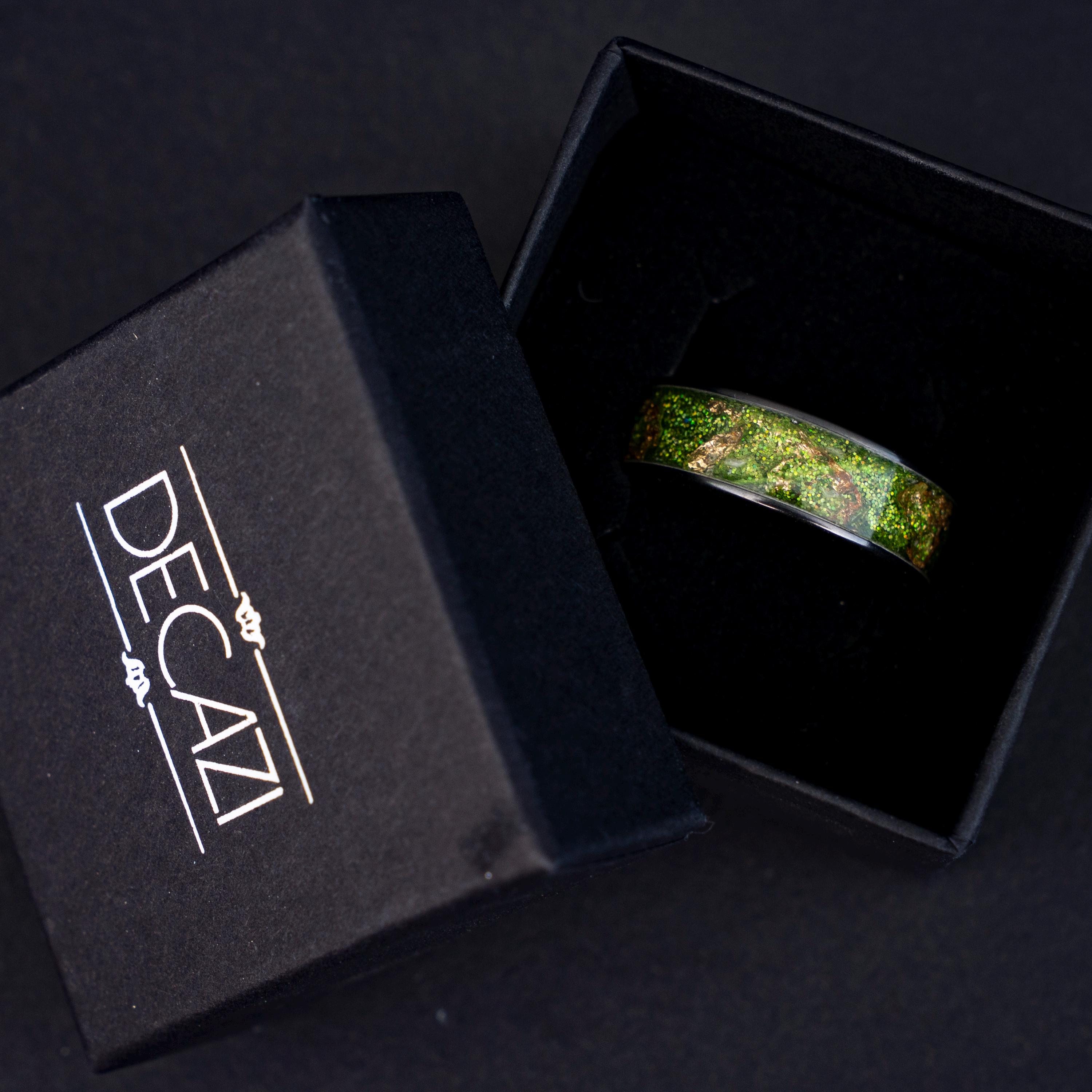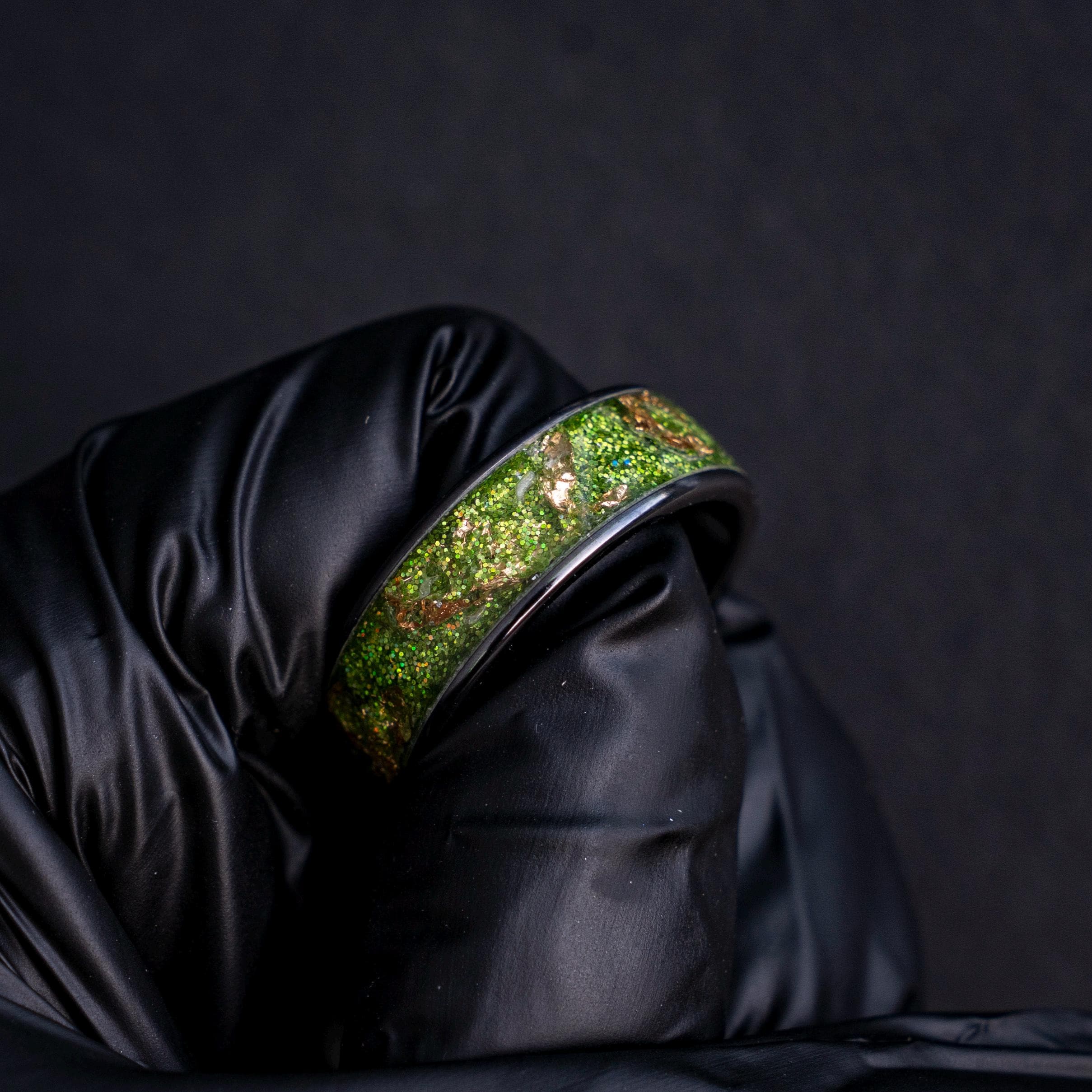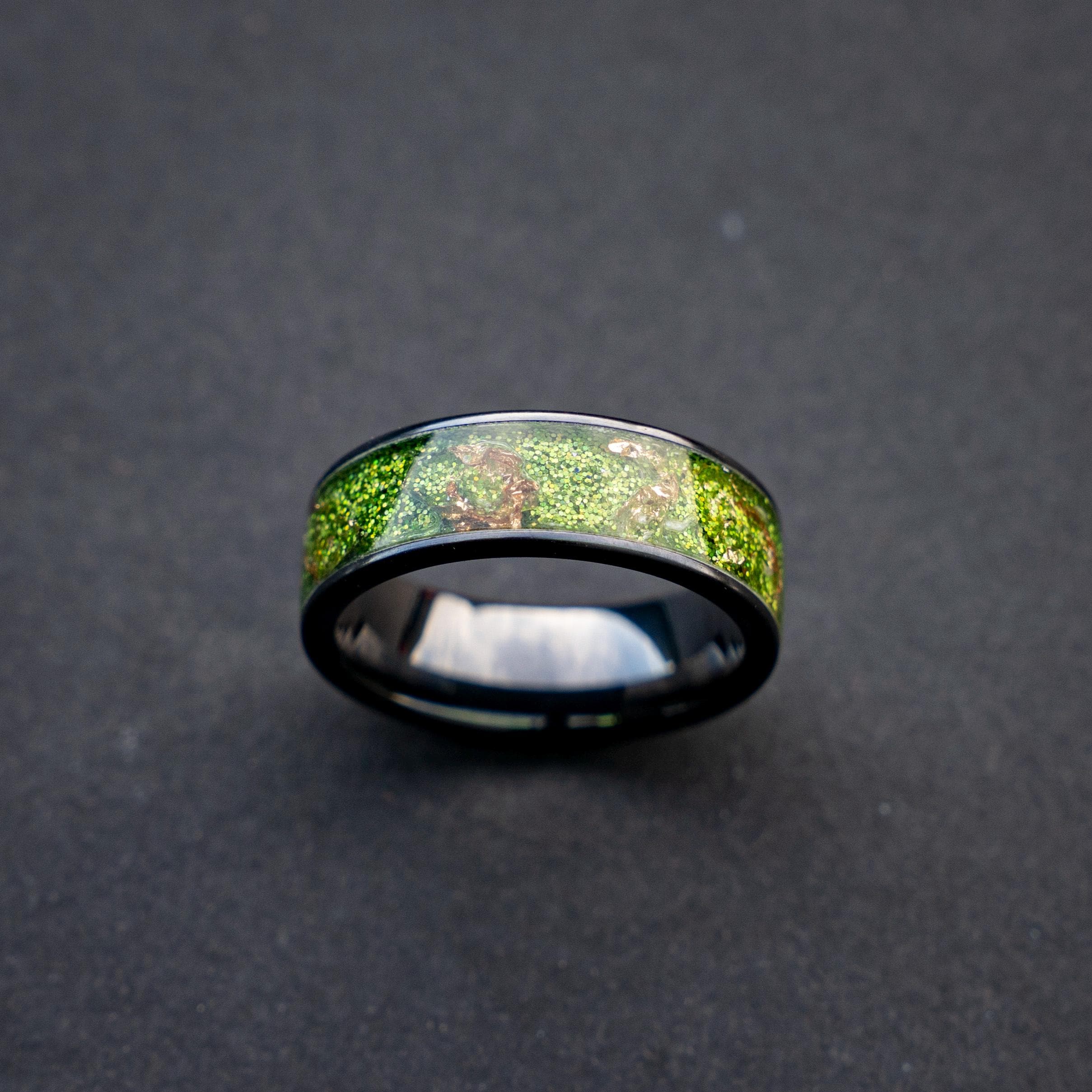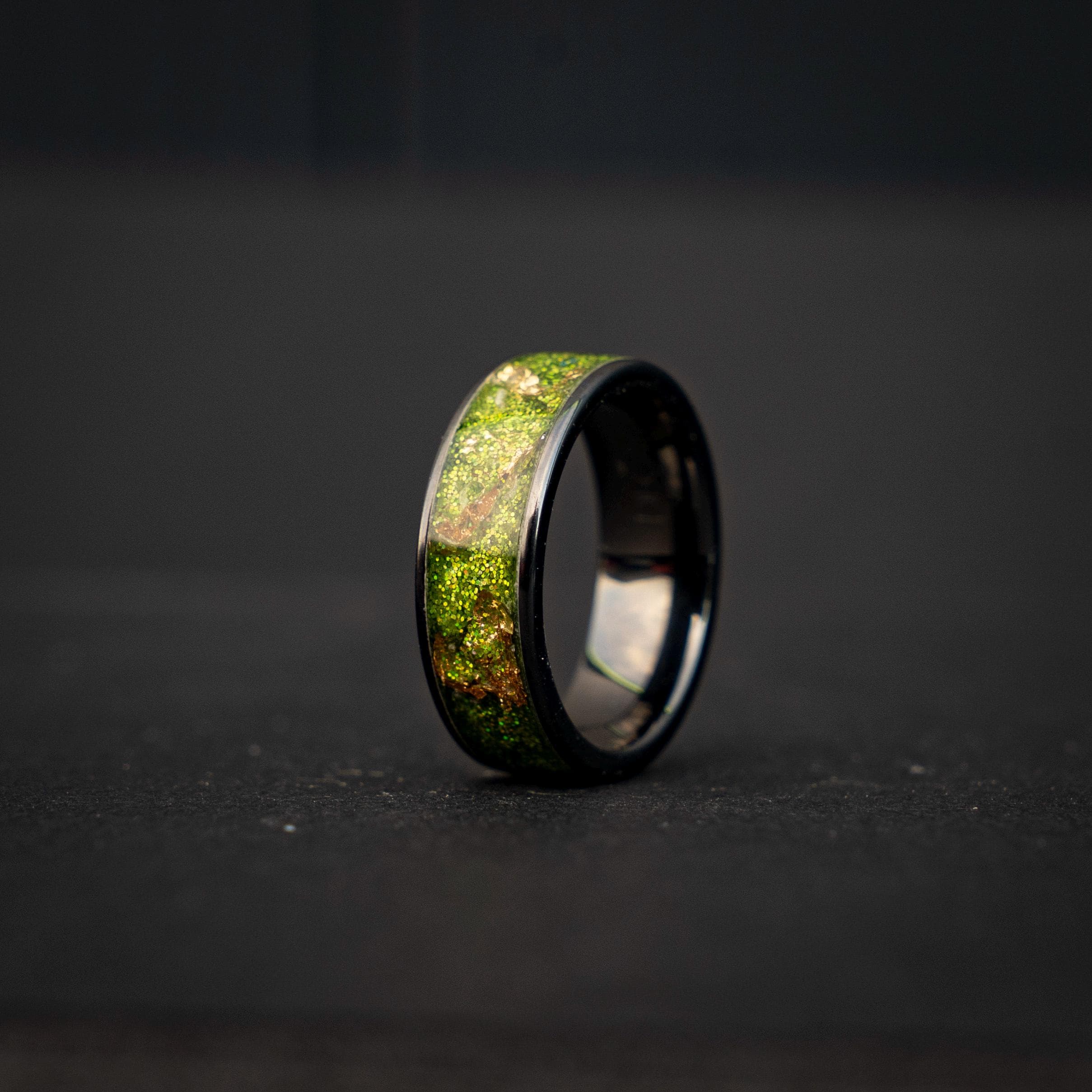 Black Green Gold Men's Ring, Green Glitter Ceramic Flat Ring with 18K Gold Leaf, Festive Holiday Jewelry Gift, Inspired Statement Ring