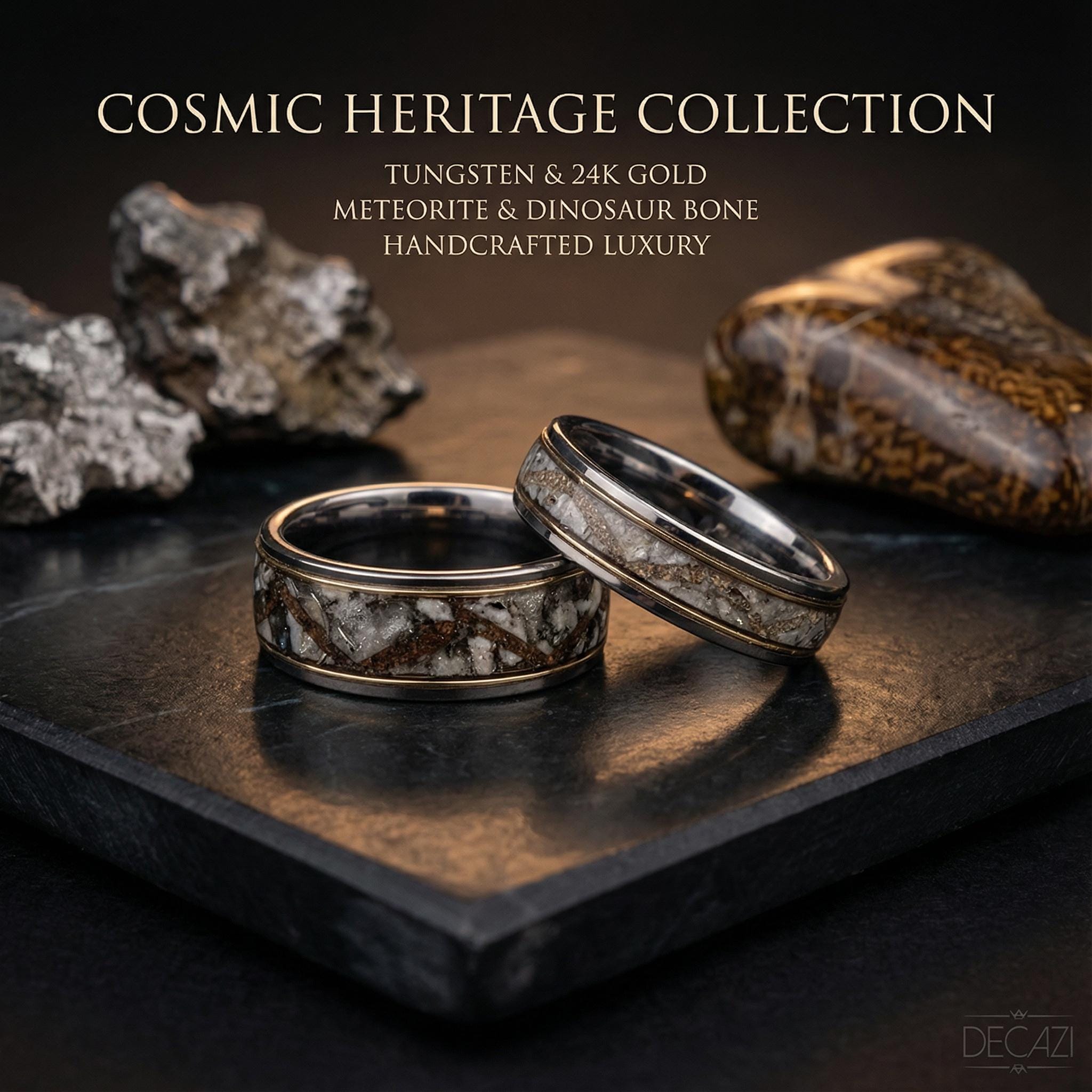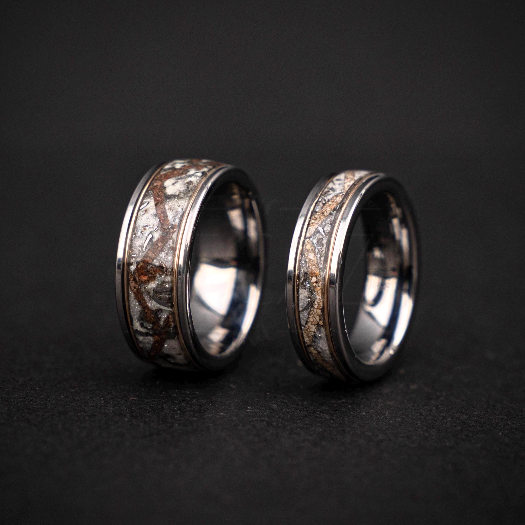 Muonionalusta Meteorite & Dinosaur Bone Tungsten Ring Set – Matching Couple Wedding Bands 6mm + 8mm – Gold Wire – Comfort Fit – Personalized