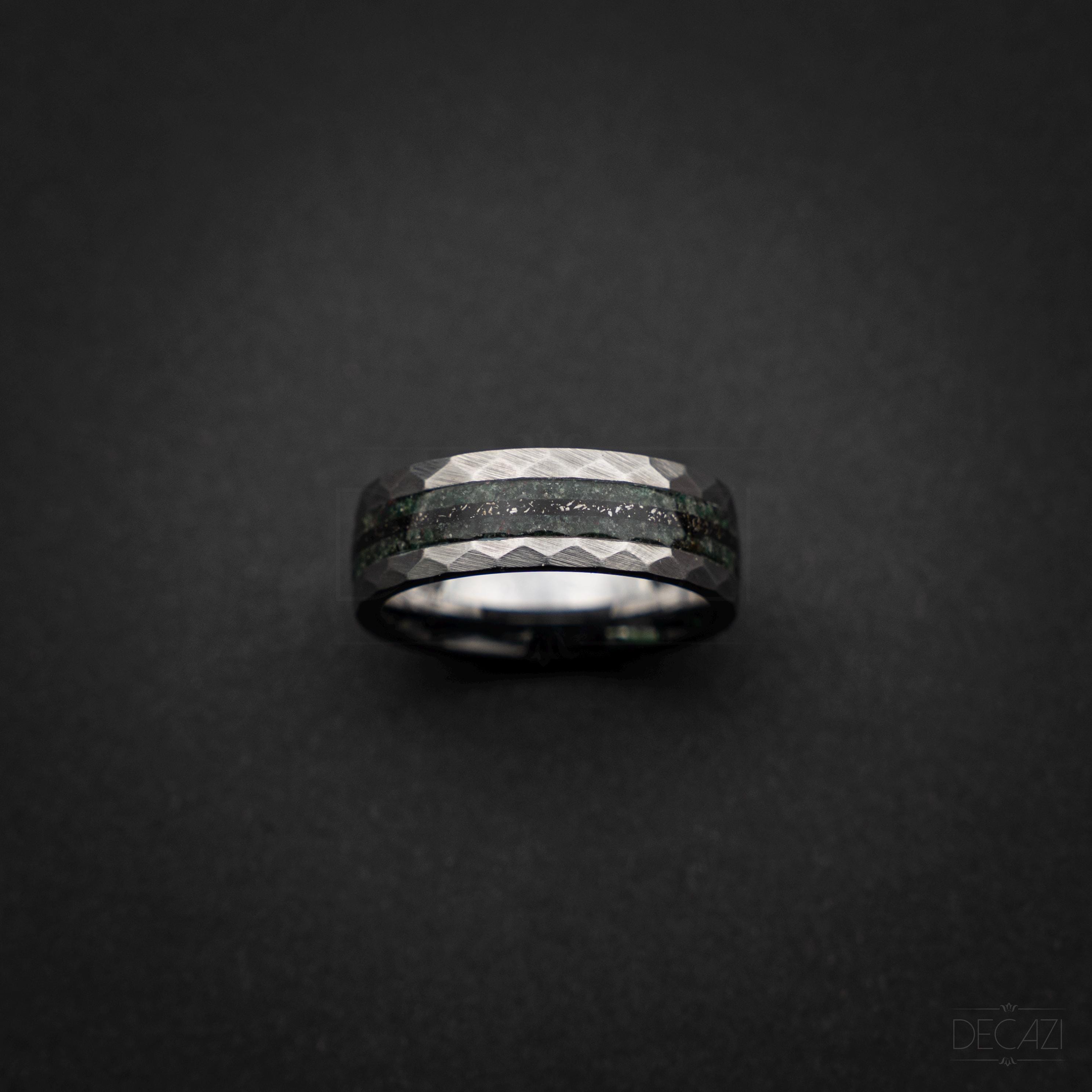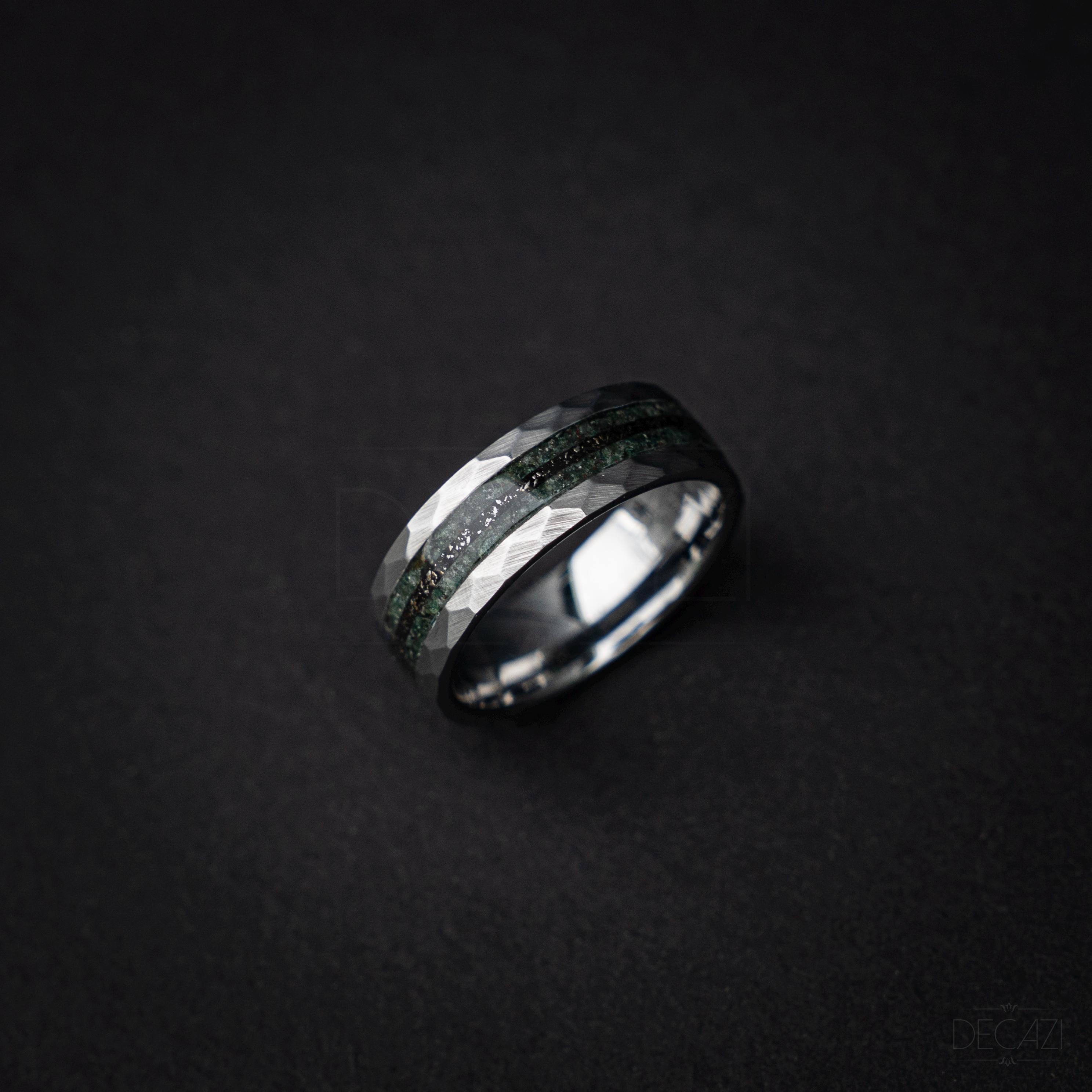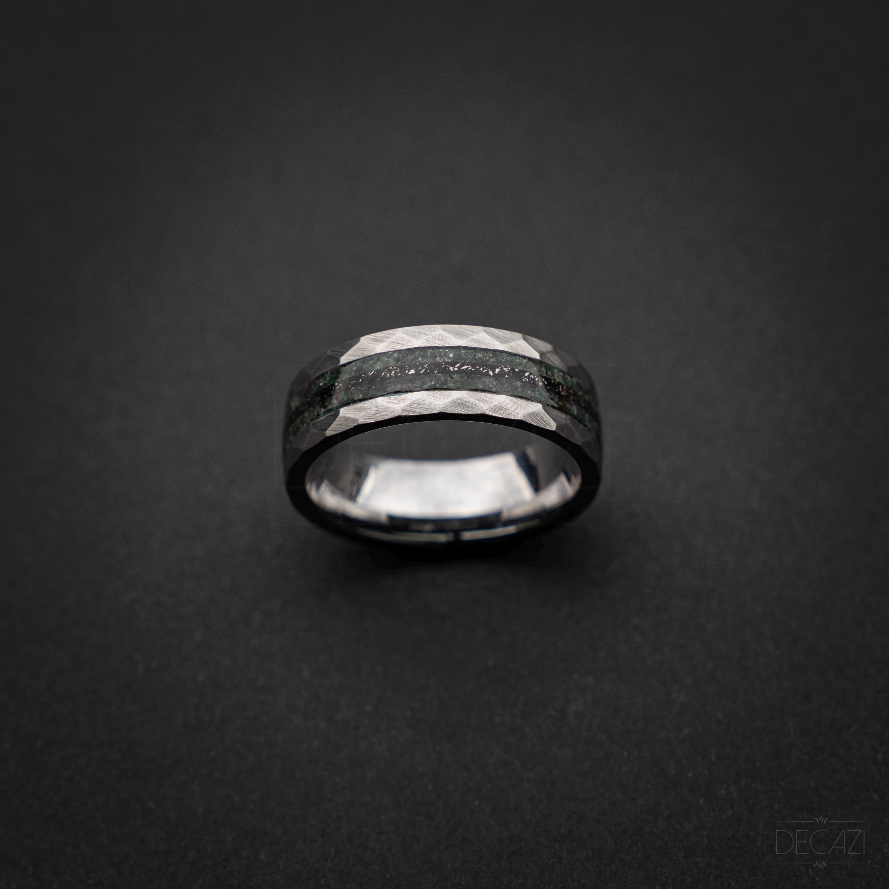 Discover this hammered tungsten ring, a perfect blend of durability and style. This 8mm tungsten ring features a stunning moss agate inlay combined with authentic meteorite, creating a unique wedding band that's both nature-inspired and space-inspired.