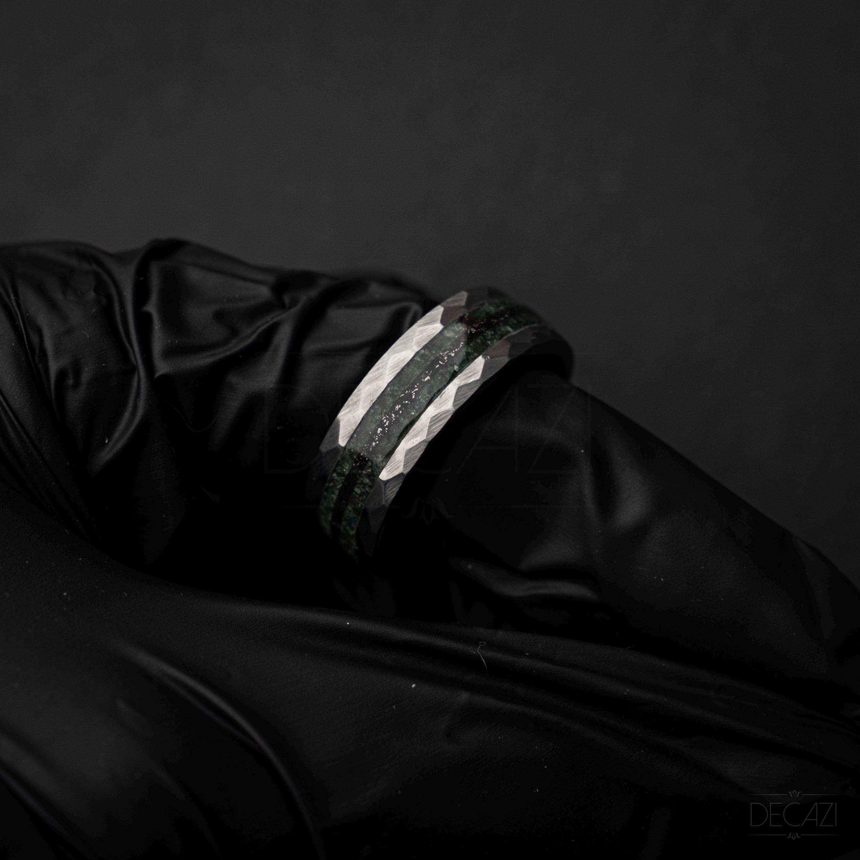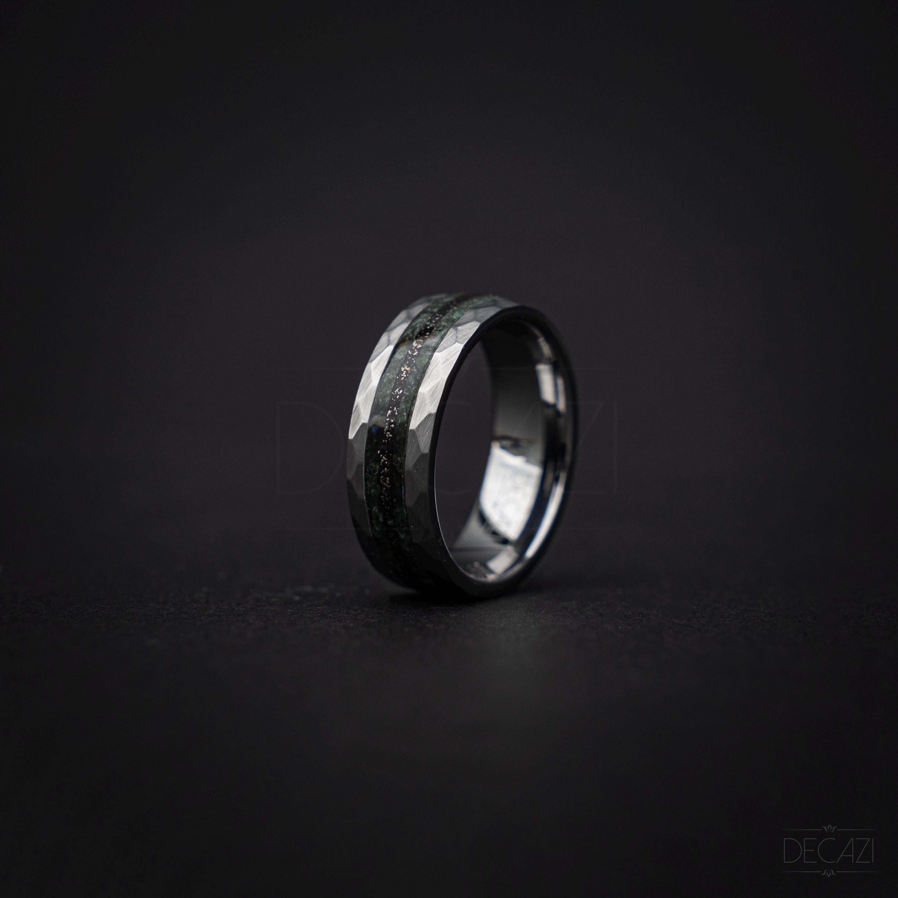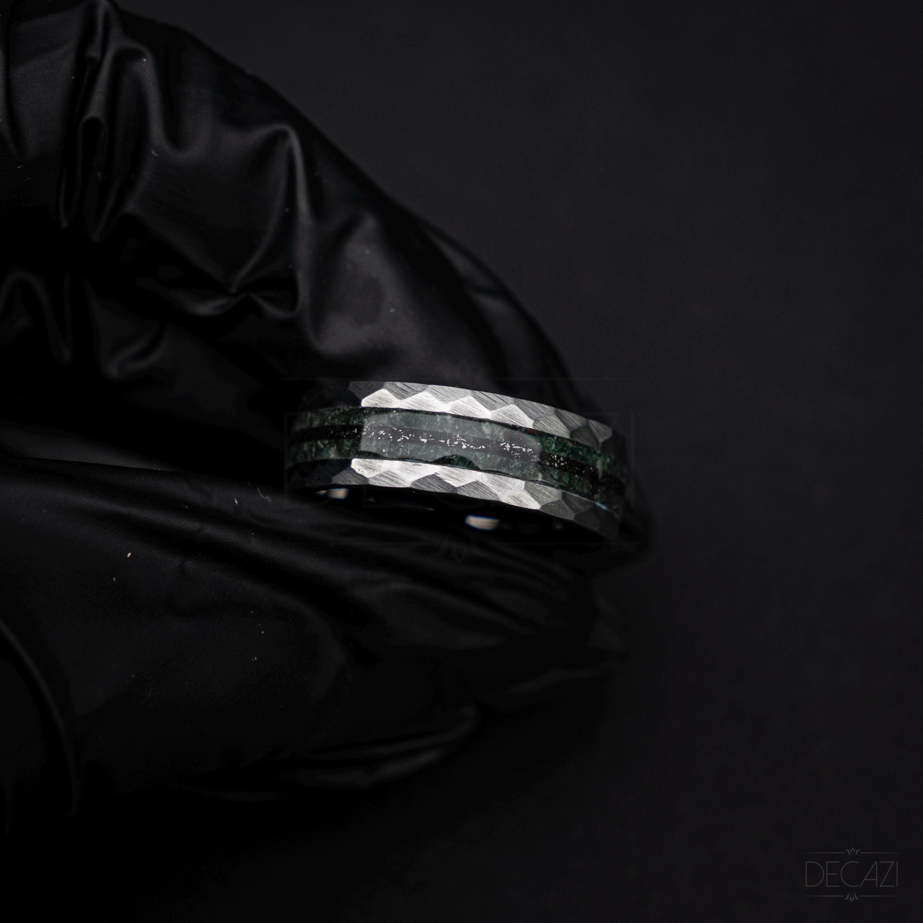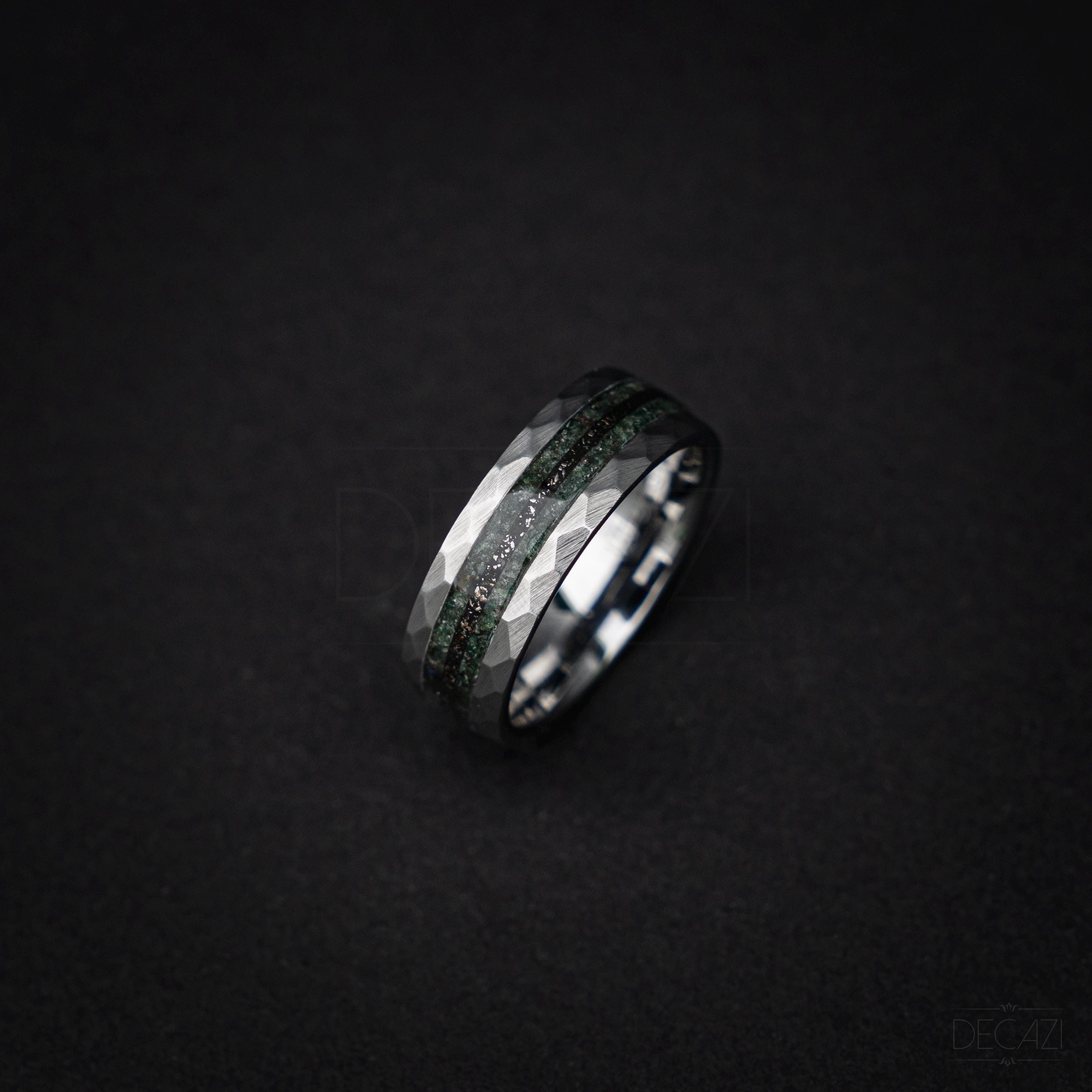 Discover this hammered tungsten ring, a perfect blend of durability and style. This 8mm tungsten ring features a stunning moss agate inlay combined with authentic meteorite, creating a unique wedding band that's both nature-inspired and space-inspired.