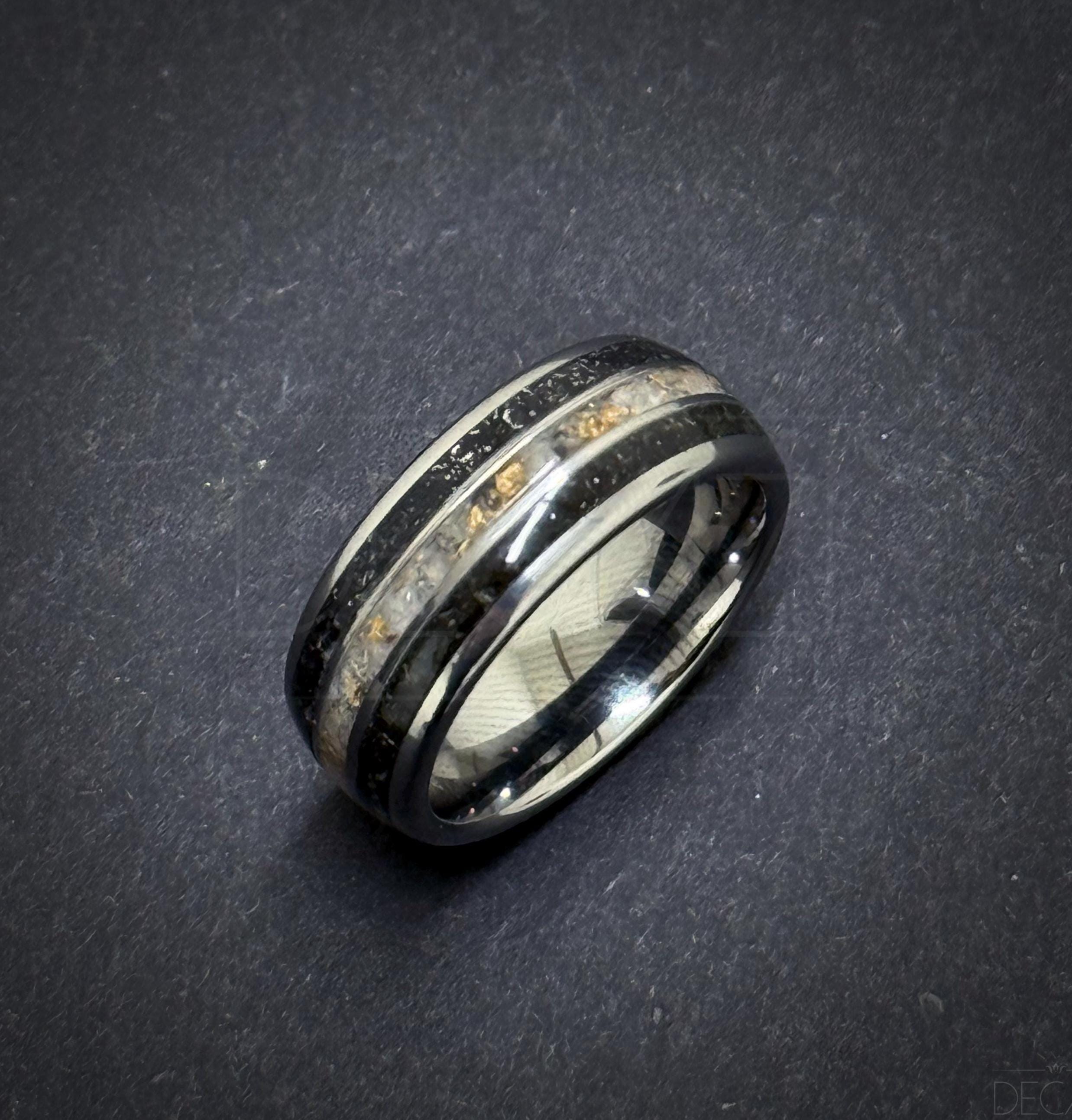 This 8mm silver tungsten band features a “triple” inlay of genuine Moldavite (tektite), Muonionalusta meteorite, and Herkimer diamond, blended with 18K gold leaf for a subtle gold shimmer.