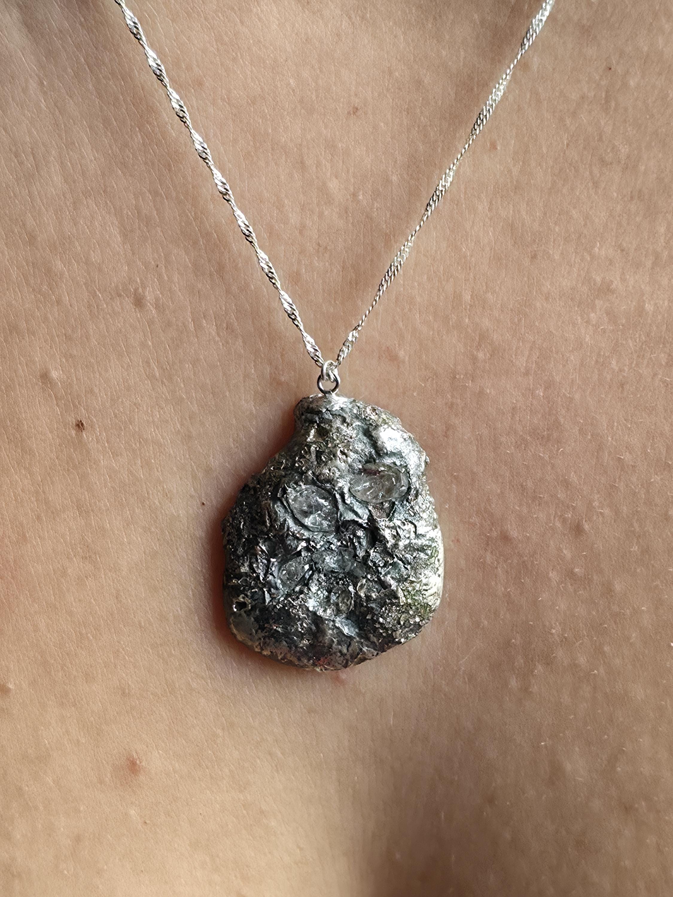 Handmade by Decazi in the Netherlands, this Herkimer diamond pendant fuses natural crystal into pure silver using a unique molten silver technique. Each pendant is one-of-a-kind. Hangs on a durable 925 sterling silver chain – perfect for crystal lovers and artisan jewelry collectors.