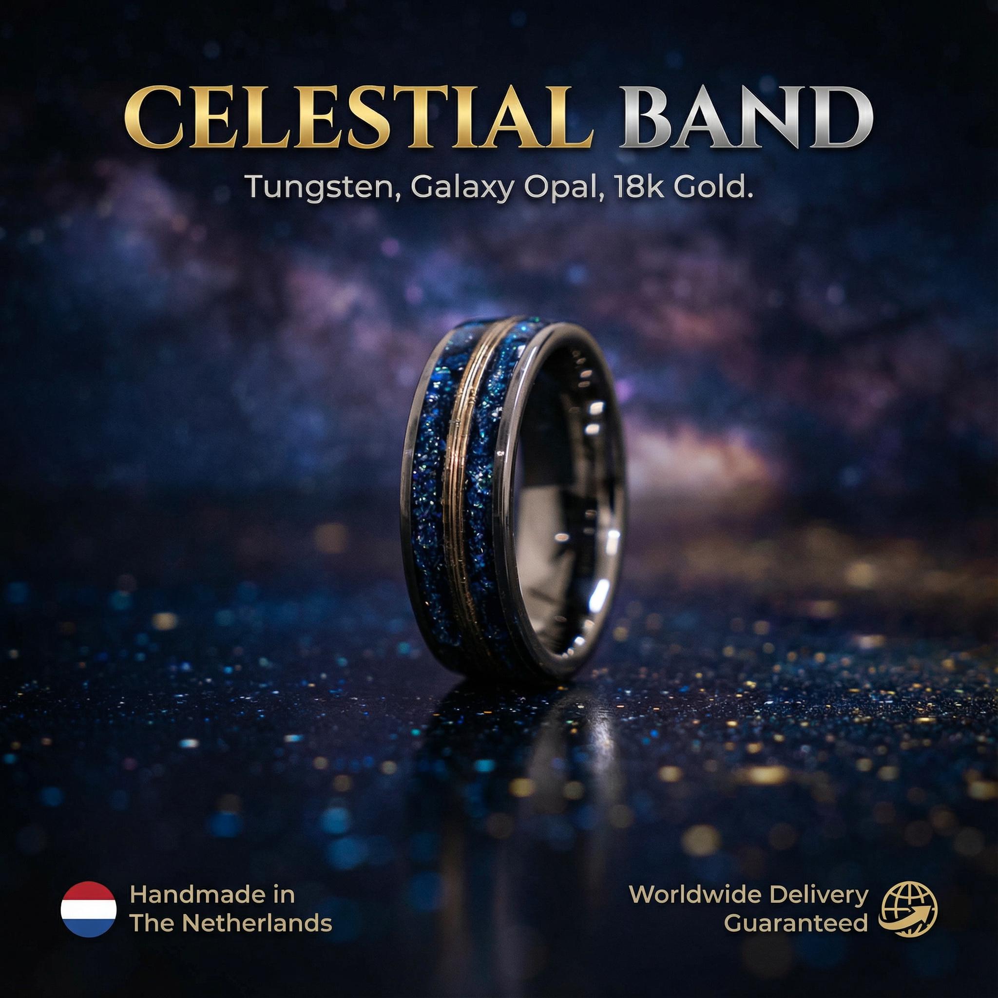 Make a bold and timeless statement with this premium Tungsten Wedding Band, featuring a mesmerizing Galaxy Opal inlay and a refined 18K Gold Wire center accent.