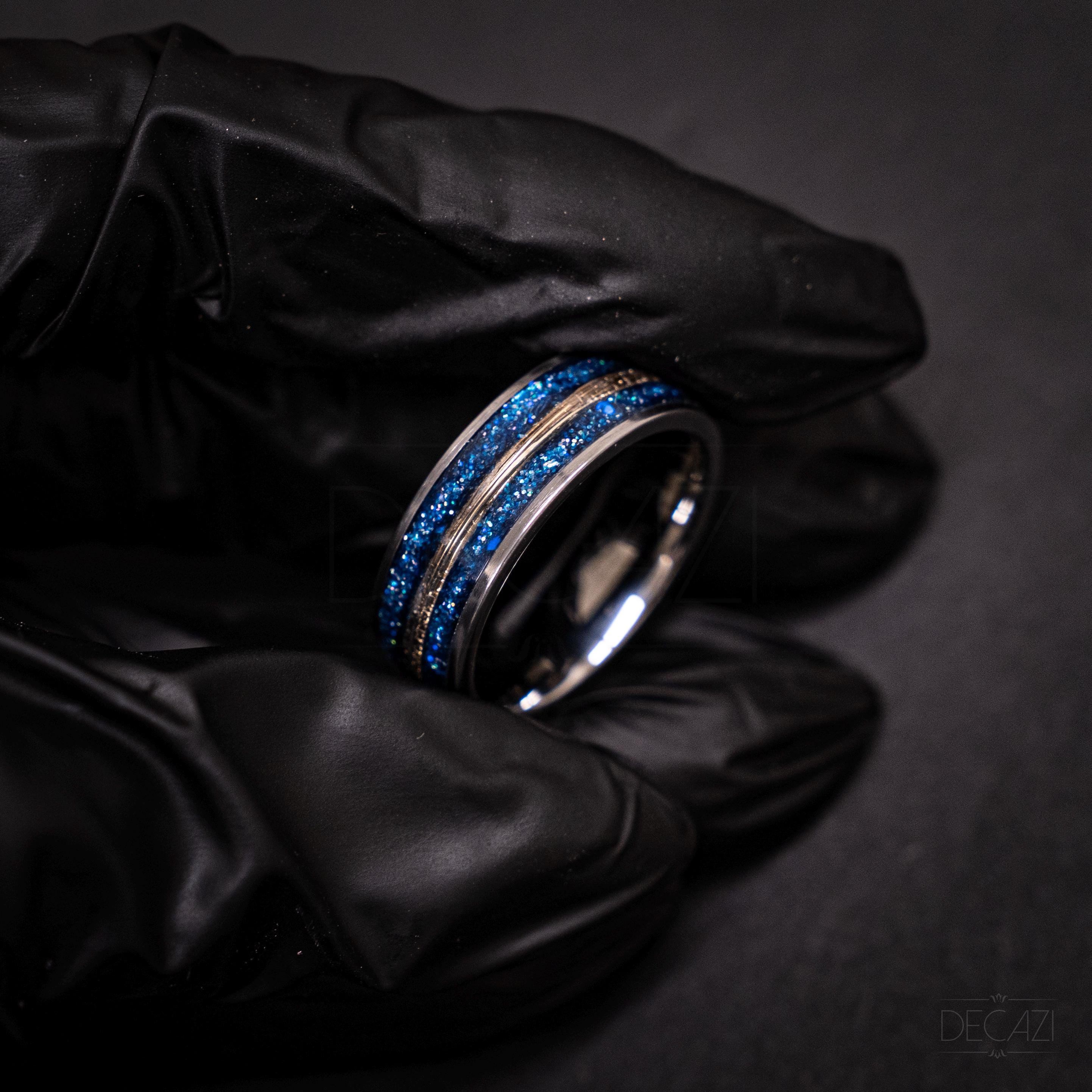 Crafted from durable silver-colored tungsten carbide, this ring is designed to last a lifetime. The deep, cosmic colors of the galaxy opal shimmer beautifully under light, while the 18K gold wire inlay adds a luxurious contrast and elegant detail.