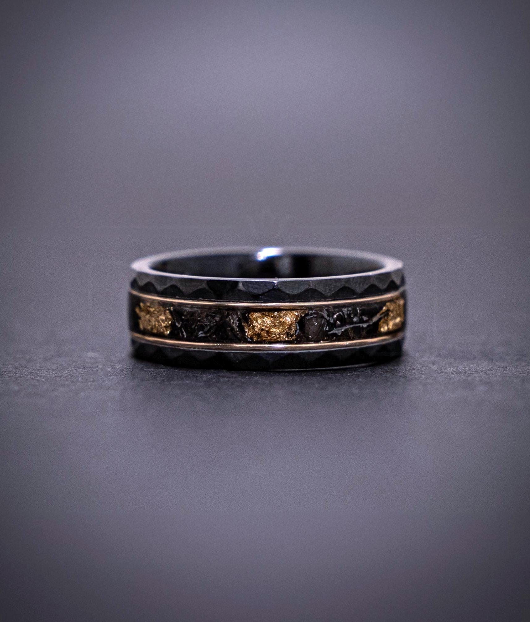 This black ceramic ring (8mm) features a hammered edge and an extraordinary inlay of Muonionalusta meteorite shavings blended with pure 24K yellow gold leaf, framed by two 18K yellow gold wires.