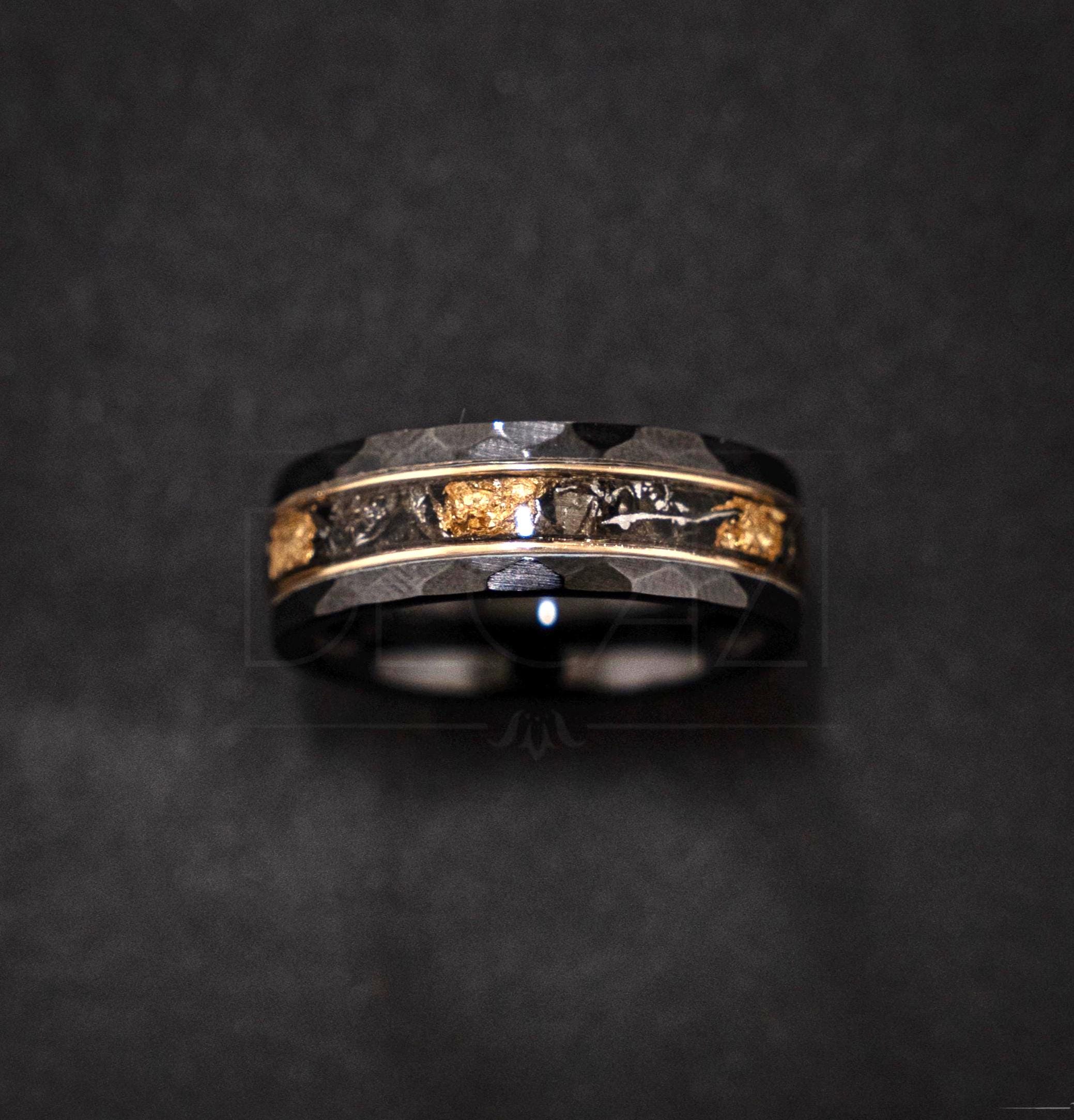 Black Ceramic Wedding Band 8mm – Muonionalusta Meteorite + 24K Gold Leaf Inlay – Hammered Edge – 18K Gold Wire – Comfort Fit